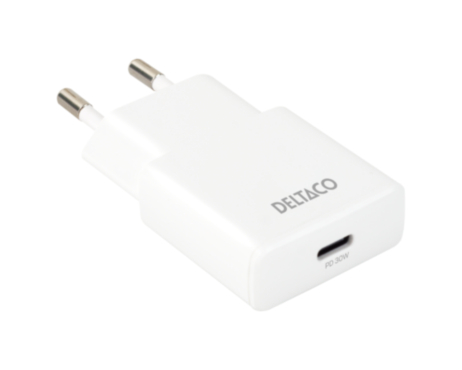 30W USB-C Wandladegerät ist ein schlankes Wandladegerät von Deltaco. Es verfügt über einen USB-C PD-Anschluss mit einer maximalen Leistung von 30 W und unterstützt PPS-Ladung, was bedeutet, dass es Strom und Spannung anpassen kann, um effizienteres Laden von kompatiblen Geräten zu ermöglichen. Das schlanke Design macht es ideal für Reisen, und seine Effizienz macht es geeignet für Smartphones, Tablets und kleinere Laptops.Das USB-C Wandladegerät kombiniert Power Delivery-Technologie mit PPS (Programmable Power Supply), was bedeutet, dass es den Ladezustand kontinuierlich aktualisiert und Strom sowie Spannung anpasst. Es verfügt über mehrere Ausgangsniveaus: 5 V / 3 A, 9 V / 3 A, 12 V / 2.5 A, 15 V / 2 A und 20 V / 1.5 A, was hohe Flexibilität zum Laden verschiedener Gerätetypen bietet. Wenn es in einer 110 V-Steckdose verwendet wird, beträgt die maximale Leistung 20 W. Das Gerät wurde entwickelt, um die Wärmeentwicklung während des Ladevorgangs zu minimieren, was dazu beiträgt, die Lebensdauer des Akkus der geladenen Geräte zu verlängern.