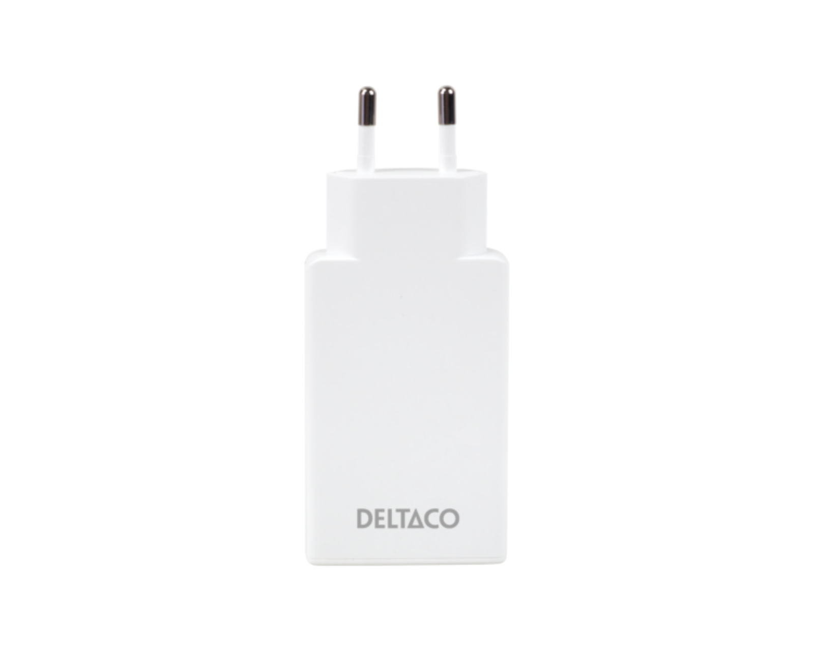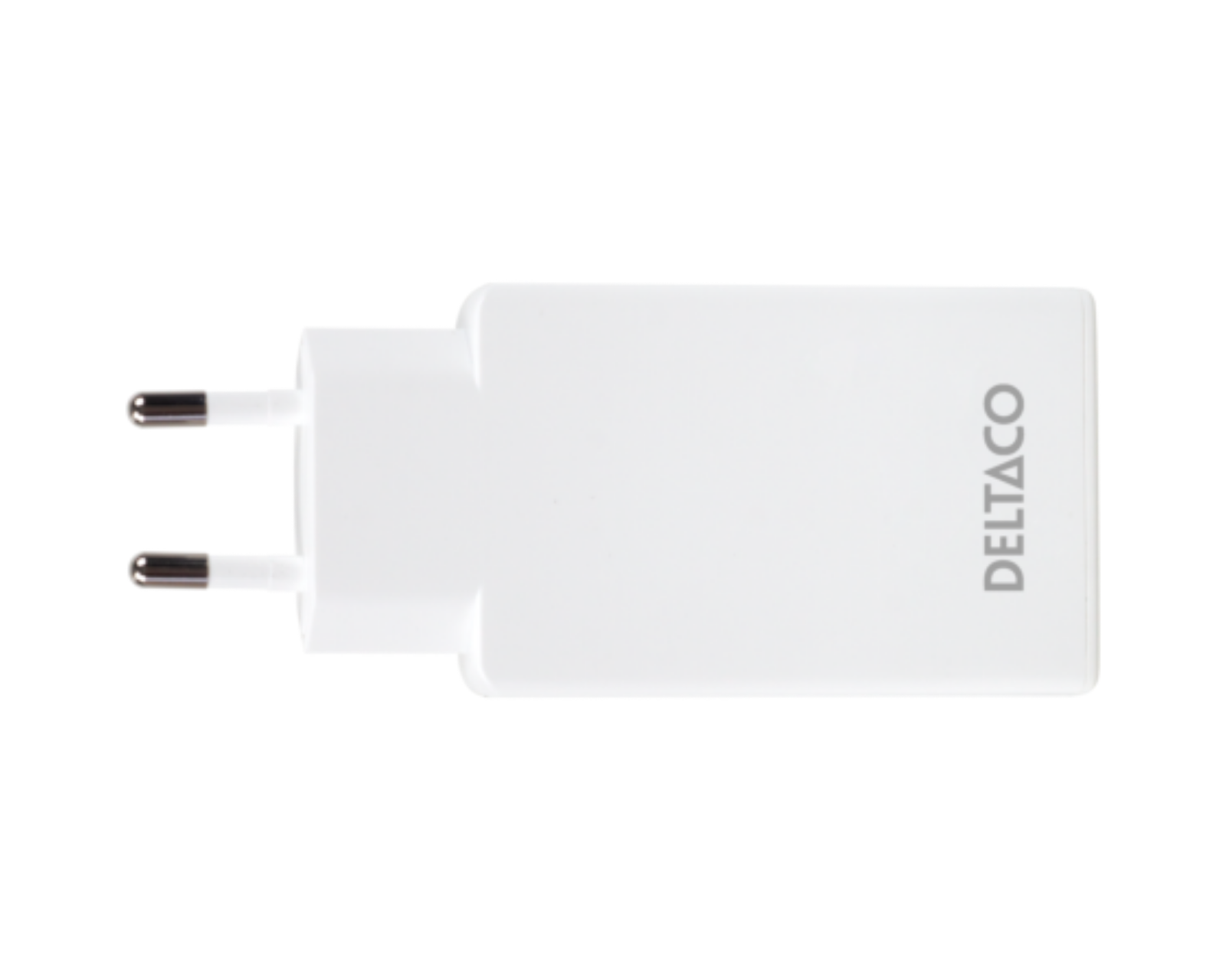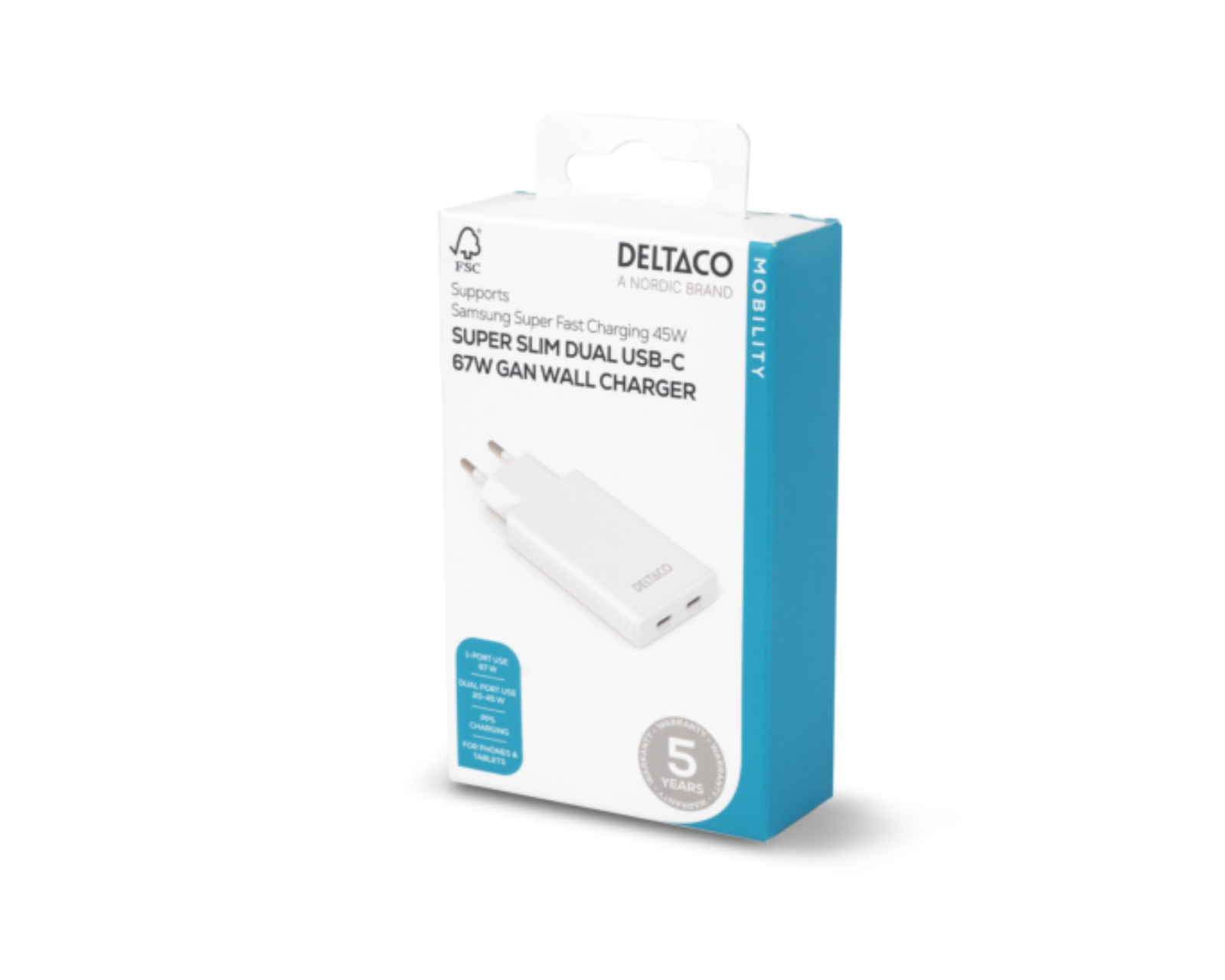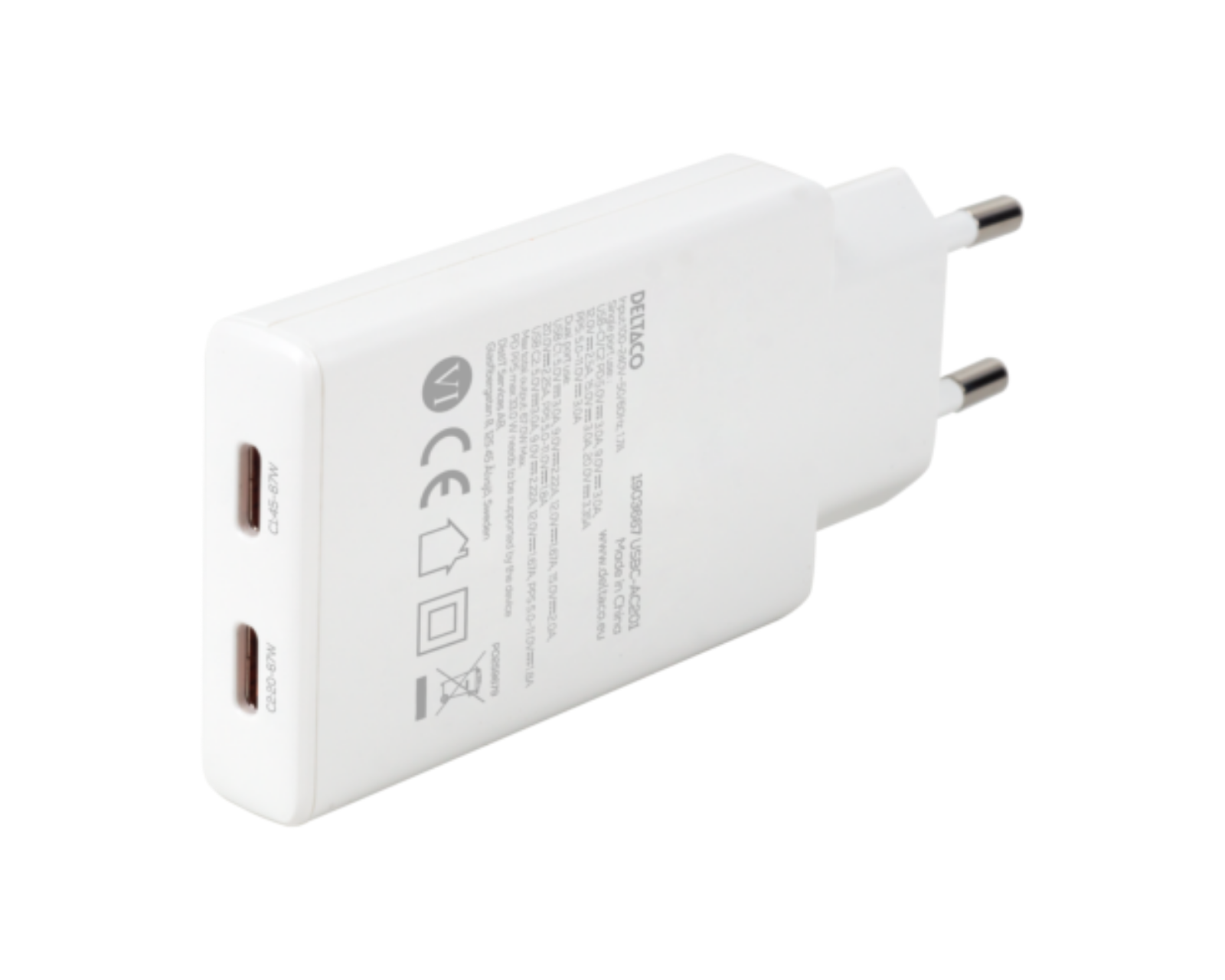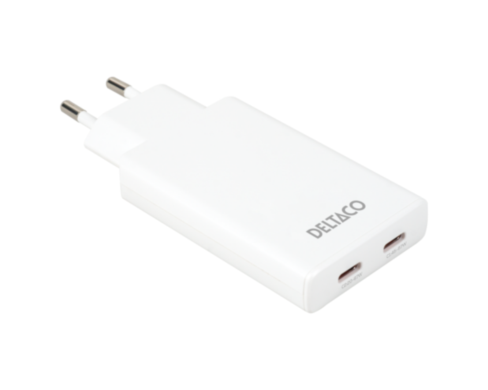 67W 2x USB-C Wandladegerät ist ein Wandladegerät von Deltaco, das schnelles und effizientes Laden mit einer Gesamtleistung von 67 W bietet. Es ist mit zwei USB-C PD-Anschlüssen ausgestattet, was es für das Laden von Smartphones, Tablets und Laptops geeignet macht. Die Anschlüsse können einzeln oder gemeinsam verwendet werden, was Flexibilität bei den Ladeoptionen ermöglicht.Das Ladegerät unterstützt PPS-Laden, das Strom und Spannung in Echtzeit basierend auf dem Ladezustand des Geräts optimiert. Wenn ein Anschluss verwendet wird, kann er bis zu 67 W liefern, und wenn beide Anschlüsse verwendet werden, beträgt die maximale Leistung 45 W für Anschluss C1 und 20 W für Anschluss C2. Das schlanke Design des Ladegeräts macht es perfekt für Reisen und es wird vorausgesetzt, dass das zu ladende Gerät PPS für optimale Ergebnisse unterstützt.