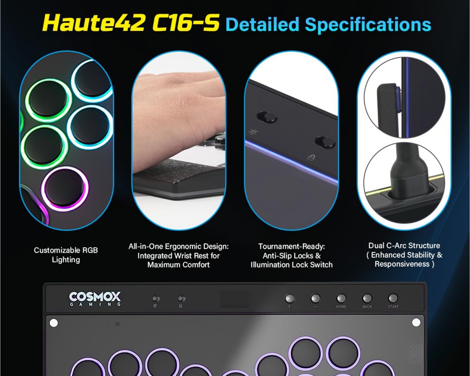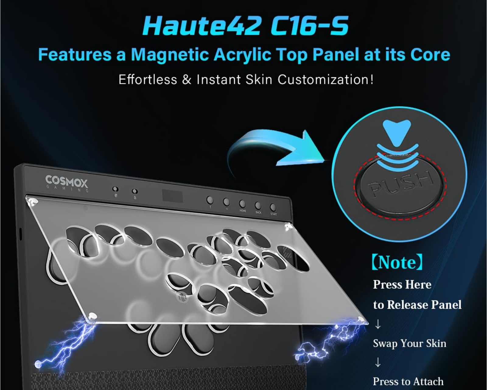 Haute42 C16-S Arcade Controller ist ein revolutionärer Spielcontroller, der modernes Design mit fortschrittlicher Technik kombiniert. Mit einem einzigartigen magnetischen Panelkonzept kann der Benutzer sein Spielerlebnis ganz einfach anpassen, ohne dass Schrauben erforderlich sind.Das ergonomische Design des C16-S und die RGB-Ringsbeleuchtung um die Tasten bieten sowohl visuelle Anziehungskraft als auch praktische Funktionalität. Im Lieferumfang sind auch Kunstvorlagen für die persönliche Anpassung sowie ein Turnierschloss enthalten, um unerwünschte Tastenanschläge während intensiven Spielens zu verhindern. Mit einer ultra-niedrigen Latenz von weniger als 1 ms und Unterstützung für Firmware-Updates garantiert es ein stabiles und zuverlässiges Spielerlebnis.