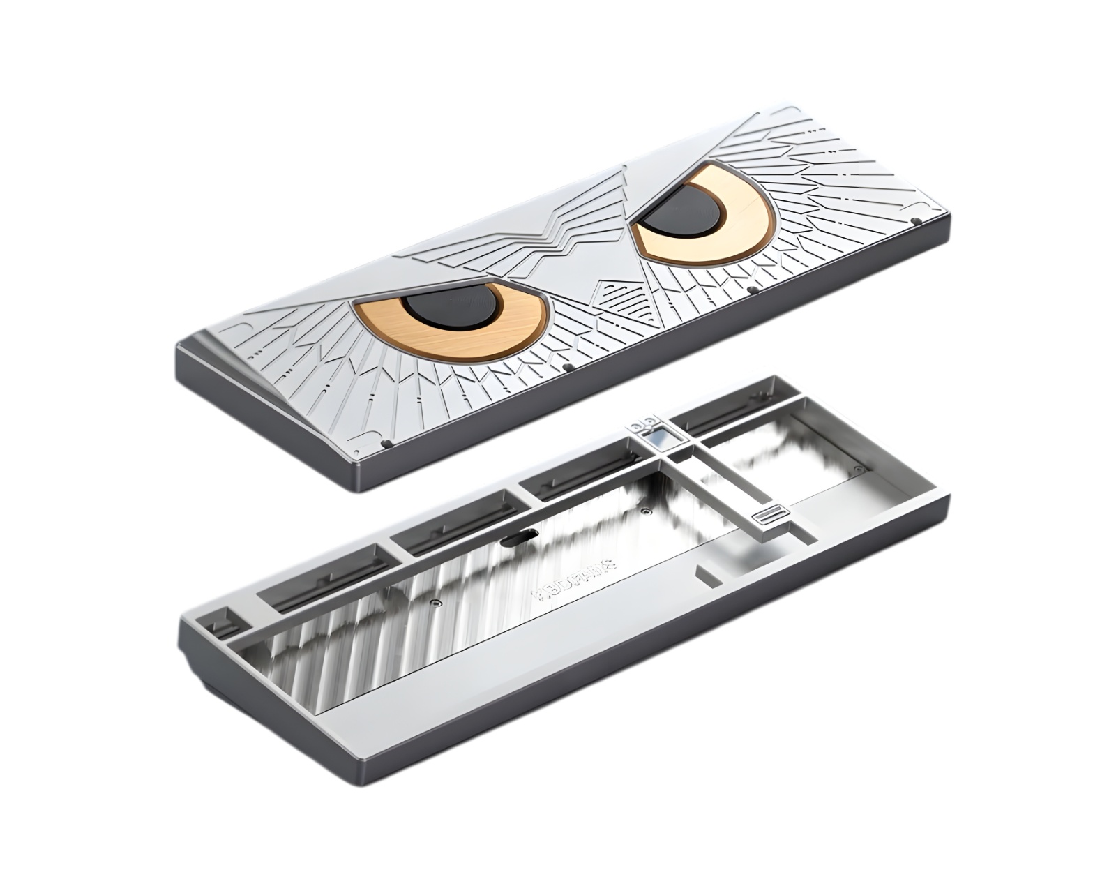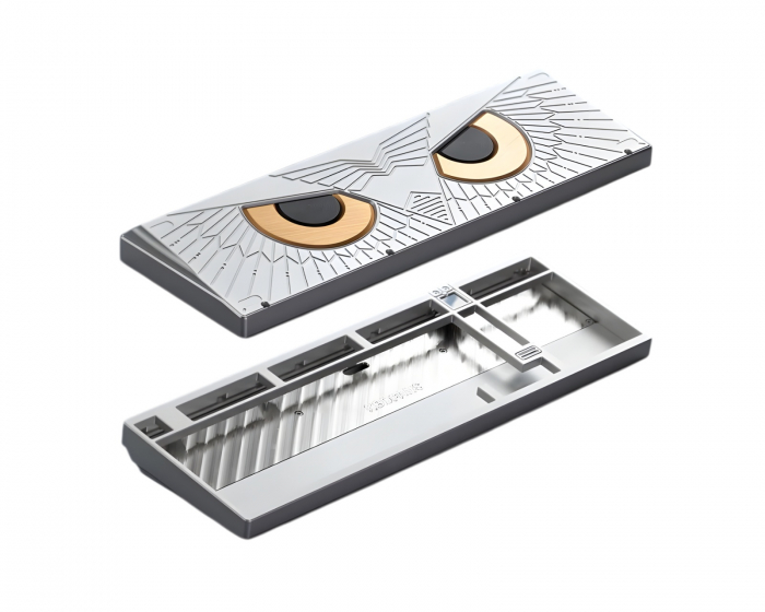 Athena 1800 ist ein mechanisches Barebone-Tastatur-Barebone von KBDfans, das Technologie und Design kombiniert. Es verfügt über ein modernes 1800-Layout mit einem LED-Bildschirm, der Anpassungen wie GIF-Animationen ermöglicht. Die Tastatur richtet sich an Enthusiasten mit höheren Ansprüchen an sowohl das Schreiberlebnis als auch die Ästhetik.Die Tastatur hat eine solide Verarbeitungsqualität aus eloxiertem Aluminium und wird mit verschiedenen Optionen für Innenteile angeboten, die Edelstahl, Messing und Kohlenstofffaser umfassen. Es gibt weitere Montagemöglichkeiten wie Top-Mount und PCB-Silikongummi-Lager, die entweder ein festes und direktes Tippgefühl oder ein gedämpftes und schallisoliertes Gefühl bieten. Das Design umfasst auch ein sorgfältig graviertes Eulenmotiv auf der Rückplatte sowie einen Lichtdiffusor, der eine subtile Hintergrundbeleuchtung erzeugt.