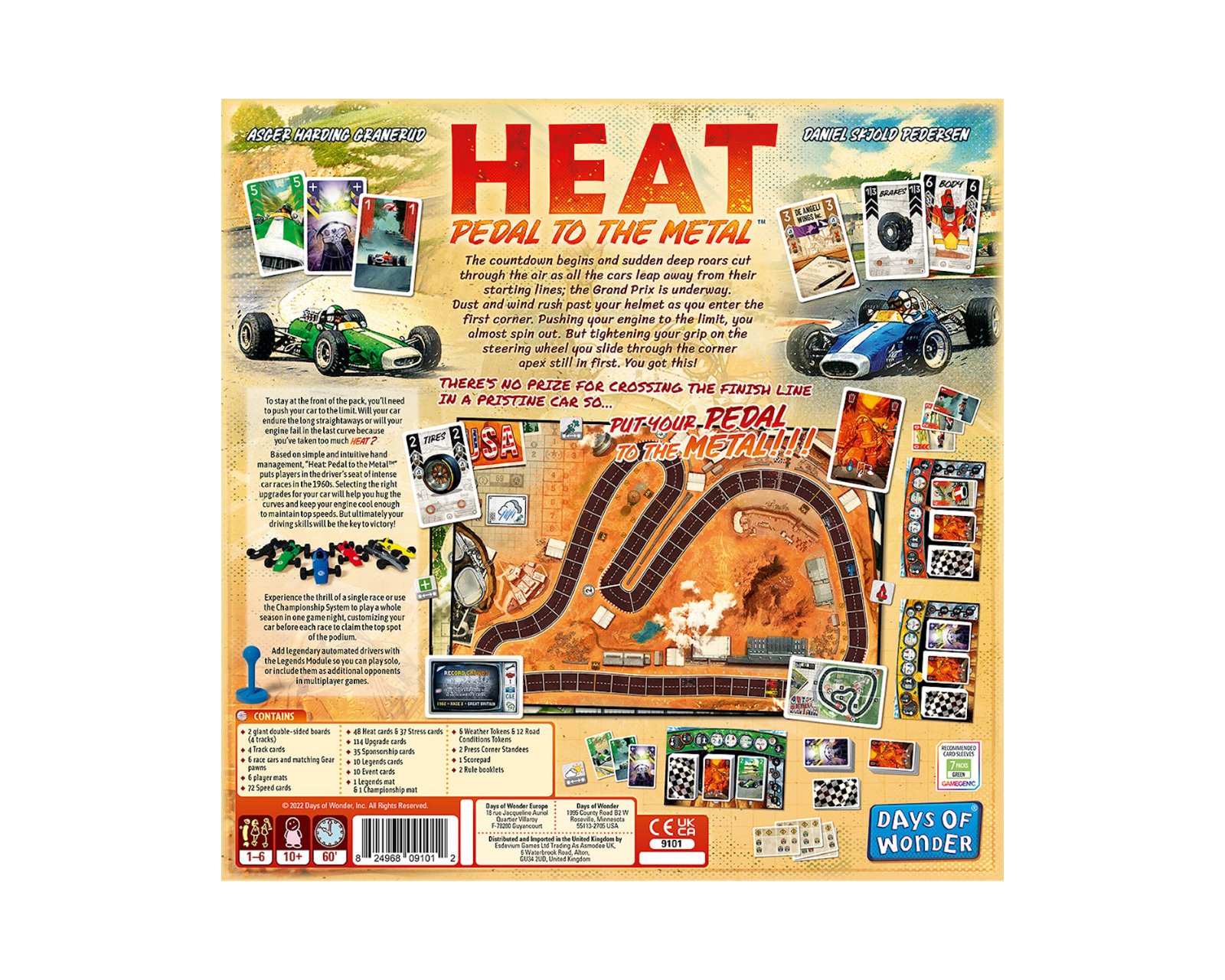 HEAT ist ein Brettspiel, das eine einfache und intuitive Nutzung von Karten bietet und die Spieler während chaotischer Autorennen, die in den 1960er Jahren stattfanden, ins Fahrerhaus versetzt. Die Spieler können zwischen Einzelrennen oder Meisterschaftsregeln wählen, um die gesamte Saison zu spielen, und jedes Rennen erfordert strategische Verbesserungen des Autos, um Kurven zu meistern und den Motor kühl zu halten, was entscheidend ist, um Höchstgeschwindigkeit zu erreichen. Das Spiel ist für 1-6 Spieler konzipiert, was ein flexibles Spielerlebnis ermöglicht, egal ob man allein oder mit anderen spielt.Die Details der Spielkomponenten sind sorgfältig gestaltet, um ein authentisches Spielerlebnis zu schaffen. Die Fahrzeugkarten repräsentieren verschiedene Fahrzeuge aus den 1960er Jahren und kommen mit spezifischen Eigenschaften, die die Dynamik des Spiels beeinflussen. Durch die Implementierung legendärer automatisierter Fahrer über das Legends-Modul hat der Spieler die Möglichkeit, seine Spielstrategie und Wettbewerbsfähigkeit zu erweitern, wodurch es unzählige Möglichkeiten gibt, die Taktik anzupassen.