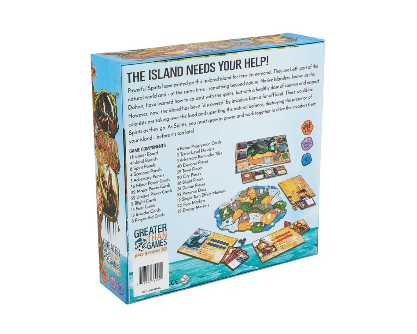Spirit Island ist ein kooperatives Brettspiel, das darin besteht, deine Insel vor kolonialen Eindringlingen zu verteidigen. Das Spiel bietet jedem Spieler die Möglichkeit, verschiedene Geister des Landes zu kontrollieren, von denen jeder einzigartige elementare Kräfte hat. Die Spieler wählen gleichzeitig, welche Kraftkarten sie in jeder Runde spielen möchten, wobei diese Energie kosten. Durch die Kombination von Kraftkarten, die den elementaren Affinitäten eines Geistes entsprechen, können die Spieler Bonusfähigkeiten erhalten. Schnelle Kräfte werden sofort ausgeführt, bevor sich die Eindringlinge ausbreiten, während andere Zauber mehr Planung erfordern. In der Geisterphase erhalten die Geister Energie und wählen, wie sie wachsen, entweder indem sie verwendete Kraftkarten zurückgewinnen, neue Kräfte suchen oder ihre Präsenz auf neue Gebiete der Insel ausdehnen.Die Eindringlinge expandieren auf der Karte in einem teilweise vorhersehbaren Muster. In jeder Runde erkunden sie verschiedene Teile der Insel, bauen Siedlungen und Städte und verursachen Blight, wenn sie einheimische Bewohner angreifen. Die Geister kämpfen zurück gegen die Eindringlinge und schützen die Insel. Die Komplexität des Spiels nimmt im Laufe der Zeit zu und bietet verschiedene Schwierigkeitsgrade, mit einer Reihe unterschiedlicher Gegner, gegen die man kämpfen kann.