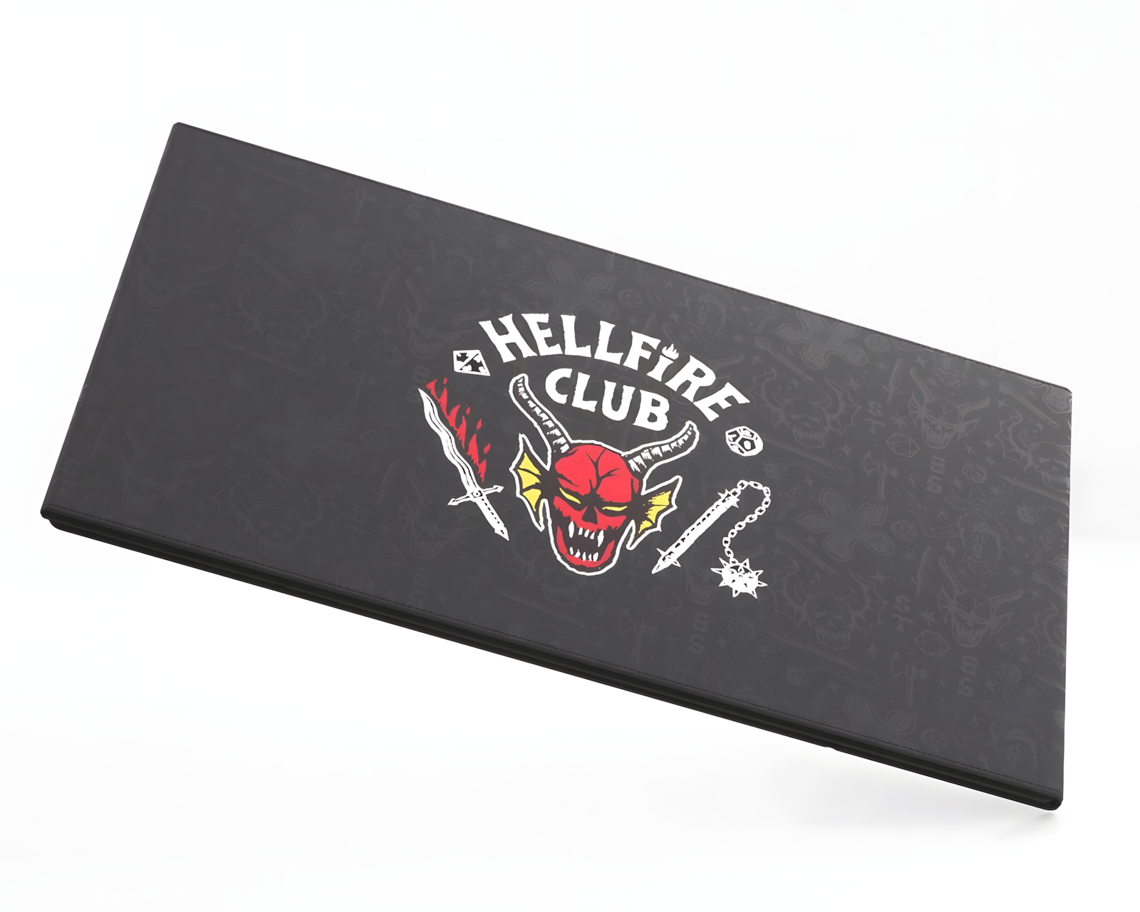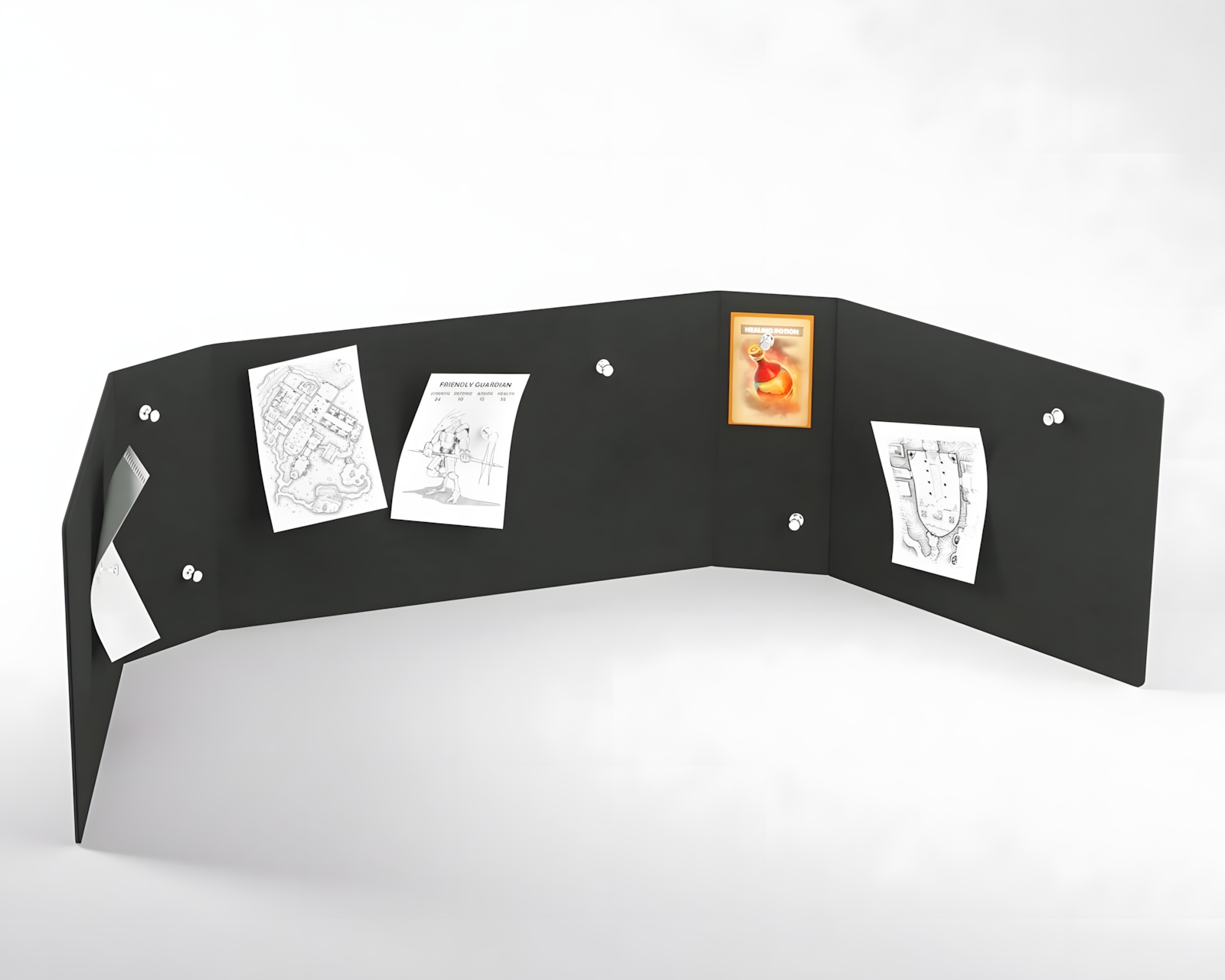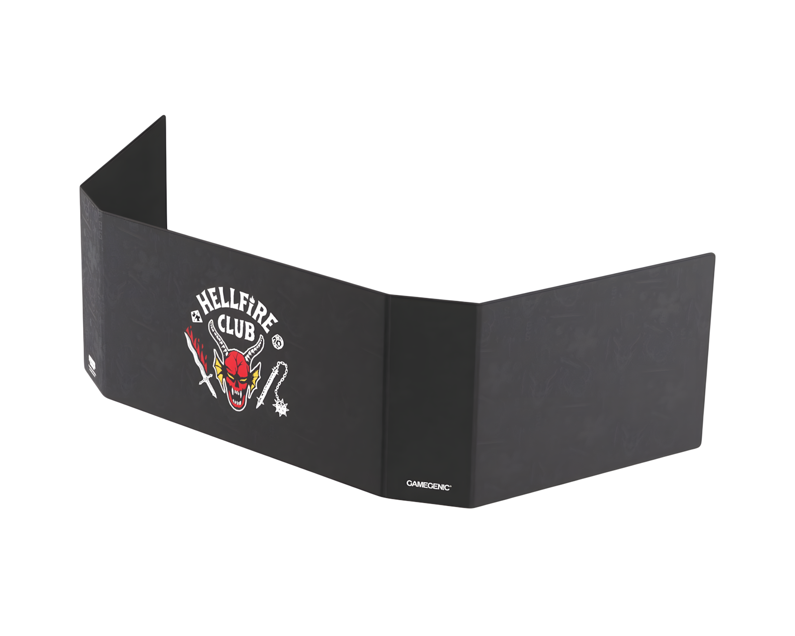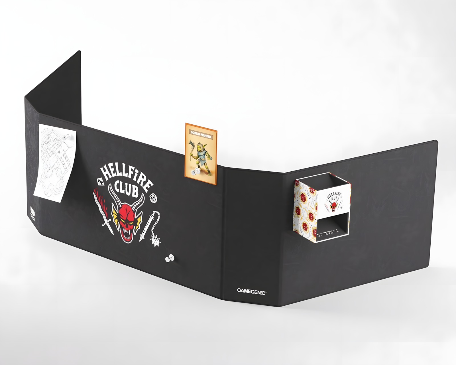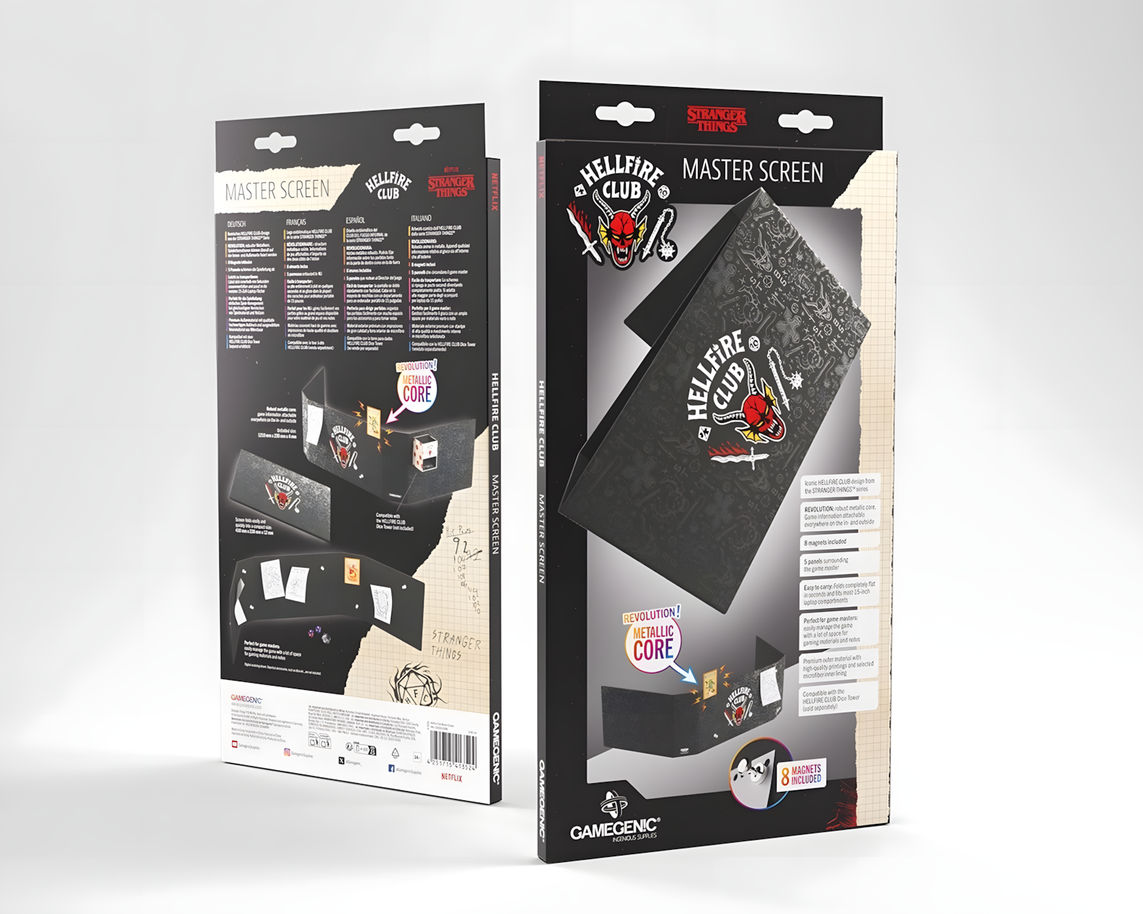 Hellfire Club Master Screen ist ein Spielaccessoire aus der Stranger Things™-Serie. Es hat ein ikonisches Design und bietet eine robuste Konstruktion mit einem metallischen Kern. Der Master Screen ist mit 8 Magneten ausgestattet, die Spielinformationen sowohl innen als auch außen am Screen befestigen können. Er ist besonders nützlich für Game Master, die Spielmaterial und Notizen während des Spiels verwalten.Der Screen ist einfach zu transportieren, da er in wenigen Sekunden komplett flach gefaltet werden kann und in die meisten 15-Zoll-Laptops passt. Das Produkt ist aus Nexofyber+ Oberfläche hergestellt und hat eine Mikrofaserschicht im Inneren. Dies führt zu einer langlebigen und hochwertigen Konstruktion. Wenn der Screen ausgeklappt ist, hat er eine Größe von 1210 x 230 x 4 mm und bietet viel Platz zur Organisation von Spielmaterial. Er kann zusammen mit dem HELLFIRE CLUB Dice Tower verwendet werden, der separat verkauft wird. Die Verpackung erfolgt in einer Kartonage, die Schutz während des Transports ermöglicht.