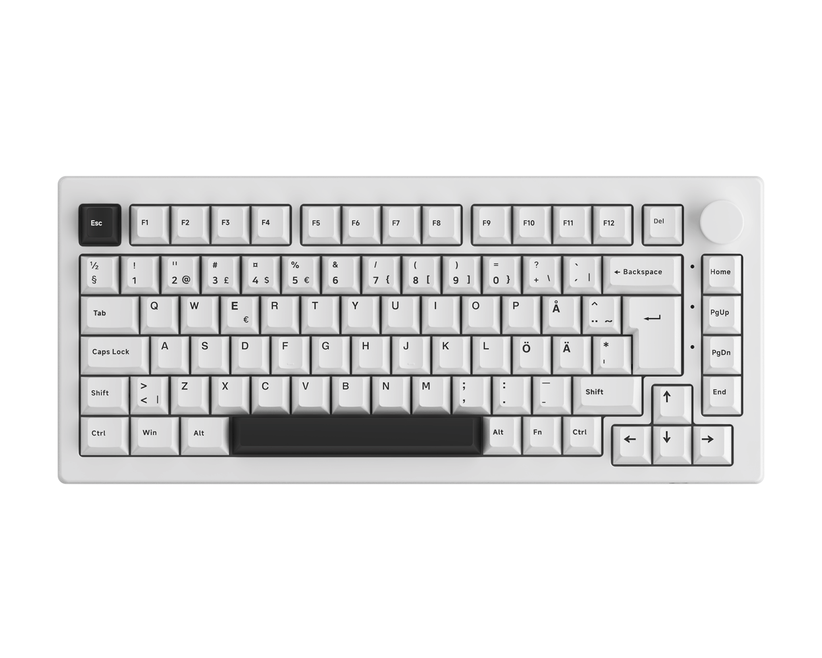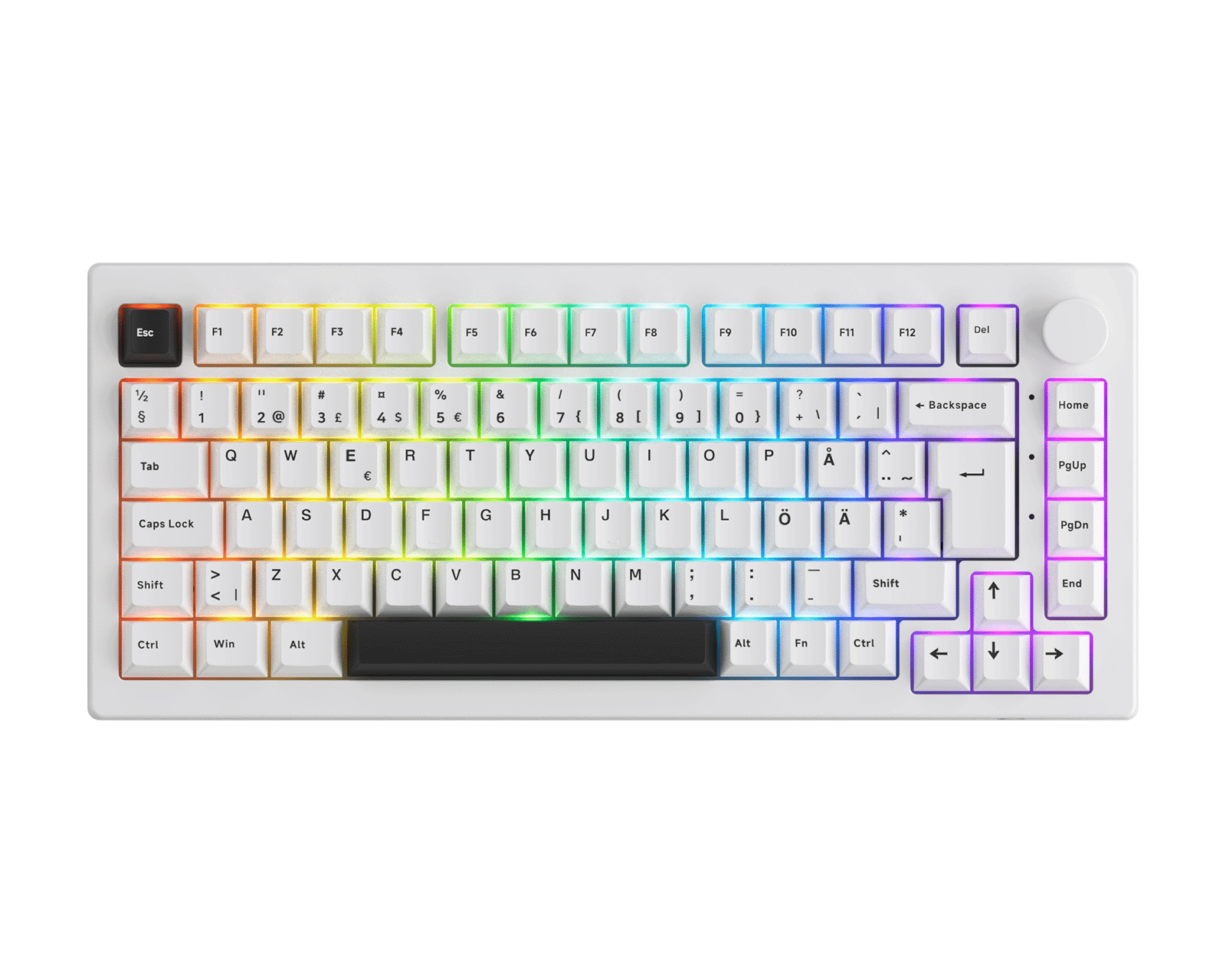 DEMO: Återköp und Testexemplar. Gut erhalten.5075B Plus S Schwarz auf Weiß ist eine fortschrittliche mechanische Tastaturlösung für dich, wenn du Funktion und Stil kombinieren möchtest. Ausgestattet mit RGB-Hintergrundbeleuchtung, Bluetooth 5.0 und hybrider Verbindung über USB-C und kabellosem 2.4G, garantiert es Flexibilität und Anpassung für alle Bedürfnisse. Die Tastatur ist mit dem ergonomischen ISO-Layout aufgebaut und beinhaltet zusätzliche Keycaps für DE, UK und Nordisch.