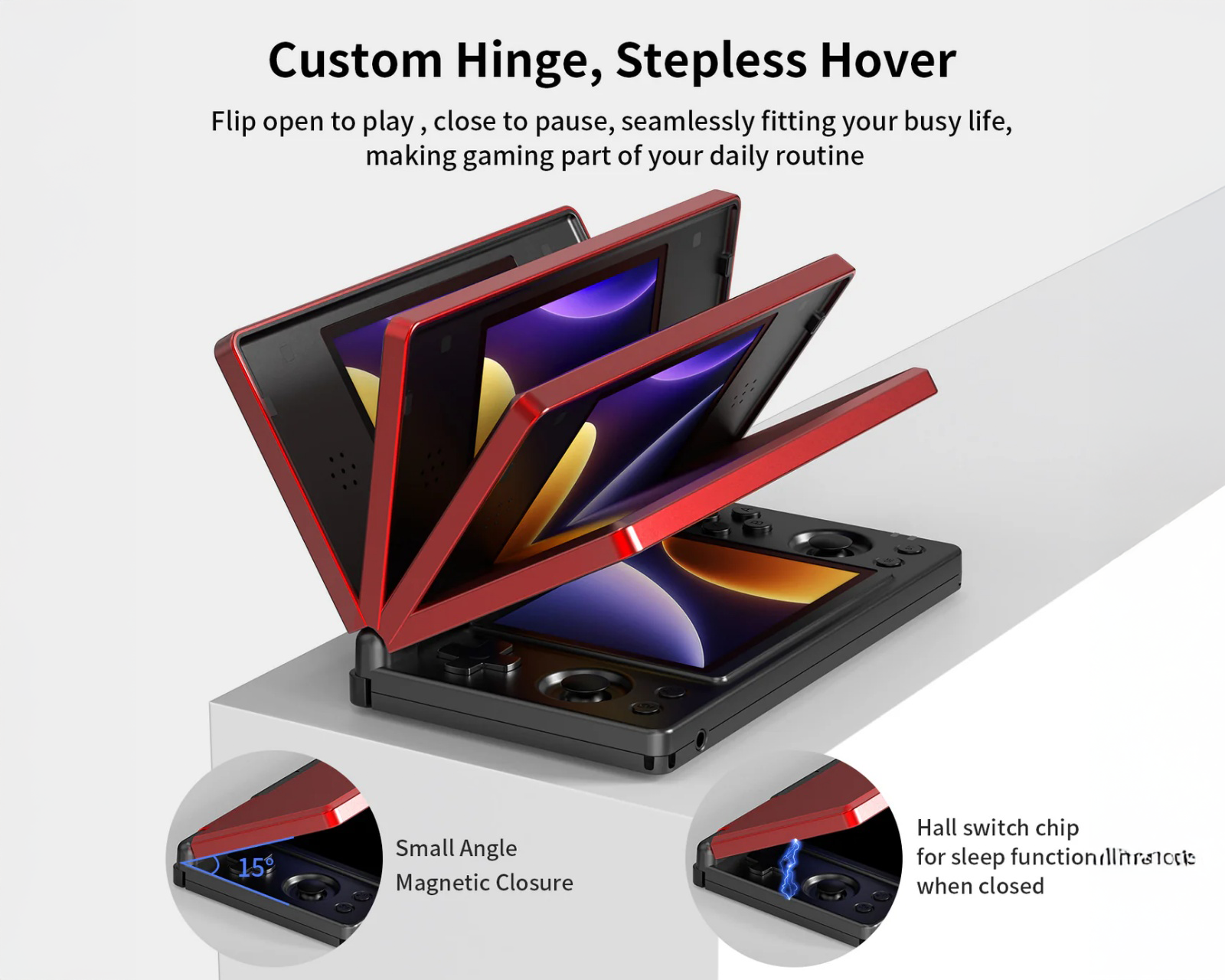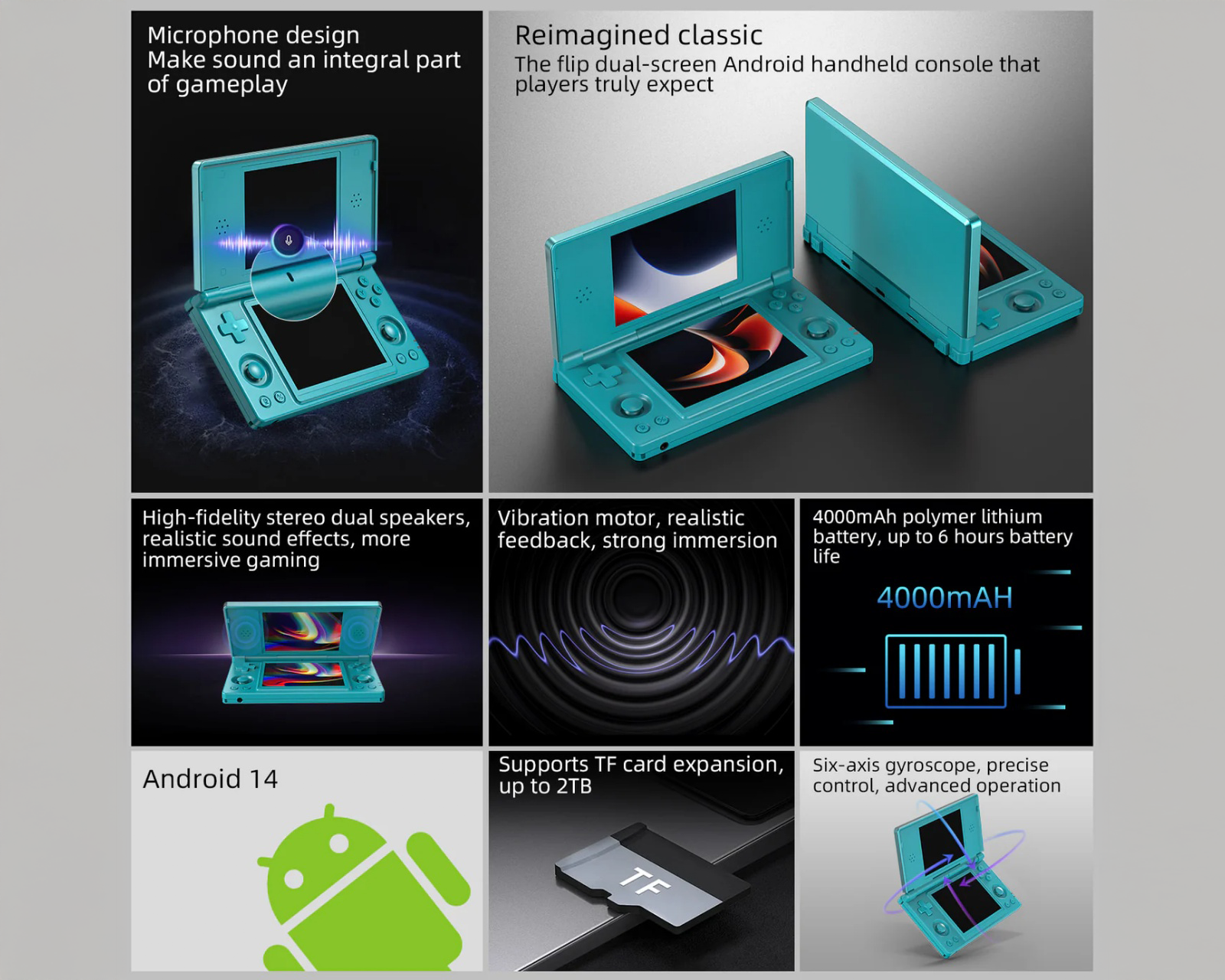 Mit einem RK3568-Prozessor und 3 GB RAM bietet es eine flüssige Emulation von Konsolen wie PS1 und N64. Das Gerät hat ein solides Clamshell-Design und umfasst unter anderem Hall-Sensoren und ein Gyroskop. Der Speicher beträgt 32 GB intern und unterstützt externen Speicher über microSD bis zu 2 TB, was reichlich Platz für Spiele und Anwendungen bietet.
