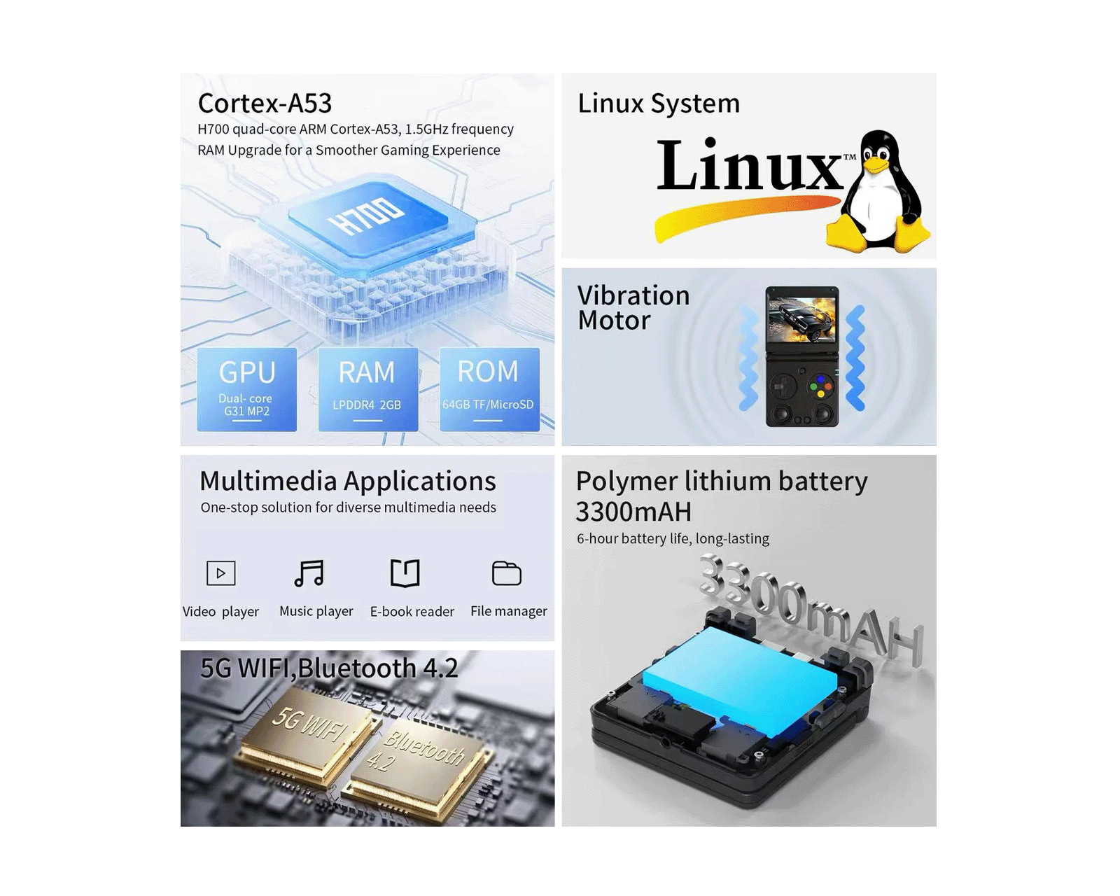 DEMO: Rückkauf und Testexemplar. Guter Zustand.Träumen Sie davon, Ihre Lieblingsspiele der Vergangenheit in einem kompakten und modernen Gerät wiederzuerleben? Der RG34XXSP Retro Emulator ist perfekt für Sie. Mit seinem klassischen Klappdesign und leistungsstarken Funktionen kombiniert diese Retro-Spielkonsole Nostalgie und Innovation auf beeindruckende Weise. Der 3,4 Zoll große IPS-Bildschirm mit vollem Betrachtungswinkel liefert scharfe und brillante Bilder, während der leistungsstarke H700-Prozessor und der doppelte G31 MP2-Grafikprozessor ein reibungsloses Spielerlebnis gewährleisten. Mit dem 64-Bit-Linux-Betriebssystem, WiFi und Bluetooth können Sie problemlos Spiele von über 30 verschiedenen Emulatoren herunterladen und spielen.