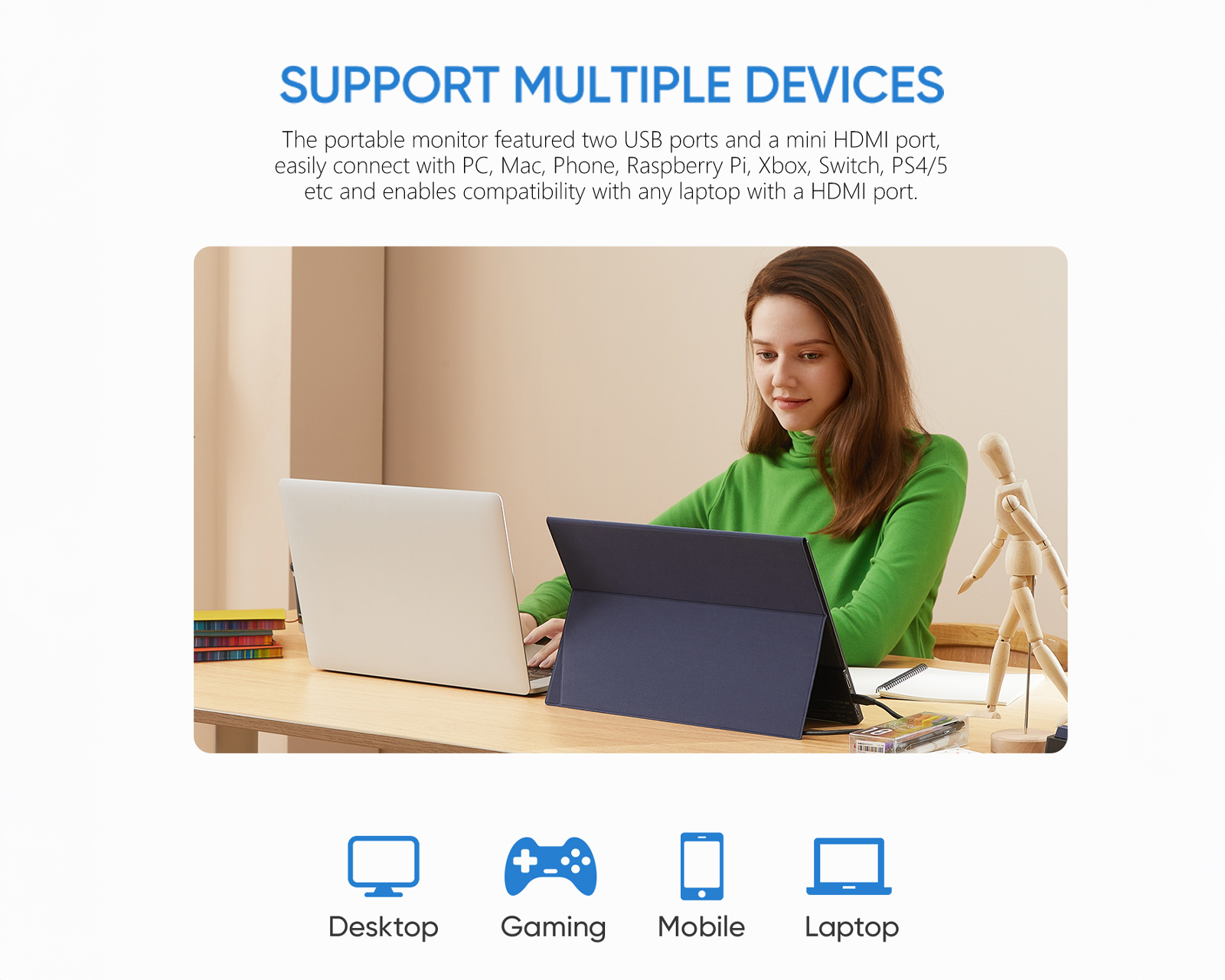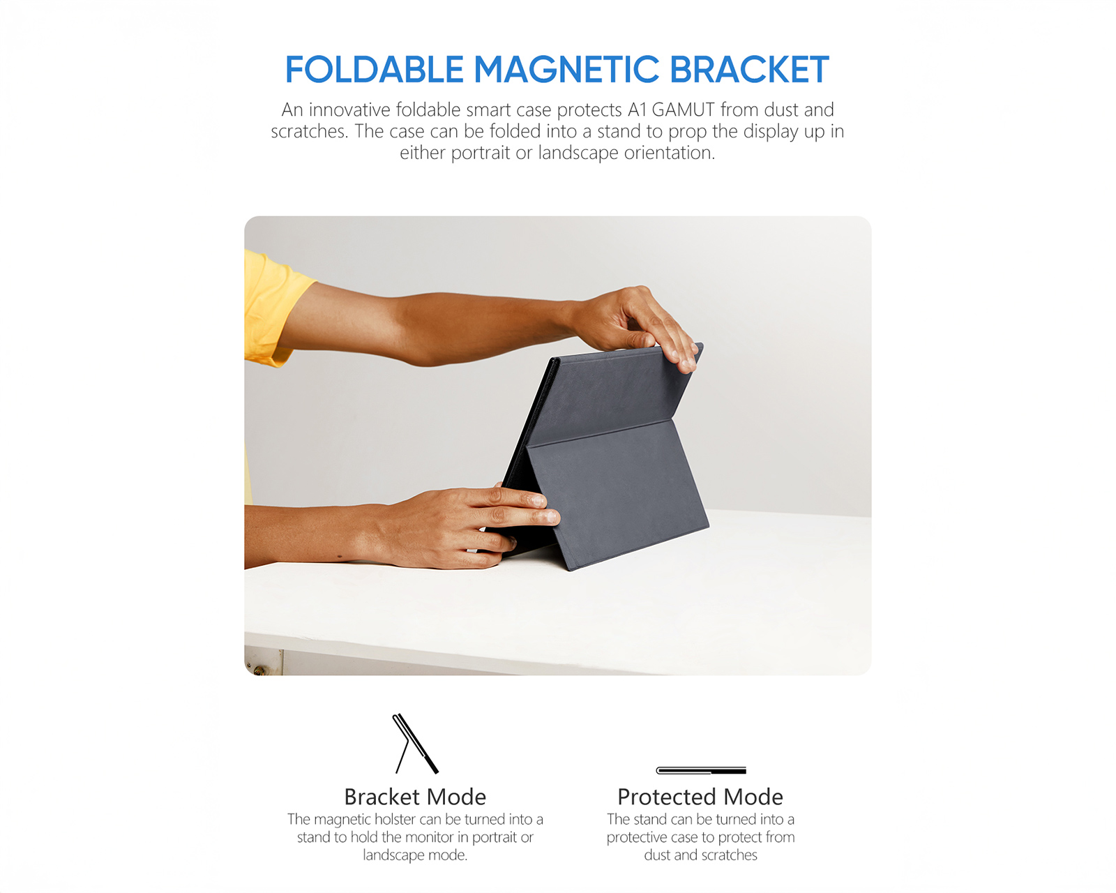 Das Gerät hat ein ultradünnes Profil und eine robuste Bauqualität aus CNC-anodisiertem Aluminium, was es sowohl langlebig als auch leicht transportierbar macht. Für maximale Flexibilität wird es einfach über USB-C oder Mini-HDMI mit Laptops, Mac, Spielkonsolen (PS5/Xbox/Switch) und ausgewählten Mobiltelefonen verbunden. Der Ton wird über doppelte integrierte Lautsprecher wiedergegeben, und es gibt auch einen 3,5 mm Ausgang für Kopfhörer. Die mitgelieferte magnetische Smart-Hülle schützt den Bildschirm während des Transports und dient gleichzeitig als verstellbarer Ständer für den optimalen Betrachtungswinkel.