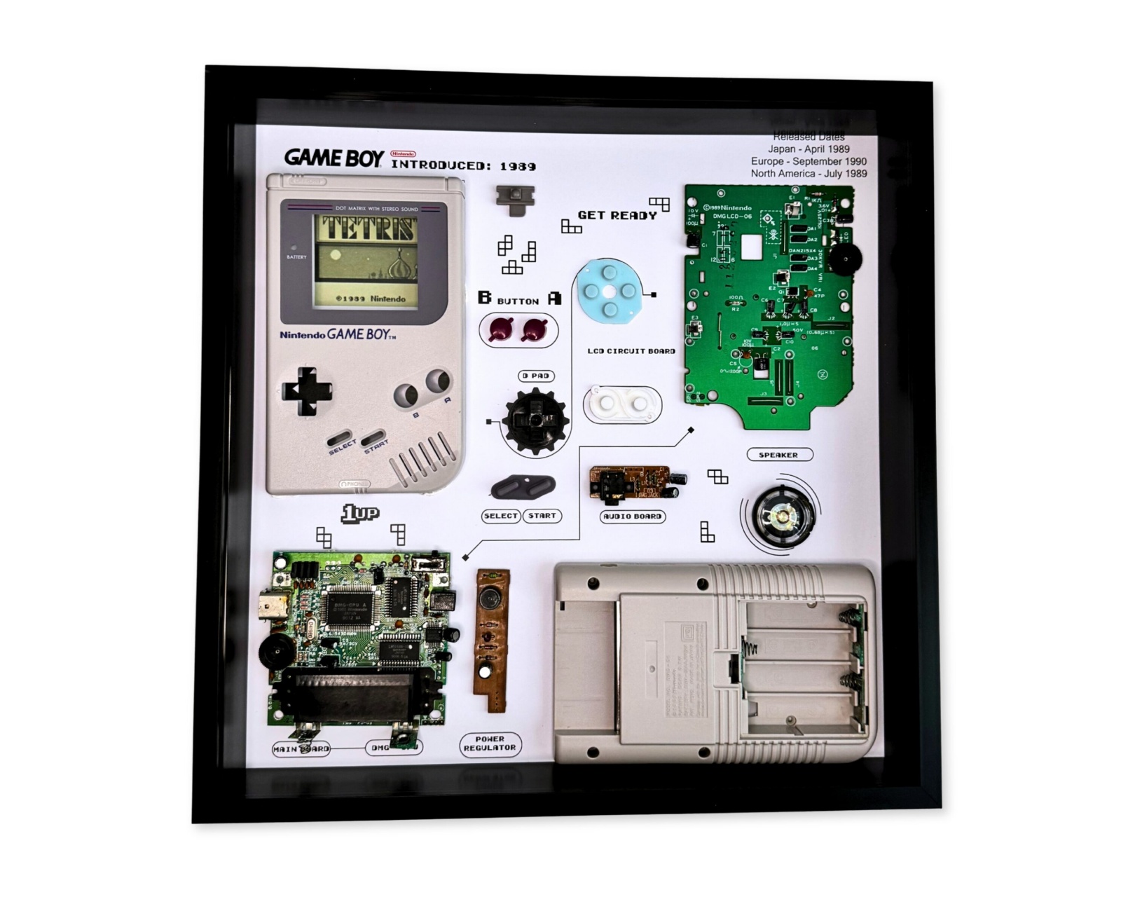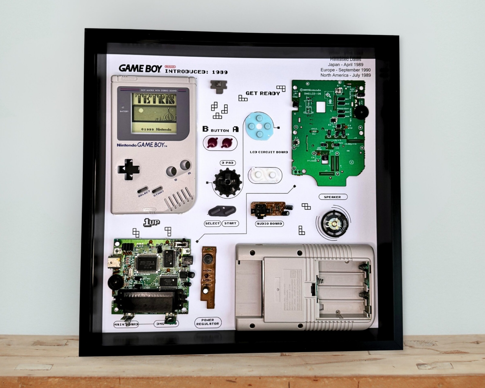 Das Gerät ist aus langlebigen Materialien gefertigt, die eine langfristige Haltbarkeit gewährleisten. Das Design umfasst präzise Maße und eine Verarbeitung, die das historische Gefühl der ursprünglichen Nintendo Gameboy-Konsole umgibt. Das Gerät ist leicht zu installieren und kann auf einem Regal oder in einem Spielzimmer platziert werden, was eine attraktive Display-Lösung für Konsolenliebhaber schafft. Es wurde auch geschaffen, um den ursprünglichen Stil der Konstruktion und das ikonische Aussehen des Gameboy zu bewahren.