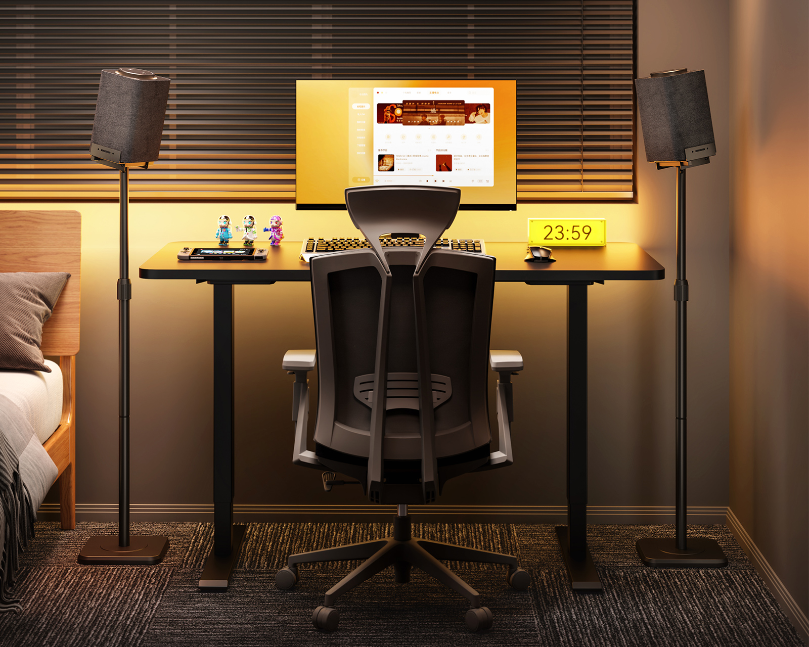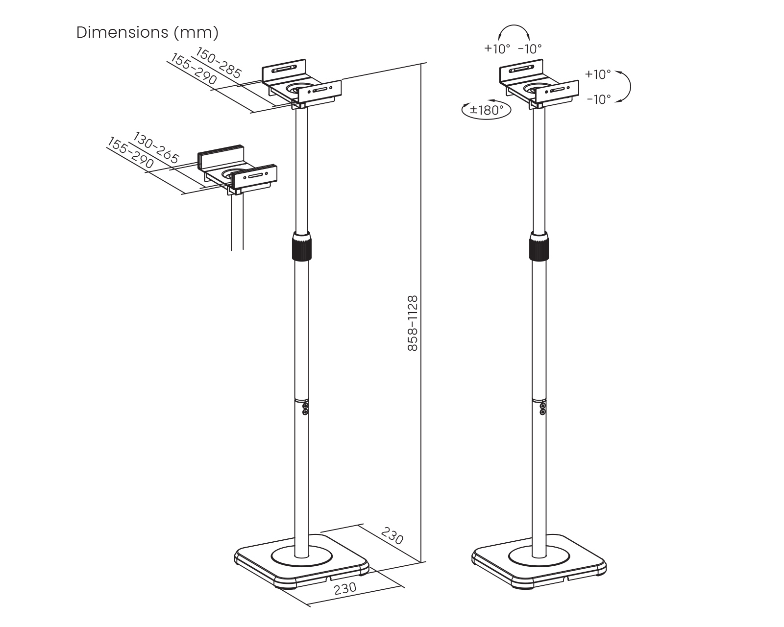 Genießen Sie Präzision mit einer um 360° drehbaren Plattform, die sich horizontal und vertikal um 10° neigen lässt. So liefern Ihre Lautsprecher genau den Klang, den Sie sich wünschen. Benötigen Sie optimale Klanganpassung? Die stufenlose Höhenverstellung von 858 mm bis 1128 mm platziert Ihre Lautsprecher perfekt auf Ohrhöhe für ein intensives Hörerlebnis. Für ein aufgeräumtes Setup verfügt MaxMount über ein integriertes Kabelmanagementsystem, das Kabel diskret verbirgt und organisiert und so für Ordnung sorgt.