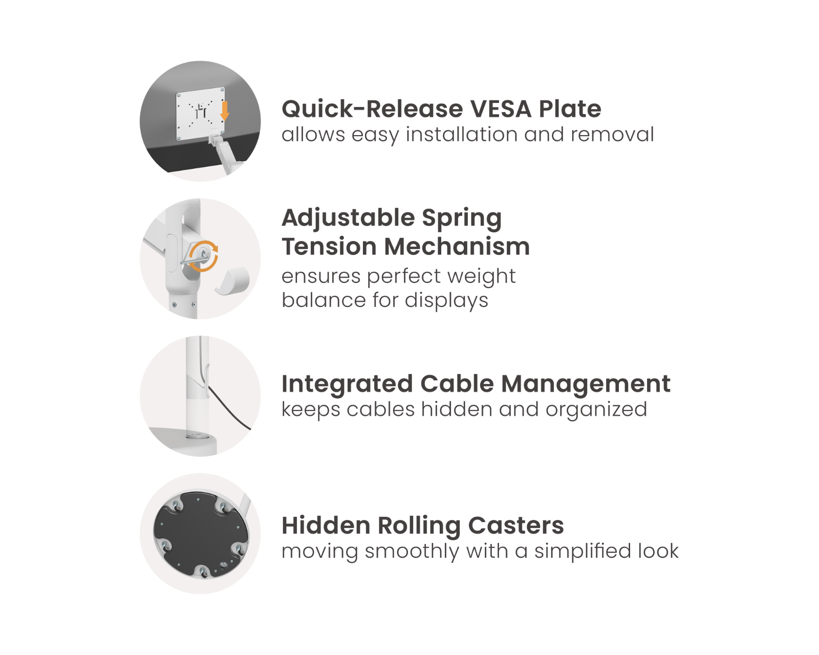 Der Ständer ist aus einer Kombination von Aluminium, Stahl und Kunststoff gefertigt, was eine robuste Konstruktion bei gleichzeitig leichter Beweglichkeit ermöglicht. Die Maße betragen 410x410x1222 mm, mit einer Gewichtskapazität von 5 bis 17 kg. Er hat ein freies Neigungsdesign mit einem Neigungswinkel von +75° bis -45°, sowie Schwenkmöglichkeiten von +20° bis -20° und Rotationskapazität von -180° bis +180°. Eingebaute Federn ermöglichen eine Anpassung des Gewichts und versteckte Rollen in der Basis sorgen für eine reibungslose Bewegung. Der Ständer verfügt außerdem über ein Kabelmanagementsystem, um die Kabel organisiert zu halten.