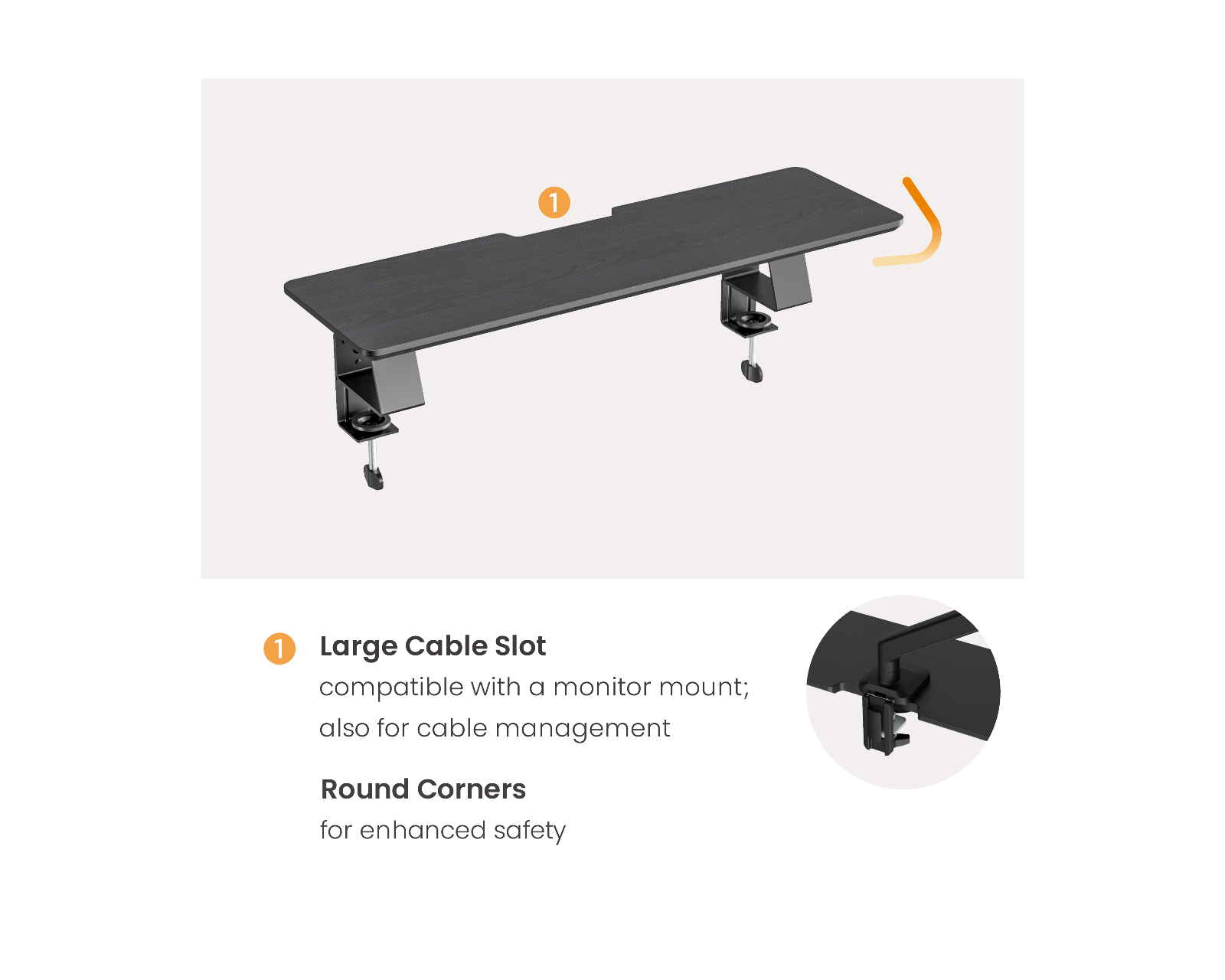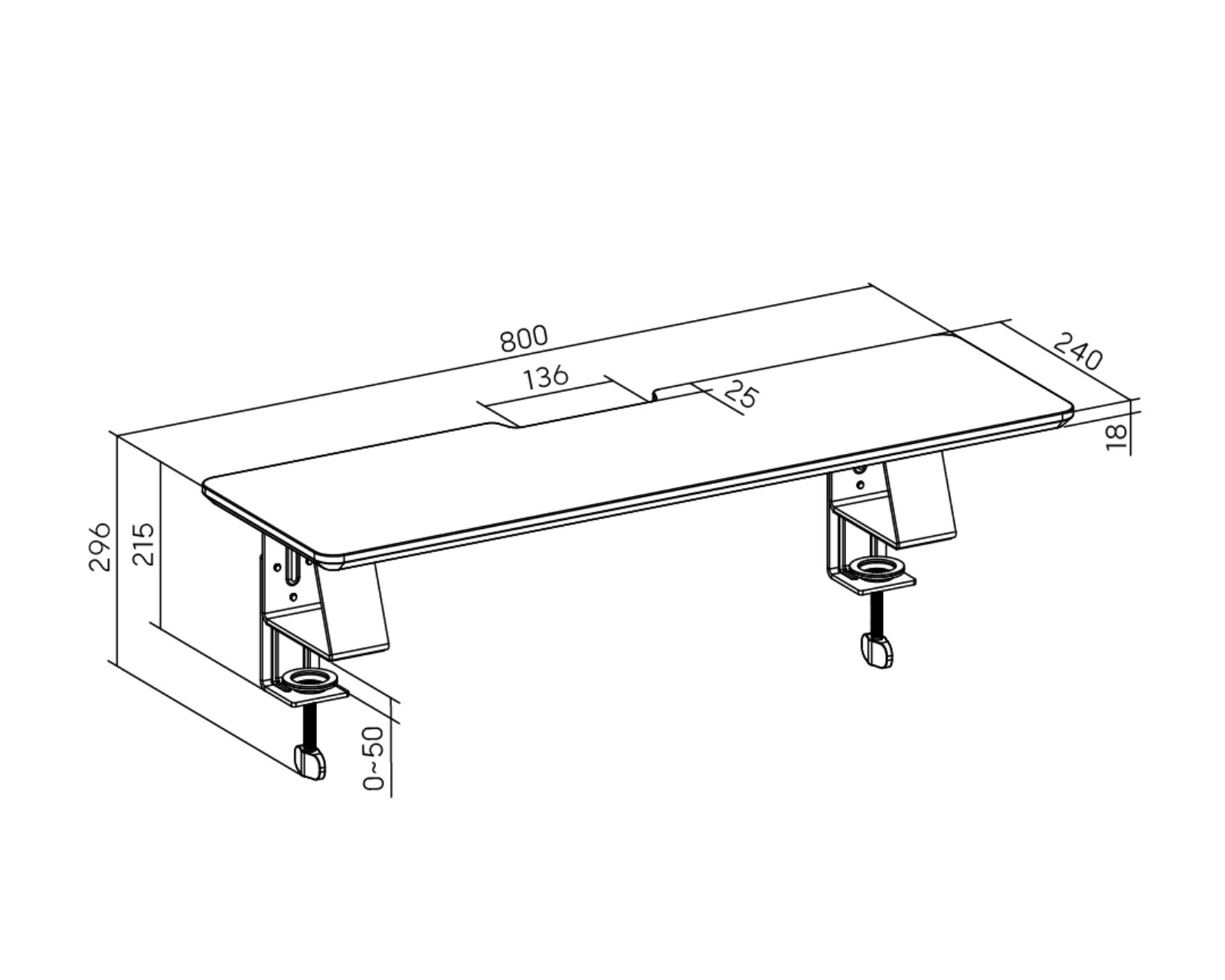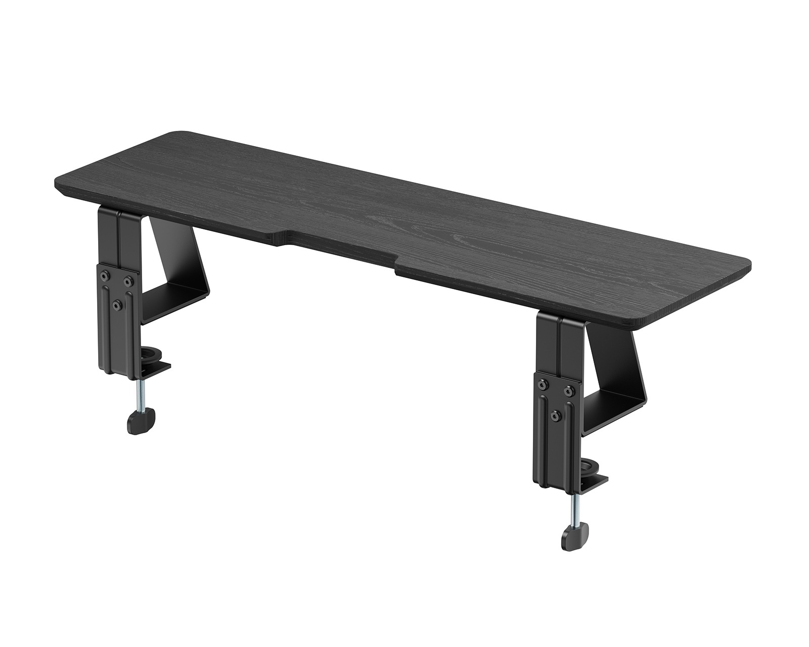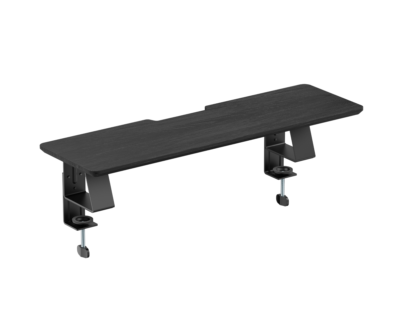 Das kompakte Bildschirmständer mit Tischbefestigung hat die Maße 800x240x296 mm und eine Oberflächenstärke von 18 mm. Die Materialien bestehen aus Stahl und MDF mit einer pulverlackierten Oberfläche. Der Ständer hat eine Tragfähigkeit von bis zu 30 kg pro Fach und ist mit einer Klammerbasis für eine sichere Befestigung am Tisch ausgestattet. Die schützenden Füße tragen zur Stabilität bei und verhindern Kratzer auf der Tischoberfläche. Das Kabelmanagementsystem erleichtert Ordnung und Sauberkeit rund um das Datenkabel.