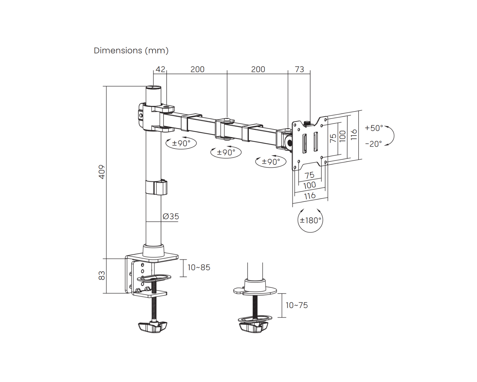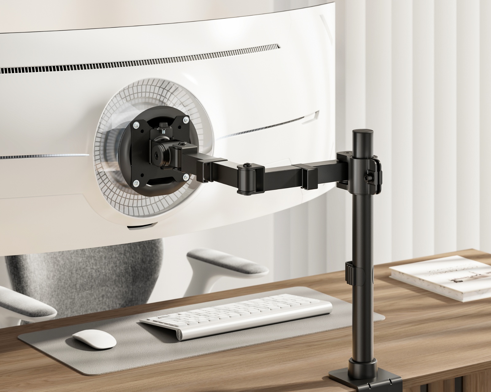 Der Monitorarm ist aus robusten Materialien gefertigt, die eine langanhaltende Haltbarkeit und Zuverlässigkeit gewährleisten. Die freie Höhenverstellung macht es einfach, die Position anzupassen, um das Arbeitsumfeld zu optimieren. Die Schwenkbarkeit bietet mehrere Betrachtungswinkel und die 360° drehbare VESA-Platte ermöglicht zusätzliche Anpassungen. Die Anwendung eines frei neigbaren Designs ermöglicht es dem Benutzer, den Winkel nach Bedarf anzupassen.