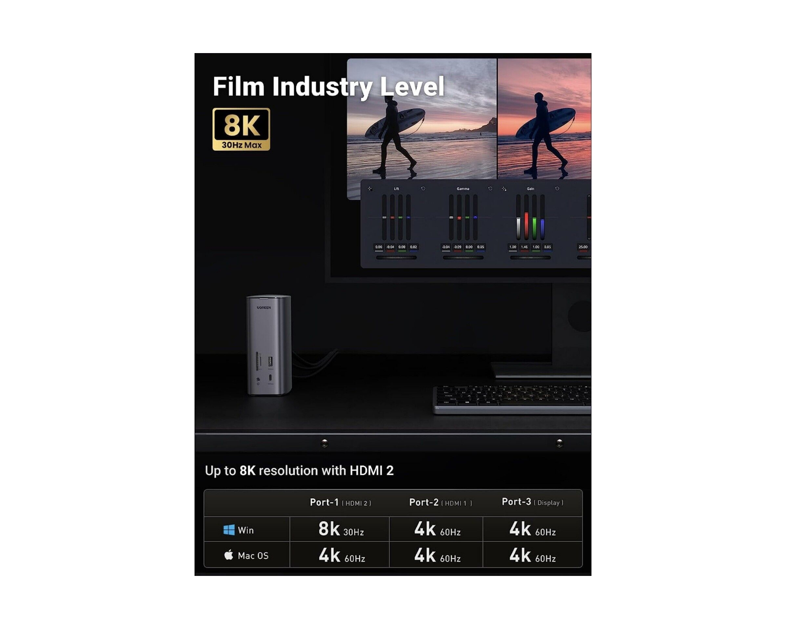 Darüber hinaus verfügt die Dockingstation über einen HDMI-Anschluss, der auch 4K bei 60 Hz unterstützt, und einen zweiten HDMI-Anschluss, der 8K bei 30 Hz unterstützt, sodass Sie mehrere hochauflösende Displays anschließen können. Ein USB-C PD-Anschluss ermöglicht das schnelle Aufladen Ihrer Geräte, während ein RJ45-Anschluss mit 1000 Mbit/s für eine stabile und schnelle Internetverbindung sorgt.