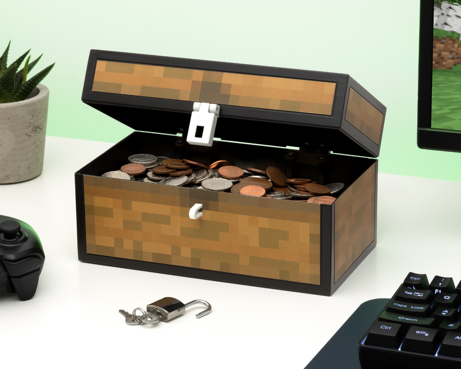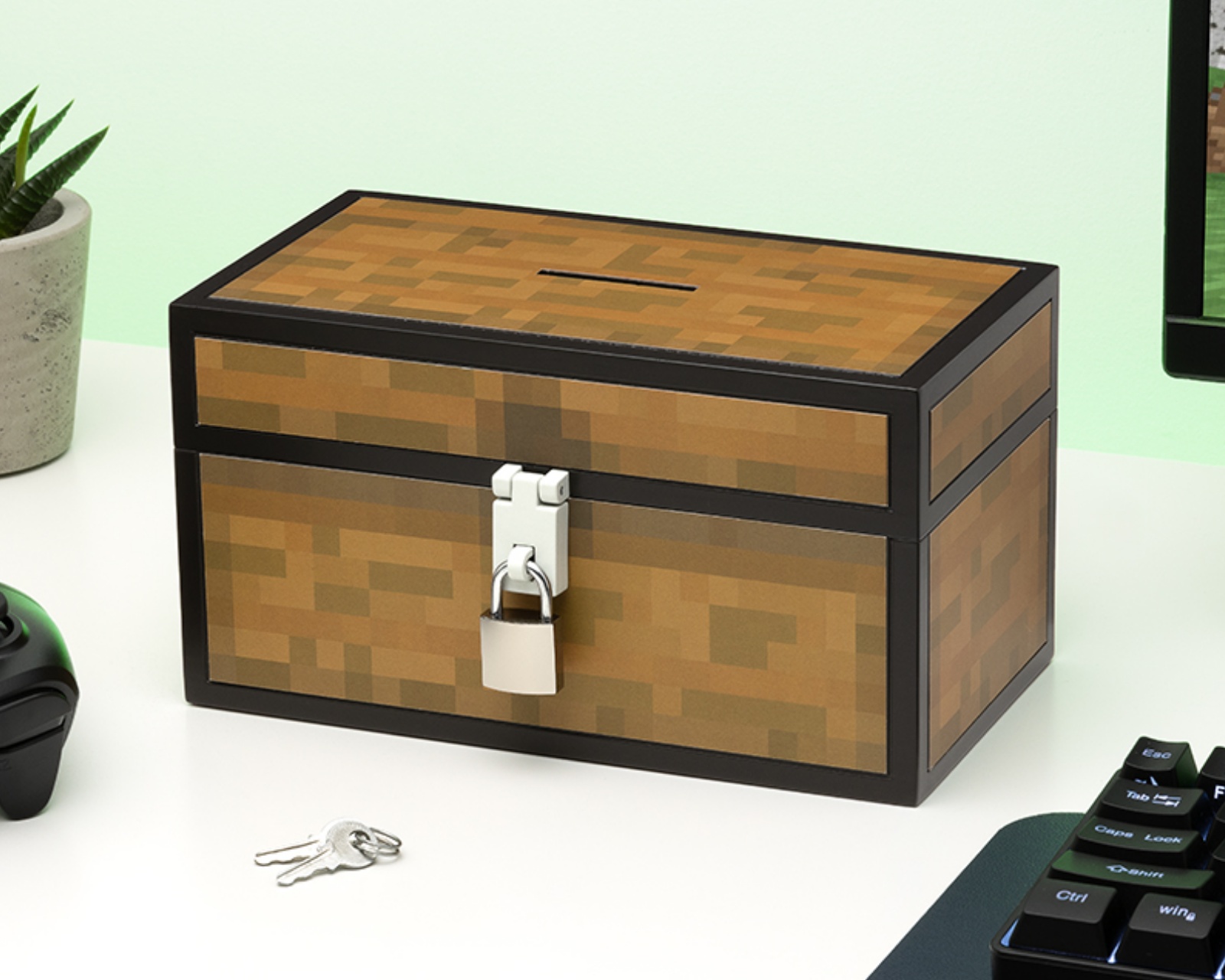 Minecraft Kiste Sparschwein ist ein Sparschwein, inspiriert von dem beliebten Spiel Minecraft. Sie hat eine Höhe von 12 cm und besteht aus Kunststoff, was sie leicht und langlebig macht. Mit einem beiliegenden Schloss kannst du dein Taschengeld sicher wie in einem eigenen Tresor in der Overworld aufbewahren. Sie ist ideal für Blockbauer und Handwerksmeister, die für das nächste Abenteuer sparen möchten.Das Produkt ist mit einer Reihe von Spezifikationen gestaltet, die es benutzerfreundlich und funktional machen. Sie wiegt 0,3 kg, was sie tragbar und leicht zu handhaben macht. Ihr vielseitiges Design ermöglicht es, dass sie sowohl von Kindern als auch von Erwachsenen genutzt werden kann, was zu ihrer breiten Anziehungskraft beiträgt.
