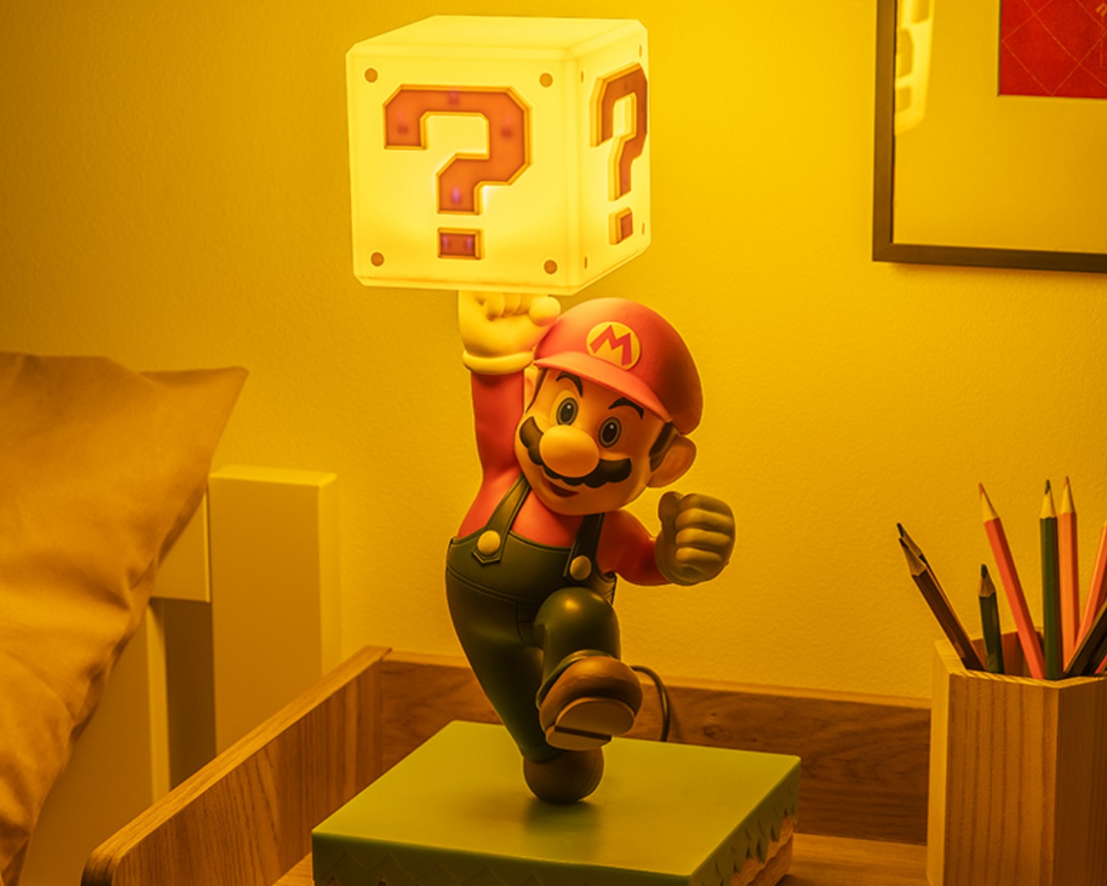 Super Mario Diorama Lampe ist eine einzigartige Lampe von Paladone, die Stil und Funktionalität kombiniert. Mit einer Höhe von 35 cm (13,8") ist sie im Design des beliebten, schnauzbärtigen Helden gestaltet und spielt das offizielle Erkennungssignal, wenn sie eingeschaltet wird. Die Lampe bietet drei Helligkeitsstufen, wodurch es einfach ist, die perfekte Atmosphäre in deinem Zuhause zu schaffen. Sie kann einfach über USB mit einem mitgelieferten Kabel betrieben werden.Hergestellt mit Fokus auf sowohl Qualität als auch Ästhetik ist die Super Mario Diorama Lampe ein offiziell lizenziertes Nintendo-Produkt. Die robuste Konstruktion macht sie zu einem langlebigen und zuverlässigen Einrichtungsdetail, während die drei verschiedenen Helligkeitsstufen den Benutzern die Flexibilität geben, die Beleuchtung nach Bedarf anzupassen. Die Isolierung und die Komponenten sind von hoher Qualität, sodass die Lampe sowohl hell leuchtet als auch gut aussieht, unabhängig davon, ob sie im Wohnzimmer oder in einem Spielzimmer verwendet wird. Es ist einfach, zwischen den Helligkeitsstufen zu wechseln, indem man auf die Lampe tippt.
