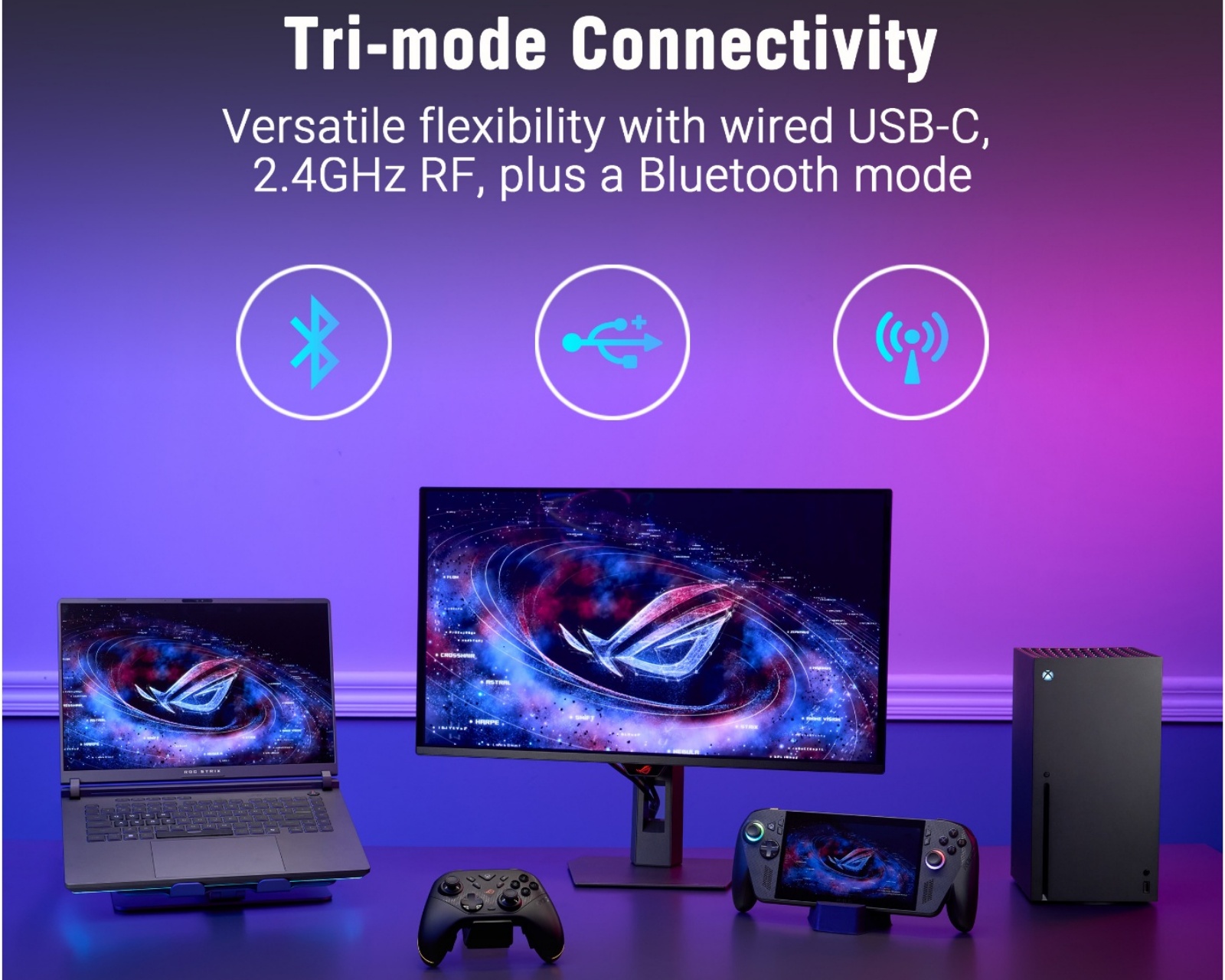 - Tri-Mode: 2.4GHz RF, Bluetooth, USB-C