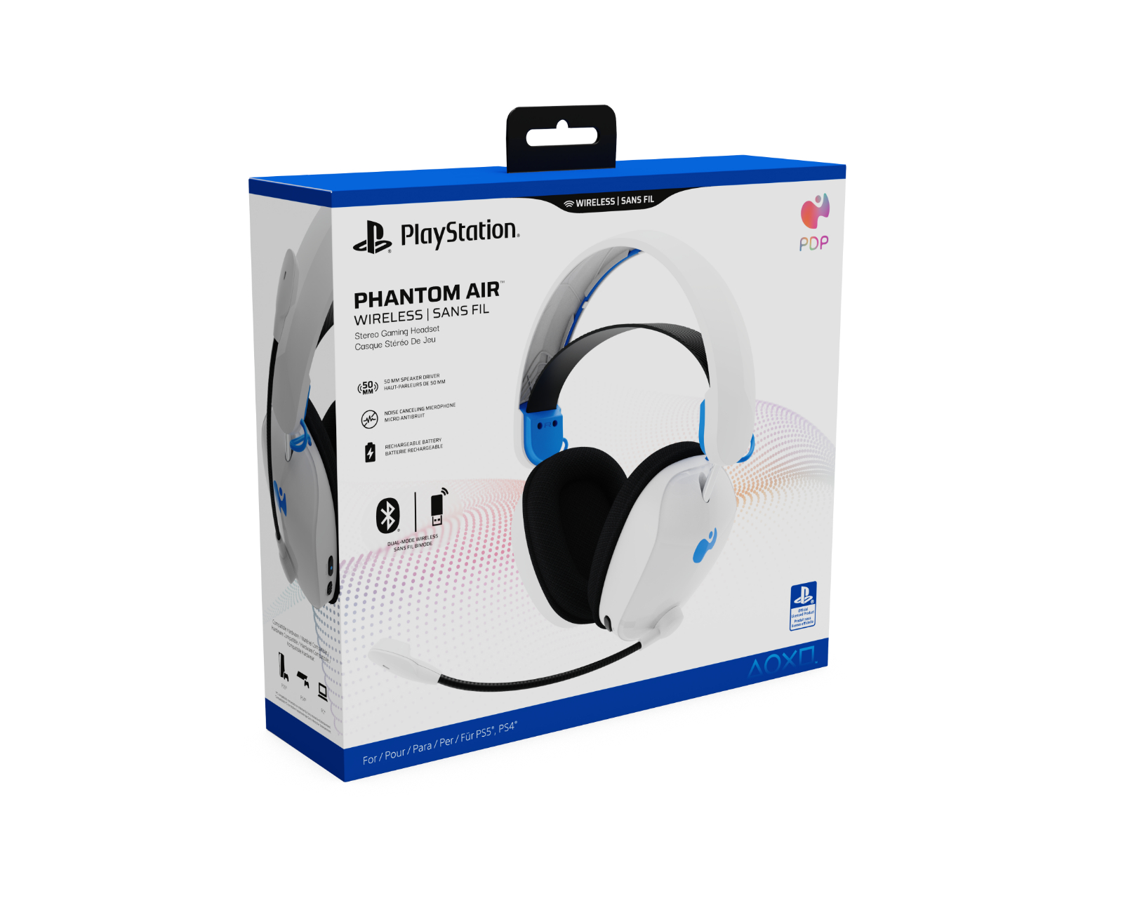 Phantom Air Trådlöst Headset ist ein Gaming-Headset von PDP, das ein ultraleichtes Design und drahtlose Dual-Mode-Funktionalität bietet. Das Headset ist offiziell lizenziert von PlayStation und hat strenge Tests durchlaufen, um Qualität und Leistung sicherzustellen. Mit einer integrierten QuickSwitch-Taste kann der Benutzer einfach zwischen Bluetooth- und 2,4 GHz Niedriglatenz-Drahtlosverbindungen wechseln, was es flexibel für verschiedene Geräte macht. Der eingebaute, wiederaufladbare Akku bietet bis zu 35 Stunden Hörzeit pro Ladung, was eine bequeme Nutzung während langer Spielsitzungen ermöglicht.Phantom Air verfügt über ein schwebendes Kopfband und Ohrpolster aus hochwertigem Stoff, die zu einer ergonomischen Passform beitragen und das Unbehagen selbst nach mehreren Stunden Nutzung minimieren. Wenn eine Pause benötigt wird, kann das Headset leicht um den Hals gefaltet werden, indem die schwenkbaren Ohrpolster genutzt werden. Die 50 mm Treiber sind darauf ausgelegt, ein tiefes und detailliertes Klangerlebnis zu bieten, und mit den Lautstärkereglern auf der Ohrfläche ist es einfach, die Lautstärke während des Spiels anzupassen. Das KI-basierte Geräuschunterdrückungsmikrofon bietet eine Flip-to-Mute-Funktion für schnelle Anpassungen des Tons.