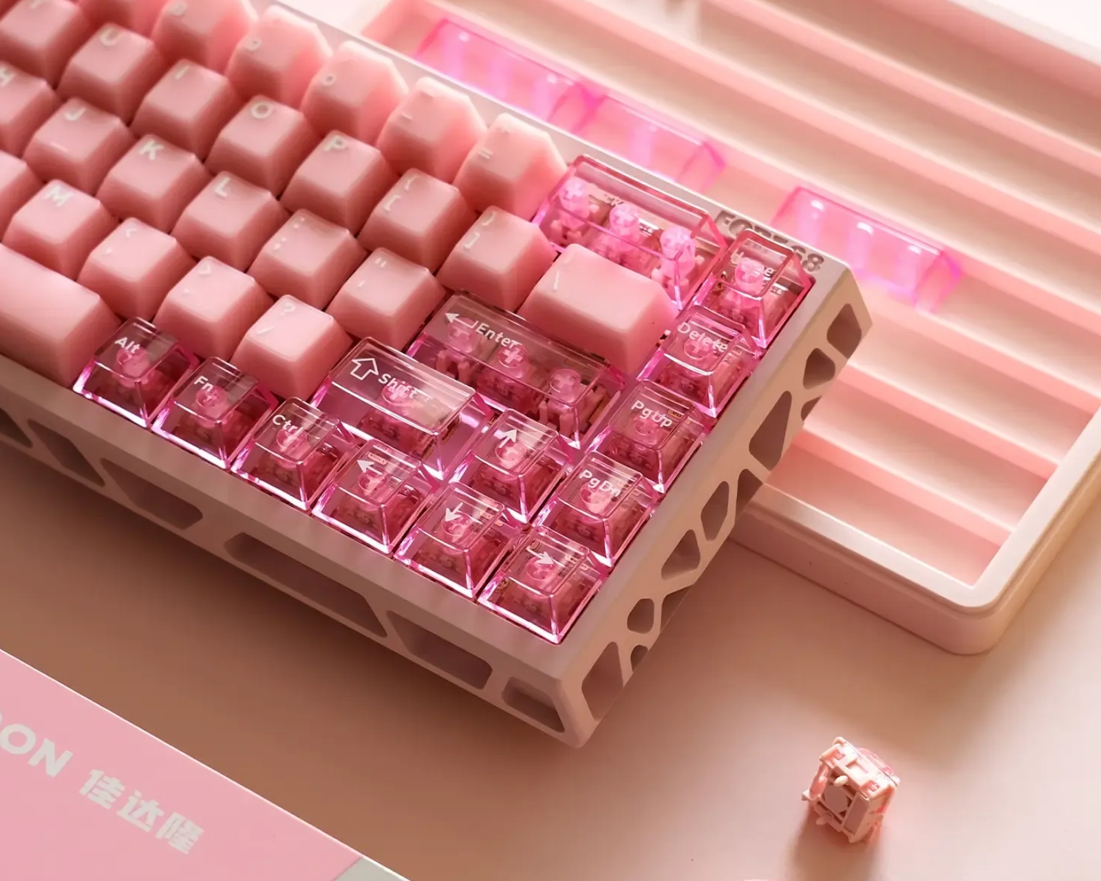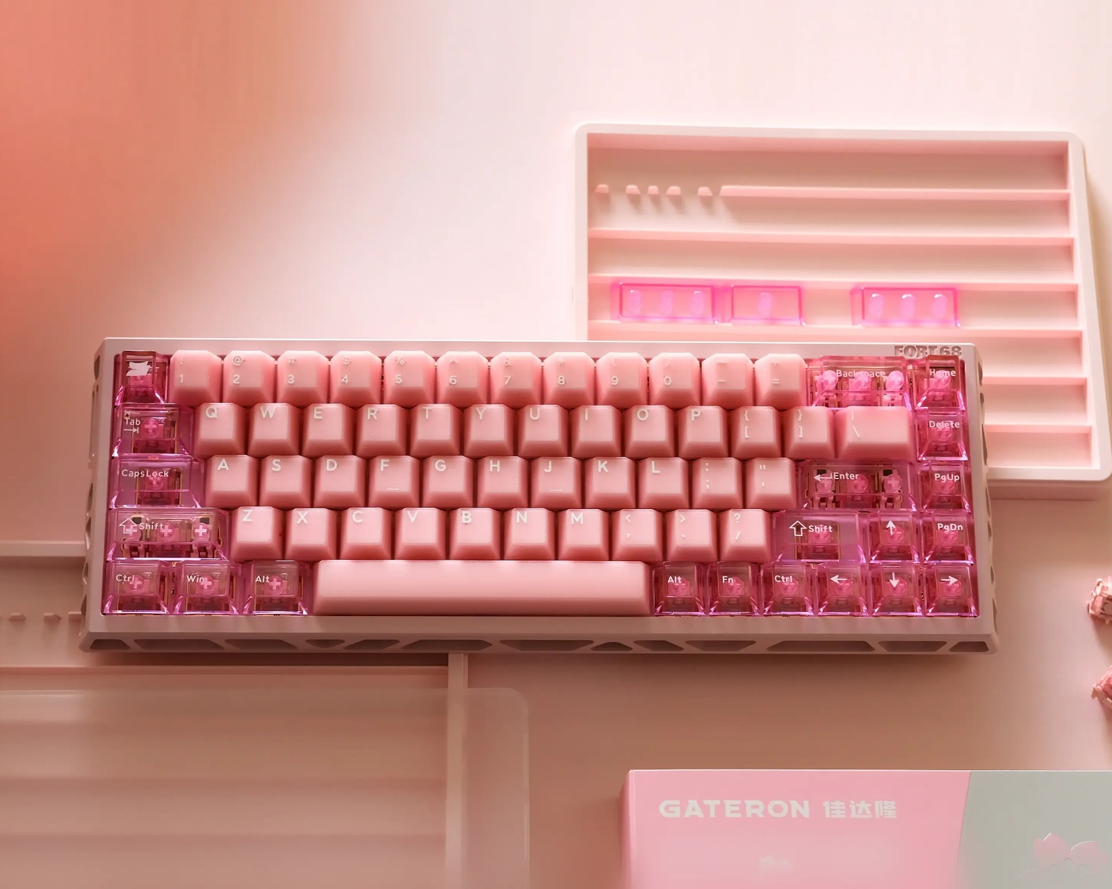 GATERON FORT 68 Sakura ist ein 68-Tasten mechanisches Tastaturset von Gateron, entworfen mit einem Echtzeit-Optiksystem und magnetischen Schaltern. Die Tastatur bietet ein vorinstalliertes Layout mit einer dreigeteilten modularen Leertaste für verbesserte Interaktivität und Anpassungsfähigkeit. Sie reagiert sofort auf Eingaben mit Lichteffekten, was ein facettenreiches Schreiberlebnis bietet.Die Tastatur ist mit einem patentierten dreigeteilten Design ausgestattet, das modulare Flexibilität und Stabilität ermöglicht. Der magnetische Schalter bietet verbesserte Rückmeldung mit schnellem Rückprall, was für Gamer von Vorteil ist. Darüber hinaus ist die Tastatur mit einer nanoskaligen wasserdichten Modul geschützt, sodass sie gegen Verschüttungen beständig ist. Die Latenz ist bemerkenswert mit einer Genauigkeit von 0,01 ms und einer Latenz von < 0,125 ms für eine flüssigere Nutzung.
