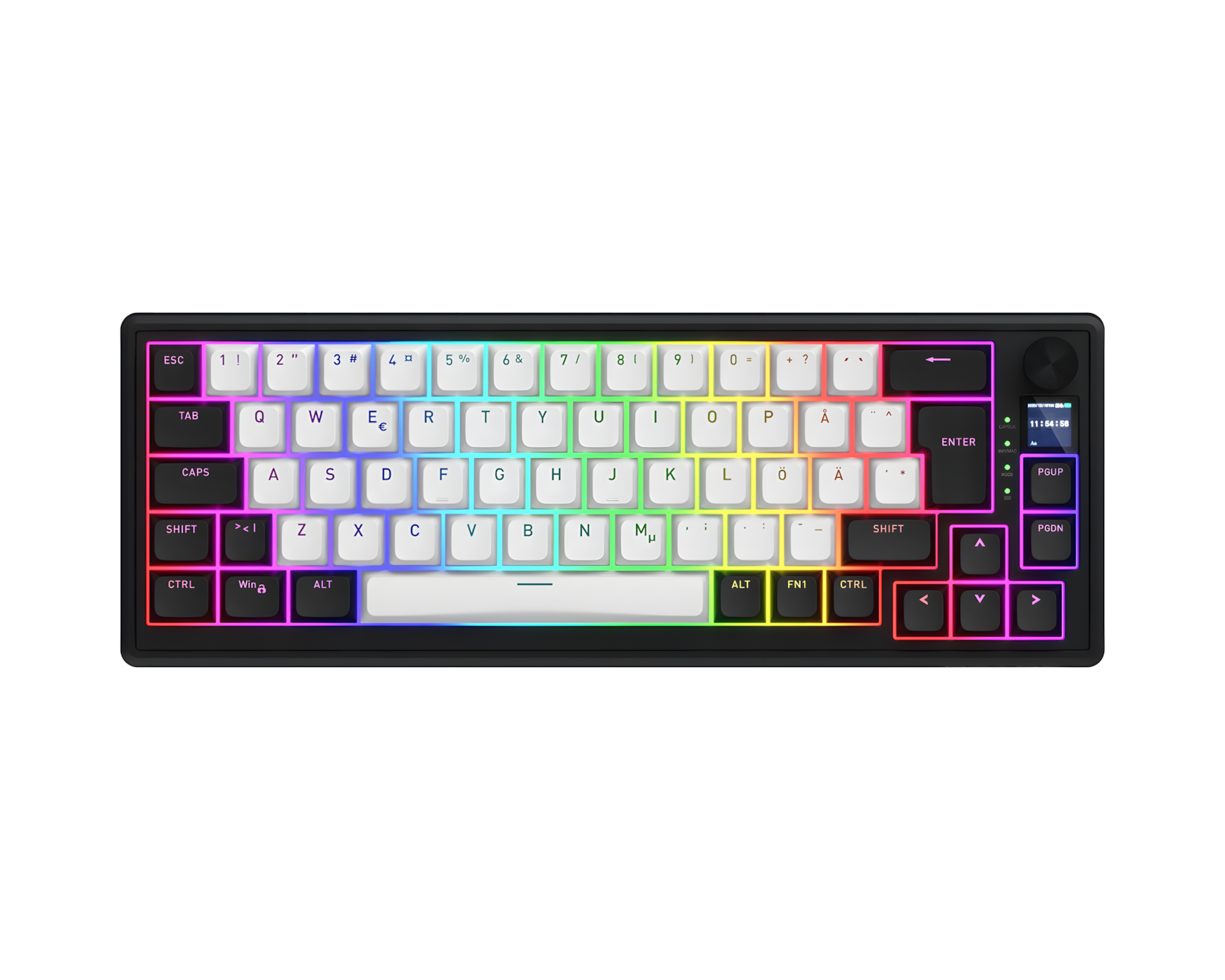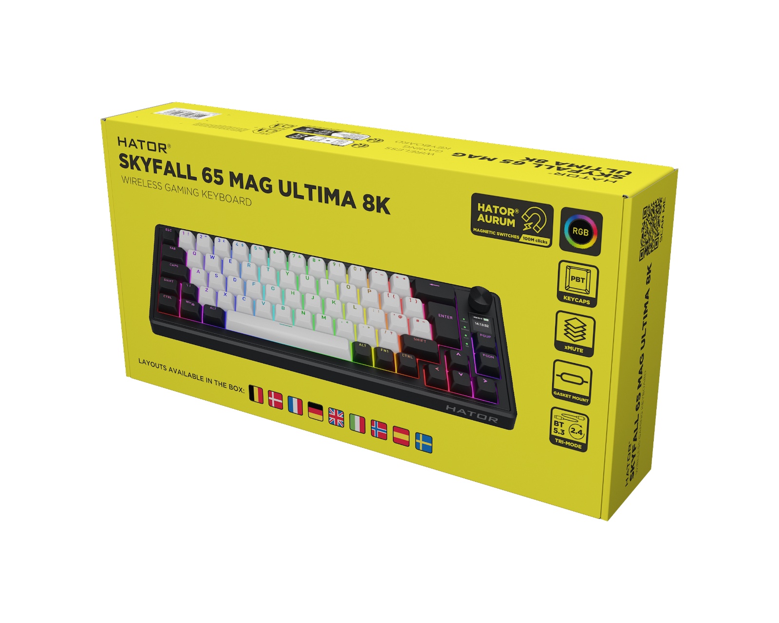 Skyfall 65% MAG Ultima 8K ist eine drahtlose Tastatur von Skyfall, die hohe Leistung mit Anpassungsfähigkeit kombiniert. Mit magnetischen Aurum Ice-Schaltern wird jeder Tastendruck präzise registriert, wobei der Auslösepunkt für jede Taste individuell eingestellt werden kann. Sie bietet auch eine Abtastrate von bis zu 8000 Hz, was Verzögerungen bei der Registrierung von Tastenanschlägen minimiert. Im Lieferumfang sind auch zusätzliche Keycaps für die ISO-Layouts: DE, Nordic, IT, ES, FRA und BE enthalten.Die Konstruktion der Tastatur ist gasket-montiert und beinhaltet mehrschichtige Schalldämpfung, die einen kontrollierten Anschlag bietet und Resonanz reduziert. Die flexible Tri-Mode-Verbindung über USB, 2.4 GHz oder Bluetooth gewährleistet eine stabile und schnelle Rückmeldung. Digitale Komponenten und ein TFT-Bildschirm ermöglichen schnellen Zugriff auf Einstellungen, während die anpassbare RGB-Beleuchtung visuelle Indikationen für jede Taste bietet. Darüber hinaus unterstützt die Tastatur Hot-Swap von Schaltern, was die Anpassung ohne Lötbedarf erleichtert.