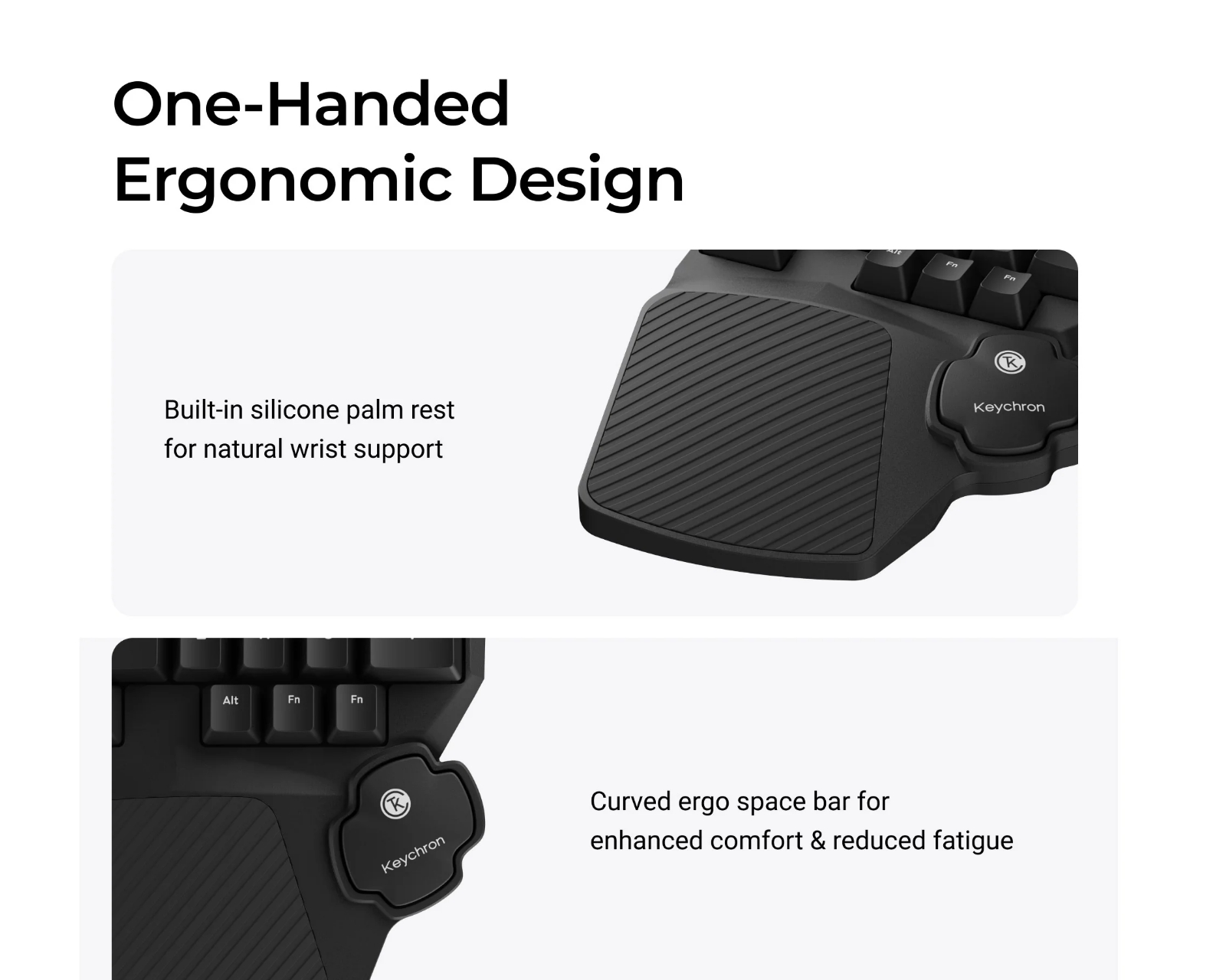 C0 HE 8K ist eine Einhandtastatur von Keychron, die hohe Leistung mit ergonomischem Design kombiniert. Sie verfügt über 35 Tasten und ist mit Keychron Ultra-Fast Lime Magnetic Switches ausgestattet, die schnelle und präzise Tasteneingaben ermöglichen. Mit einer Abtastrate von 8000 Hz wird minimales Inputlag für wettbewerbsorientiertes Spielen sichergestellt.Die Verarbeitungsqualität ist hoch, mit einem Gehäuse aus Kunststoff und Aluminiumplatten, was zur Langlebigkeit beiträgt. Die Tastatur wird mit einem integrierten Silikonhandballenauflage geliefert, um den Komfort während langer Spielsitzungen zu erhöhen. Die webbasierte Software Keychron Launcher ermöglicht es Benutzern, Tasten einfach online anzupassen und Makros zu erstellen, ohne dass Software installiert werden muss. Sie unterstützt auch verschiedene Betriebssysteme, einschließlich Windows, macOS und Linux.
