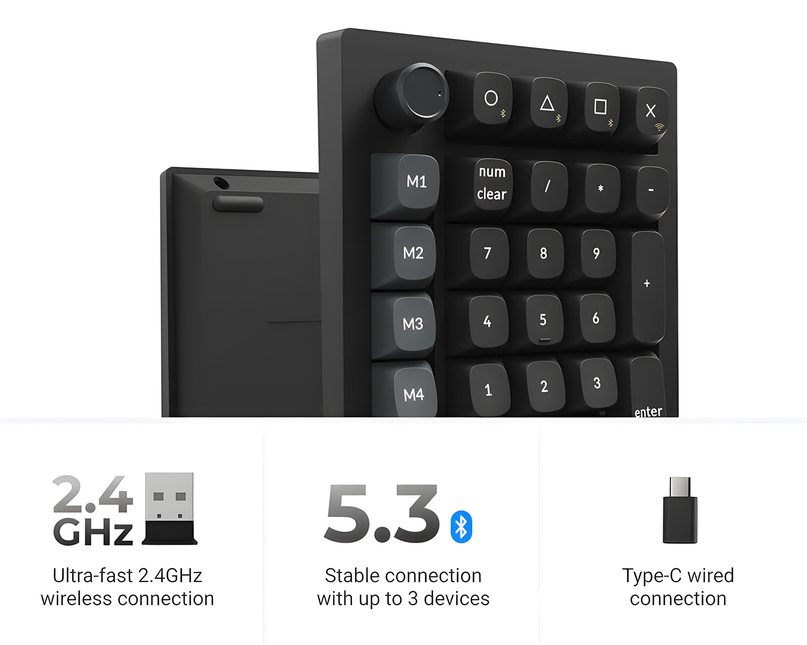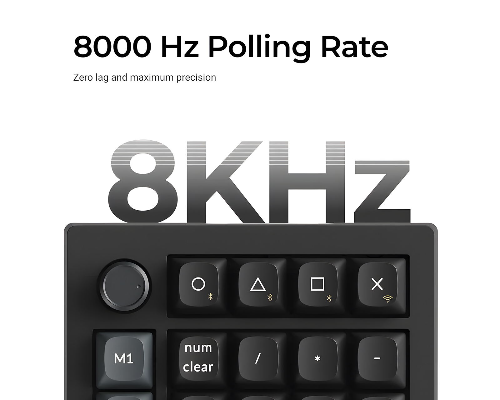 V0 Ultra 8K ist ein kabelloses Nummernfeld von Keychron, das hohe Leistung und ergonomischen Komfort bietet. Es ist mit Unterstützung für eine 2,4 GHz kabellose Verbindung, Bluetooth 5.3 und USB-Kabel ausgestattet, was Flexibilität bei der Verbindung ermöglicht. Das Gerät hat eine Polling-Rate von 8000 Hz und eine beeindruckende Batterielaufzeit von bis zu 360 Stunden.Die Bauqualität des Keychron V0 Ultra 8K ist außergewöhnlich, mit mehreren Schichten schalldämmendem Schaum für ein verfeinertes Klangprofil. Der leistungsstarke Arm-Prozessor (MCU) mit 1 MB Flash bietet Entwicklern Flexibilität, und die ZMK-Software ermöglicht einfache Anpassungen über den Keychron Launcher. Das Nummernfeld ist außerdem hot-swappable, was bedeutet, dass Spieler Switches ohne Löten austauschen können. Das Beleuchtungssystem verwendet south-facing RGB-LEDs, was die Sichtbarkeit der Hintergrundbeleuchtung verbessert, ohne dass verschiedene Keycap-Profile beeinträchtigt werden.