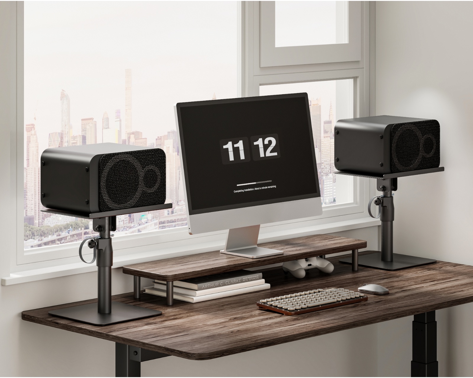 Justerbare Lautsprecherständer sind ein Paar freistehende Lautsprecherständer von MaxMount, die entwickelt wurden, um eine präzise und flexible Positionierung der Lautsprecher zu ermöglichen. Mit vollständig einstellbaren Winkeln und vibrationsdämpfenden Polstern wird optimale Klangklarheit gewährleistet. Der Lautsprecherständer verfügt außerdem über ein integriertes Kabelmanagement, das hilft, die Arbeitsfläche sauber und organisiert zu halten. Die freistehende Basis bietet stabilen Halt und ein elegantes, modernes Design, das Zuverlässigkeit mit ästhetisch ansprechendem Aussehen kombiniert.Die Materialwahl und die Bauqualität sind von hoher Standard, was Stabilität und Haltbarkeit während des Gebrauchs bietet. Die Anti-Vibrationspolster minimieren unerwünschte Vibrationen und Geräusche von den Lautsprechern, was zu einem besseren Klangerlebnis beiträgt. Die große, stabile Basis sorgt dafür, dass die Ständer stabil stehen, egal ob sie im Heim oder in professionellen Umgebungen verwendet werden.