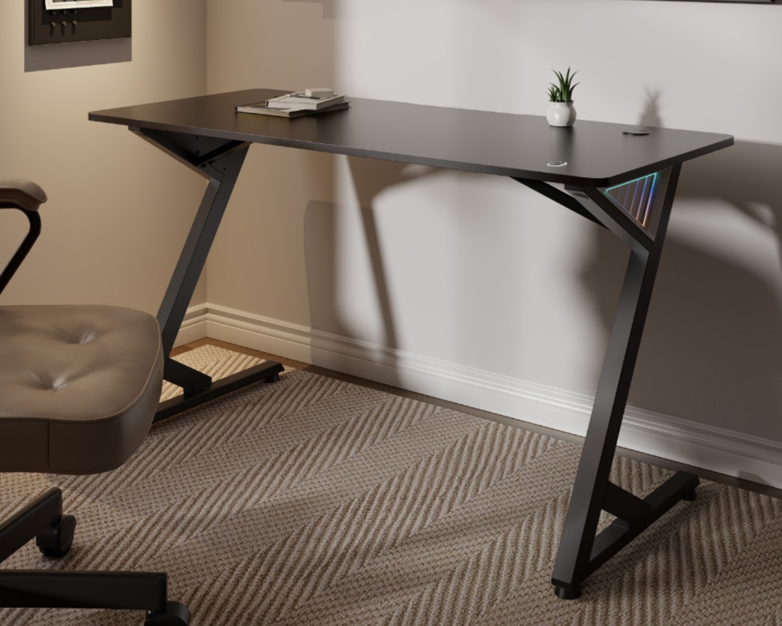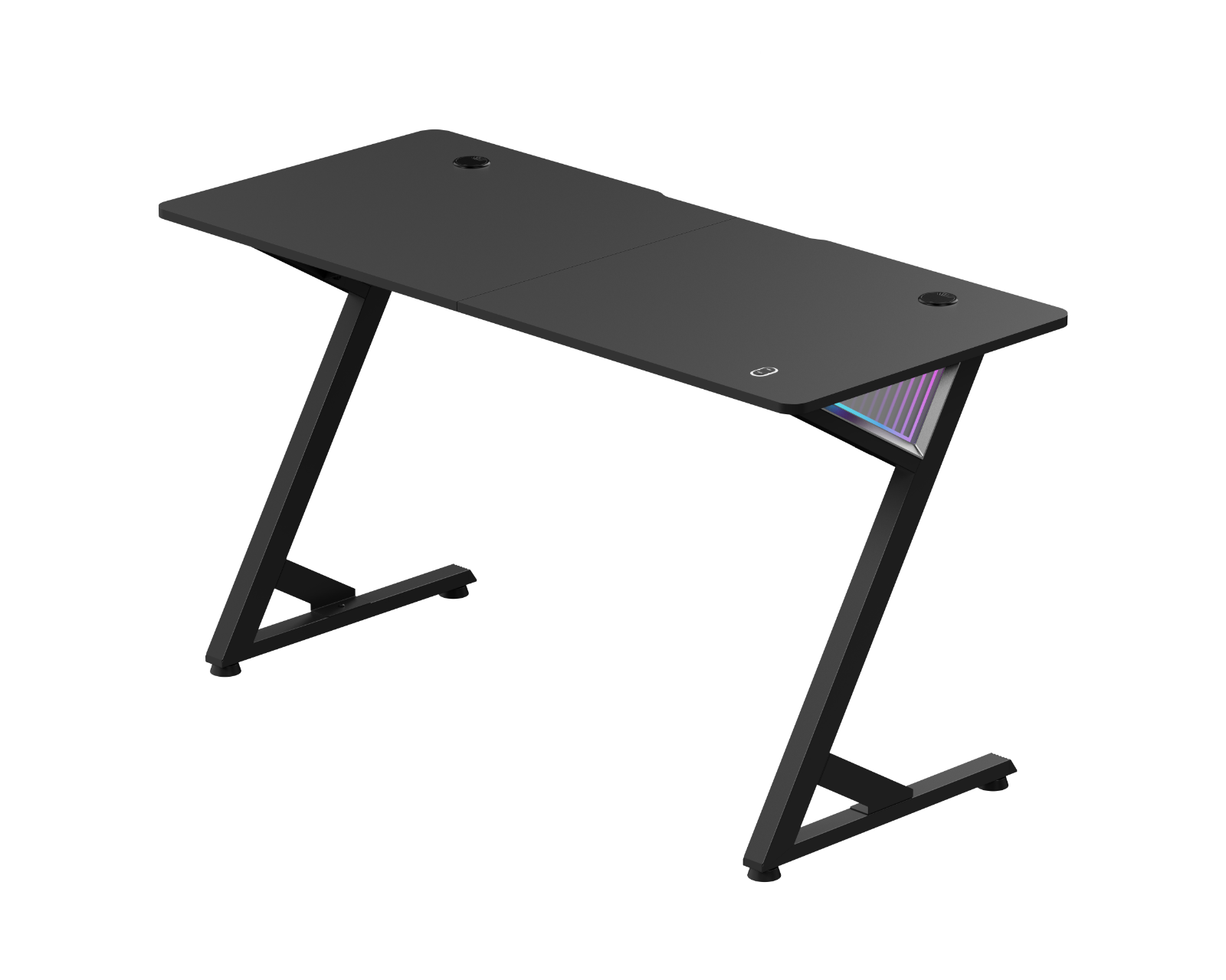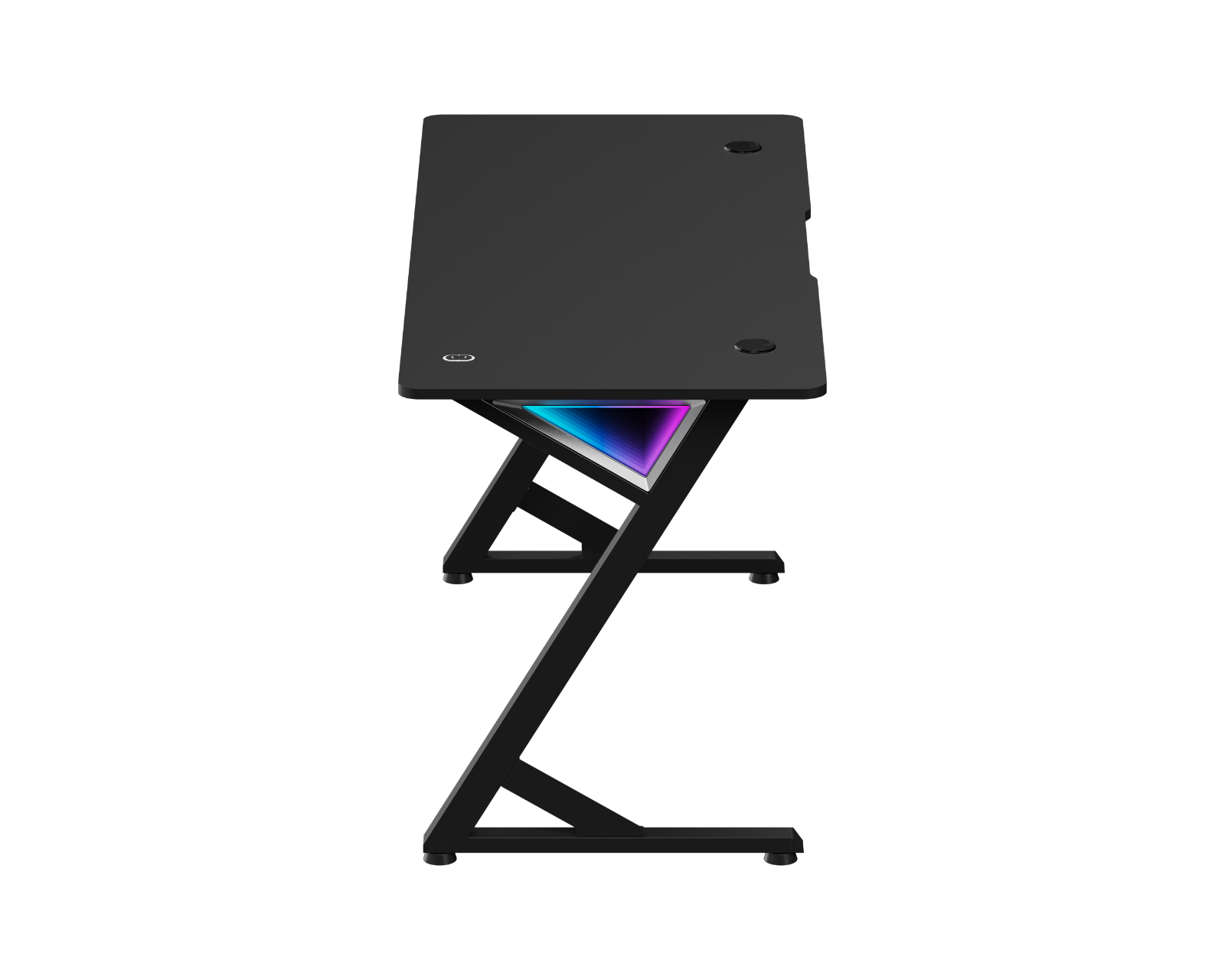 InfinityGlow Gaming Schreibtisch ist eine große Tischfläche von MaxMount. Er bietet einen integrierten Beleuchtungseffekt mit einem eingebauten LED-System in der Struktur der Beine, was der Spielumgebung eine dynamische Atmosphäre verleiht. Die Tischfläche misst 1360 x 600 mm und hat eine stabile Tragfähigkeit von bis zu 75 kg. Der Tisch ist für Gamer konzipiert, die eine beeindruckende und funktionale Spieloberfläche schaffen möchten.Der Tisch hat ein futuristisches Design mit Z-förmigen Beinen, das eine klare Ästhetik schafft und Stabilität während der Nutzung gewährleistet. Die integrierten Kabelmanagementöffnungen reduzieren Kabelunordnung und sorgen für ein sauberes Aussehen. Der Tisch verfügt außerdem über anpassbare Aufkleber, um eine persönliche Note zu verleihen und die Stimmung zu heben. Der minimalistische Look wird durch die Beleuchtungssteuerungen verstärkt, die einfach zu erreichen sind.
