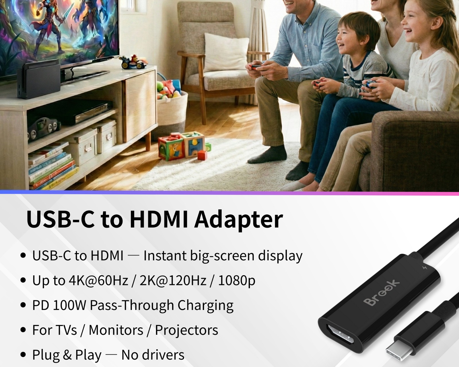 USB-C-zu-HDMI-Adapter von Brook, entworfen für eine einfache und effiziente Verbindung zwischen USB-C-Geräten und HDMI-Monitoren. Mit Unterstützung für Auflösungen von bis zu 4K bei 60Hz, 2K bei 120Hz und 1080p bietet dieser Adapter eine scharfe und klare Bildqualität. Er ist ideal für den Einsatz mit Fernsehern, Monitoren und Projektoren, was ihn zu einem vielseitigen Werkzeug für Gaming und Multimedia macht. Die Plug-and-Play-Funktionalität des Adapters ermöglicht eine nahtlose Installation ohne zusätzliche Treiber.Die Adapterkonstruktion ist robust und für hohe Datenübertragungsraten optimiert, was sicherstellt, dass Sie die bestmögliche Anzeigeerfahrung erhalten. Mit einer PD 100W Durchleitungsladefunktion können Sie Ihre Geräte gleichzeitig laden, während Sie den Adapter verwenden, was die Notwendigkeit mehrerer Kabel eliminiert. Dies macht ihn zu einer praktischen Wahl für Mobilität und Benutzerfreundlichkeit. Entworfen, um kompakt zu sein, ist er leicht mitzunehmen und perfekt für den Heimgebrauch und unterwegs.