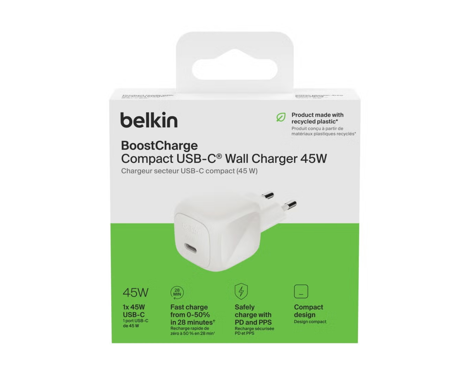 BoostCharge 45W USB PD Wandladegerät ist ein Schnellladegerät von Belkin. Es bietet die Möglichkeit, Geräte wie Smartphones, Tablets und Laptops über USB-C aufzuladen und hat die Kapazität, ein Gerät in weniger als 30 Minuten auf 50 % aufzuladen. Das Ladegerät hat eine kompakte Größe und nimmt minimal Platz ein, was es ideal für Zuhause und Reisen macht.Dieses Ladegerät ist USB-PD 3.1-zertifiziert und liefert eine Leistung von 45W, was schnelles und sicheres Laden für alle kompatiblen USB-C-Geräte ermöglicht. Belkin BoostCharge besteht aus 72 % recyceltem Kunststoff, was zu einem nachhaltigeren Produkt beiträgt. Das Ladegerät kommt in einer Plastikhülle und hat Maße von 33,5 x 33,5 x 34,5 mm. Es hat einen einzigen USB-C-Anschluss für die Verbindung und erfordert ein separates Ladekabel.