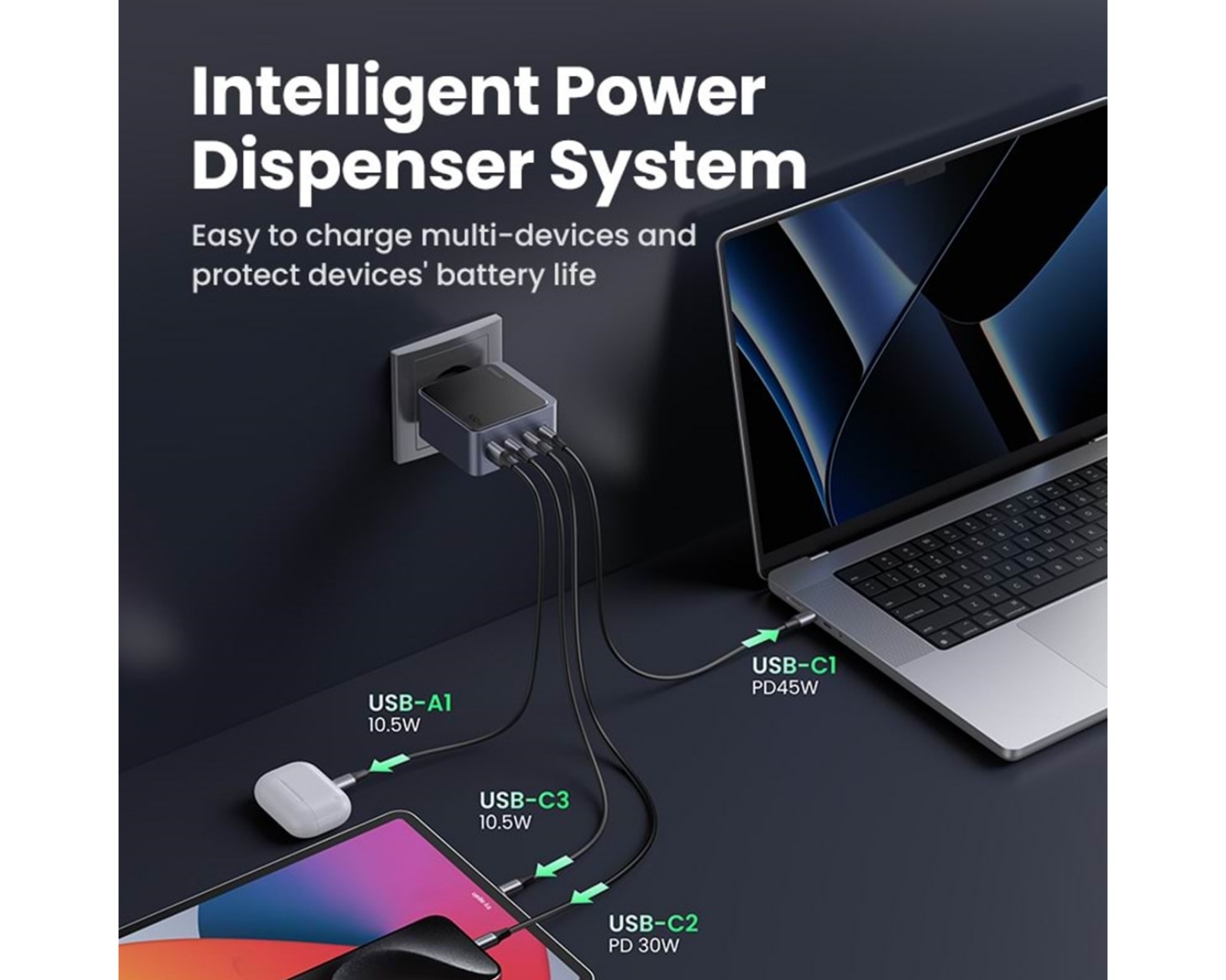 Nexode S 100W 4-Port ist ein Wandladegerät mit schneller Aufladung Ihres Geräts. Durch die fortschrittliche Ladetechnologie können Sie Ihr Smartphone, Tablet oder andere elektronische Geräte effizient und zuverlässig aufladen. Dank des intelligenten Überhitzungsschutzes können Sie sicher sein, dass Ihre Geräte schnell und sicher aufgeladen werden. Stellen Sie sicher, dass Sie immer bereit für den Tag sind mit voll aufgeladenen Geräten, die Sie den ganzen Tag über verbunden und produktiv halten.Mit dem Nexode S 100W stehen Ihnen vier Anschlussanschlüsse zur Verfügung, sodass Sie alle Ihre Geräte ganz einfach voll aufgeladen und einsatzbereit halten können, wenn Sie sie brauchen. Über diese Anschlüsse haben Sie die Möglichkeit, Ihr Smartphone, Tablet, Laptop und andere Geräte gleichzeitig aufzuladen, was sich perfekt für die effiziente Bewältigung Ihres digitalen Alltags eignet.