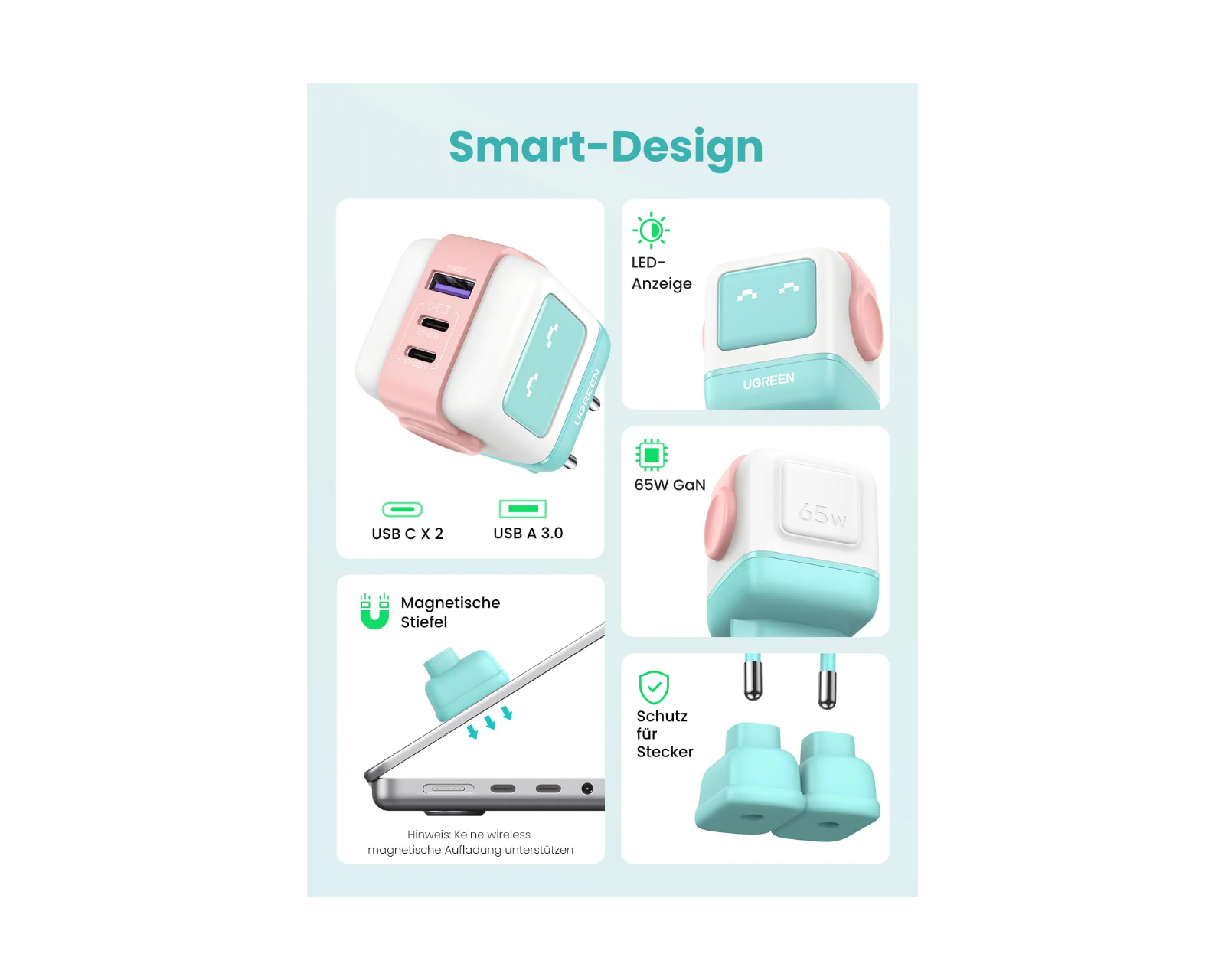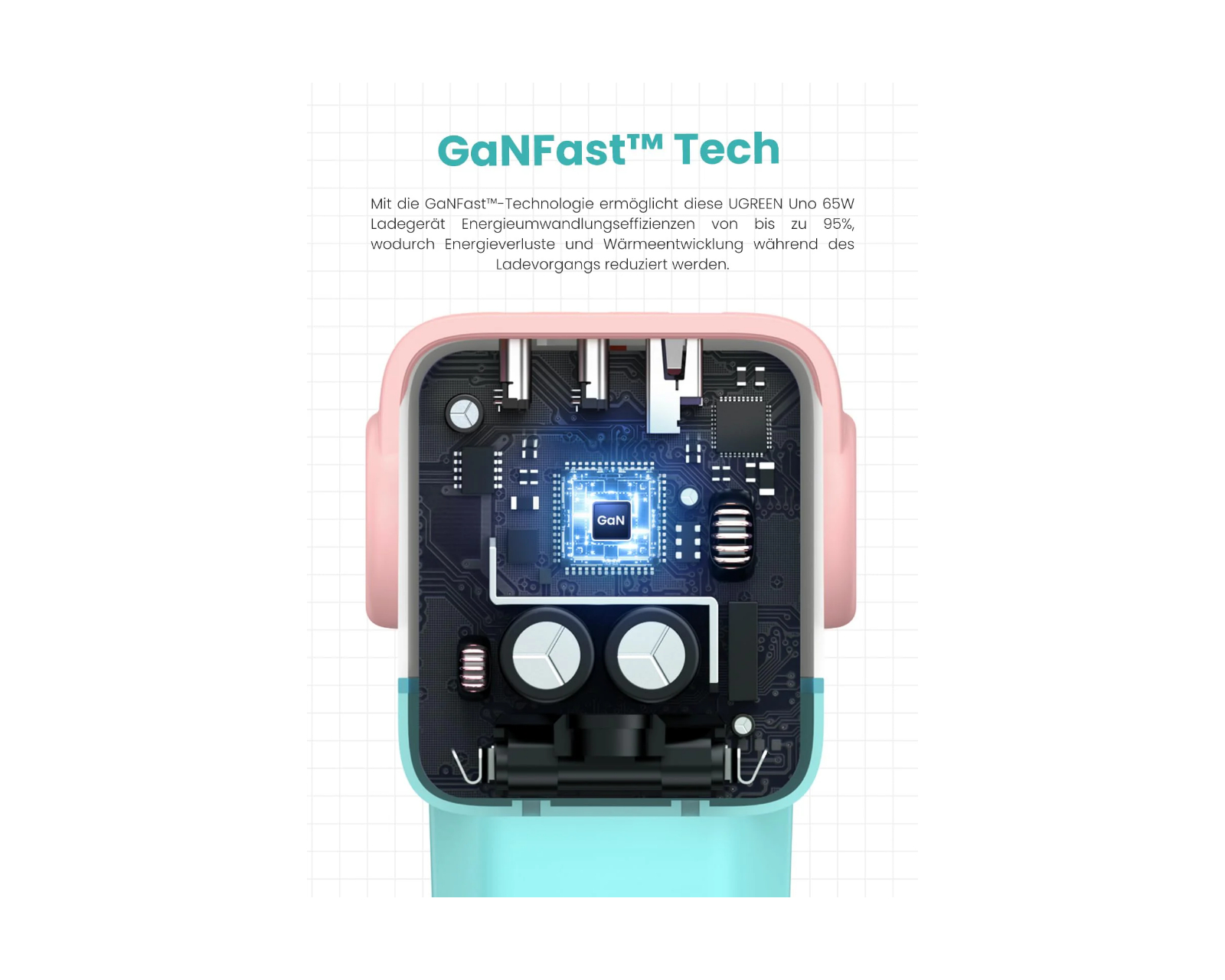 Uno Robot GaN ist ein leistungsstarkes und kompaktes Schnellladegerät mit drei Ladeanschlüssen, perfekt zum gleichzeitigen Laden mehrerer Geräte. Es verfügt über zwei USB-C-Anschlüsse, von denen einer eine maximale Leistung von bis zu 65 W bietet, ideal zum Laden von Laptops, Tablets und anderen Geräten mit hohem Stromverbrauch, während der andere eine maximale Leistung von 30 W bietet, ideal für Smartphones und kleinere Geräte.