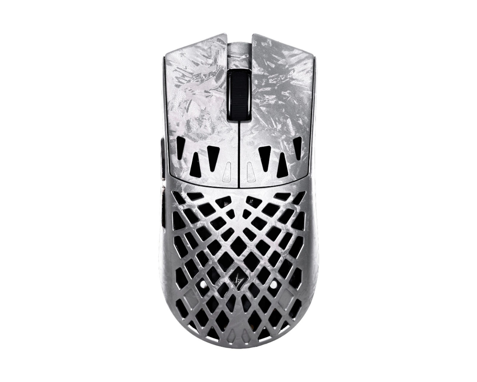 GHOST Exreme ist eine Gaming-Maus von ATK, die eine leistungsstarke kabellose Lösung bietet. Sie basiert auf einer Hohlgusskonstruktion aus Kohlefaserverbundmaterial, was eine überlegene Verarbeitungsqualität und Haptik verleiht. Entworfen für mittelgroße bis kleine Hände und optimiert für alle Griffstile bietet GHOST ein komfortables und intuitives Erlebnis für Gamer.Die Maus wiegt nur 48±3g und hat exakte Maße von 121mm x 61.3mm x 38mm, was zu ihrem geringen Gewicht und ihrer Handhabung beiträgt. Sie verwendet den PAW3950 Ultra-Sensor und misst die Polling-Rate im Bereich von 125-8000Hz, was sie extrem reaktionsschnell macht. Ausgestattet mit einer neuen Nano-Beschichtung bietet sie sowohl Grip als auch Haltbarkeit.