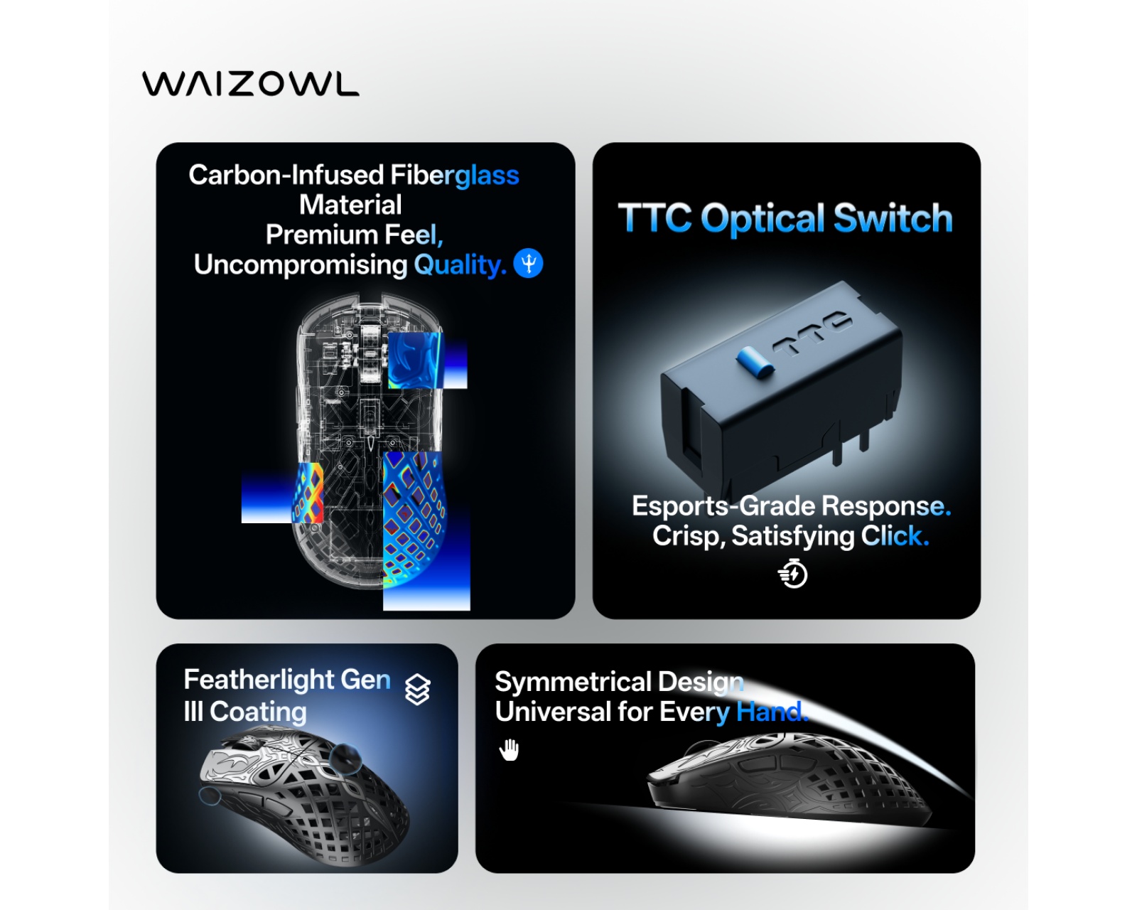 TRIAINA ist eine kabellose Gaming-Maus von Waizowl, die extrem leichtes Gewicht mit erstklassiger Technologie kombiniert. Mit einem Gewicht von nur 49 Gramm und einer der schnellsten Ladelösungen der Welt mit einem 4C-Akku hebt sie das Gaming-Erlebnis auf ein neues Niveau, indem sie eine volle Ladung in nur 22 Minuten bietet.Die Konstruktion der Maus aus Glasfaser und Polycarbonat trägt zu einem steifen und langlebigen Design bei, ohne das Gewicht zu beeinflussen. Der maßgeschneiderte 3950 HAWKEYE-Sensor ermöglicht pixelgenaue Verfolgung und Stabilität, was den Spielern genaue Kontrolle während intensiver Spielszenen bietet. Das ergonomische Low-Profile-Design ist für verschiedene Griffstile optimiert und maximiert den Komfort während längerer Spielsitzungen. TRIAINA bietet außerdem eine beeindruckende Akkulaufzeit von bis zu 170 Stunden bei 1K Polling-Rate, um ununterbrochenes Spielen zu unterstützen.