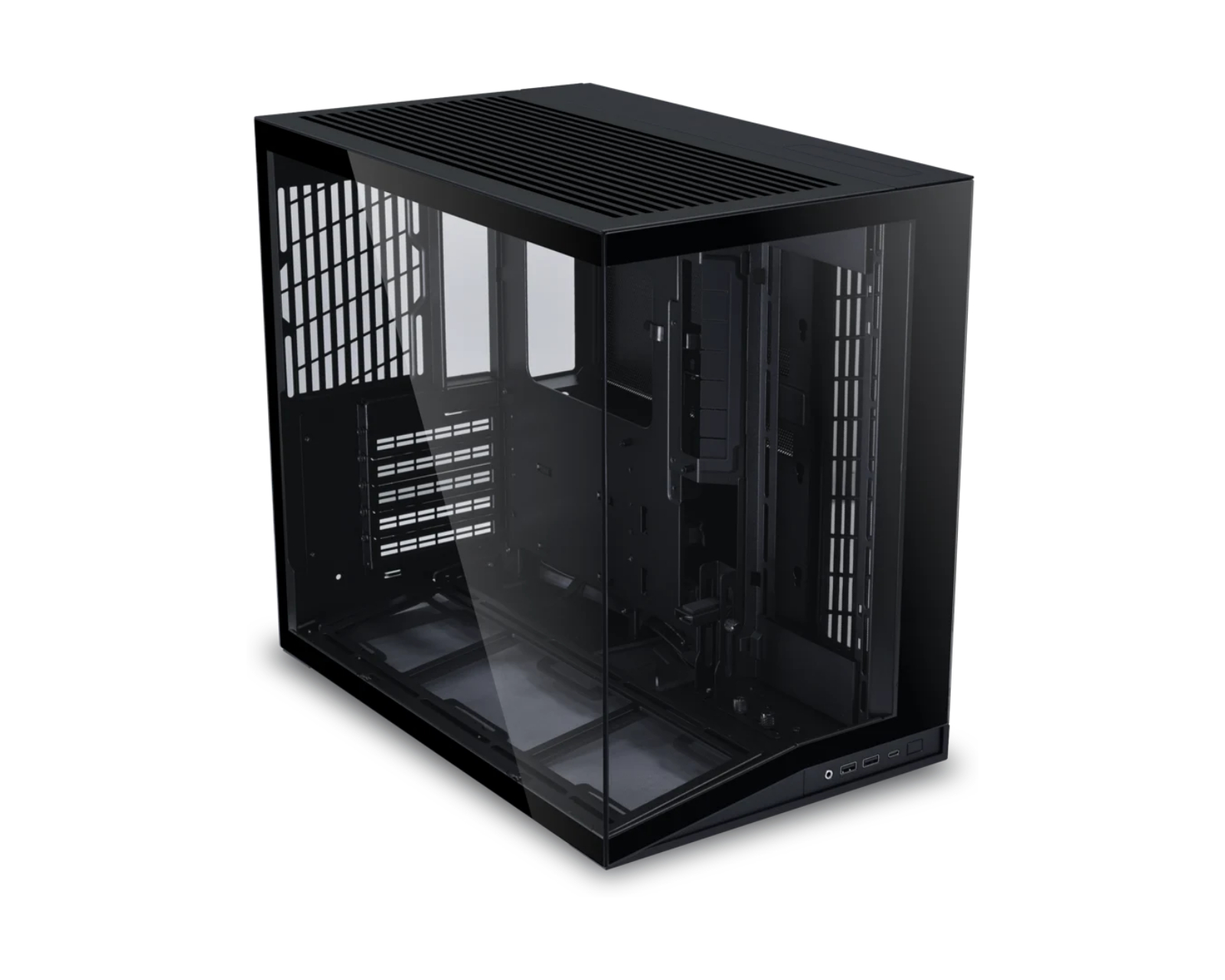 O11D Mini V2 ist ein Chassis von Lian Li, das einen kompakten Designraum für hochleistungsfähige Gaming-Hardware bietet. Trotz seiner geringeren Größe verfügt es über ein geräumiges Innenleben, das die Installation leistungsstarker Komponenten und die Anpassung für Luft- oder Wasserkühlung ermöglicht, einschließlich der vertikalen Montage von Grafikkarten. Das Chassis richtet sich hauptsächlich an Gamer, die eine ästhetisch ansprechende und funktionale Lösung für ihren PC-Bau suchen.Dieses Chassis ist mit seitlichen Panellen aus gehärtetem Glas ausgestattet, die es den Benutzern ermöglichen, ihre Komponenten zu zeigen. Lian Li O11D Mini V2 verfügt über ein durchdachtes Kabelmanagementsystem, einschließlich Kabelhaltern und Unterstützung für Mainboards mit Back-Connect-Design. Es unterstützt Mainboards im Mini-ITX-, mATX- und ATX-Format. Das Chassis erlaubt bis zu neun Lüfter und bietet Platz für zwei Wasserkühlungsradiatoren, was eine effiziente Kühlung auch unter hoher Belastung gewährleistet. Mesh-Panels und Blenden zum Staubschutz tragen zu einer saubereren Innenumgebung bei.