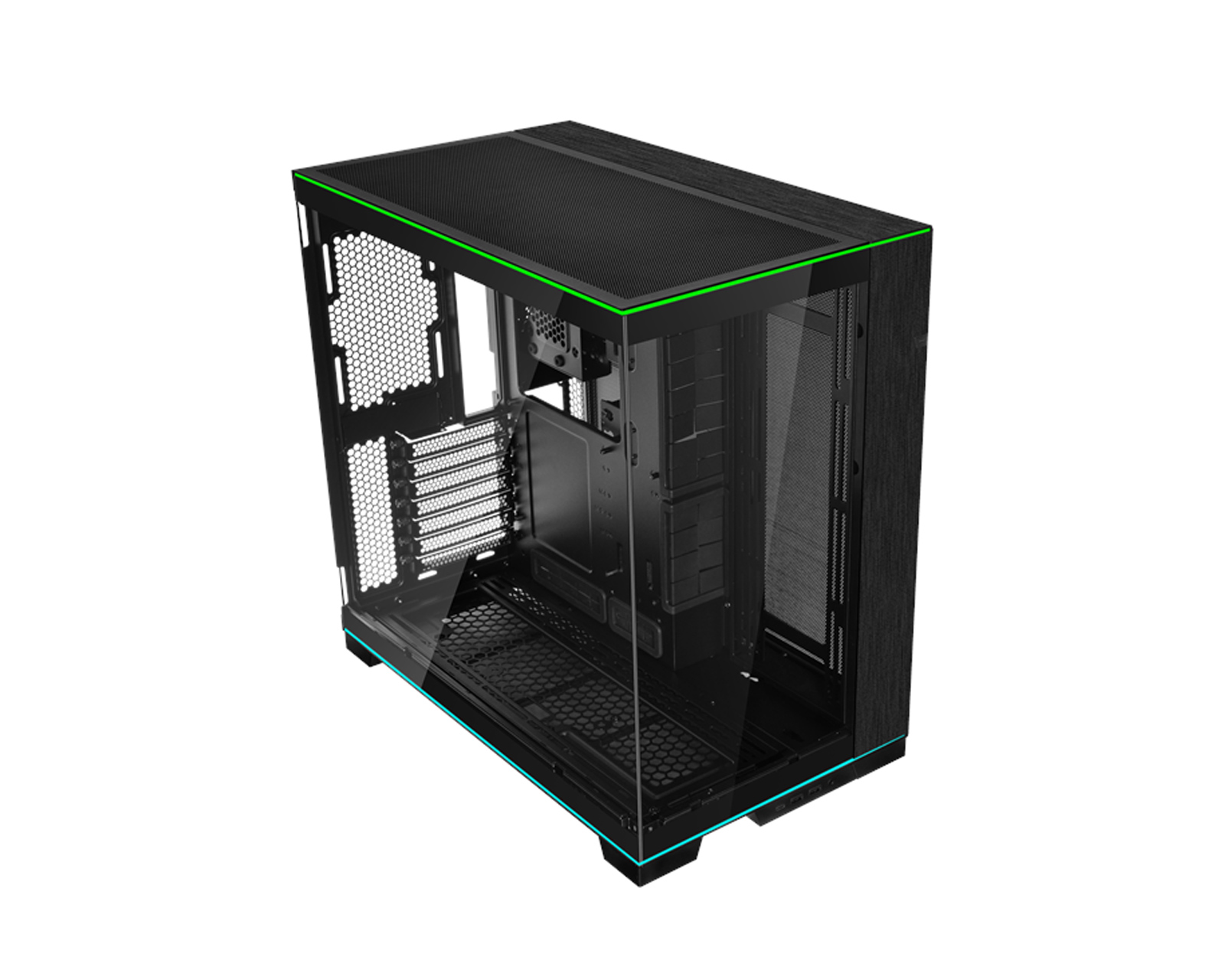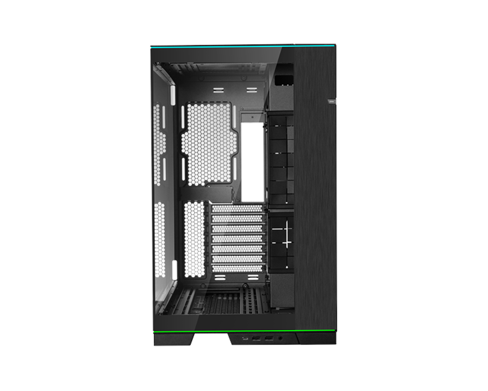 O11D EVO RGB ist ein Gehäuse von Lian Li, das Platz für verschiedene Motherboard-Formate bietet, einschließlich E-ATX, ATX, Micro-ATX und Mini-ITX. Das Gehäuse ist mit einer hochwertigen und leichten Stahlkonstruktion gebaut und hat Front- und Seitenpaneele aus getöntem gehärtetem Glas. Das modulare I/O-Panel umfasst einen USB-C- und zwei USB 3.0-Anschlüsse.Das Gehäuse verfügt über eine einzigartige RGB-Beleuchtung sowohl oben als auch unten, die eine moderne Ästhetik verleiht. Mit dem Reverse Mode kann der Benutzer das Gehäuse umkehren, um die besten Funktionen des Systems zu präsentieren. Es bietet zudem Platz für Grafikkarten mit einer Länge von bis zu 455 mm sowie Unterstützung für leistungsstarke ATX-Netzteile mit einer Länge von bis zu 220 mm. Die Belüftungsmöglichkeiten sind umfangreich, mit Platz für bis zu neun 140 mm oder zehn 120 mm-Lüfter, was eine effektive Kühlung für leistungsstarke Komponenten ermöglicht.