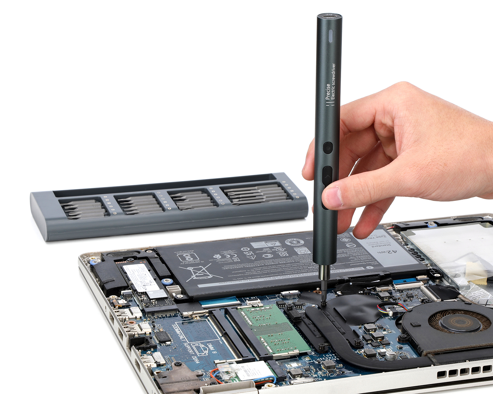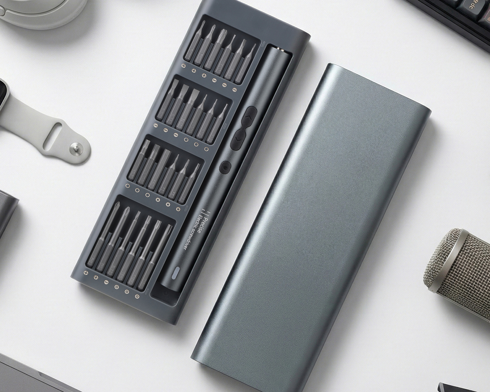 Der elektrische Schraubendreher-Satz von MaxMount bietet eine kompakte und effiziente Lösung für Präzisionsarbeiten in Montage, Service und Reparatur. Der Schraubendreher liefert eine maximale Geschwindigkeit von 200 U/min und wird bequem über USB Type-C aufgeladen. Der 45 mm verlängerte Bit-Halter ermöglicht einen besseren Zugang zu tiefer sitzenden und schwer zugänglichen Schrauben.Mit einem intuitiven Knopfdruck wechseln Sie einfach zwischen manueller und elektrischer Einstellung, was vollständige Kontrolle je nach Arbeitsaufgabe ermöglicht. Der integrierte 3,7 V 350 mAh Akku hält bis zu 350 Schraubvorgänge pro Ladung, was eine hohe Betriebssicherheit bei längeren Arbeitseinsätzen gewährleistet. Das Schrauberset enthält insgesamt 48 hochwertige S2-Bits sowie eine komplette Auswahl an Öffnungswerkzeugen und Zubehör, geliefert in einem strapazierfähigen Metallkasten für den professionellen Einsatz und den einfachen Transport.
