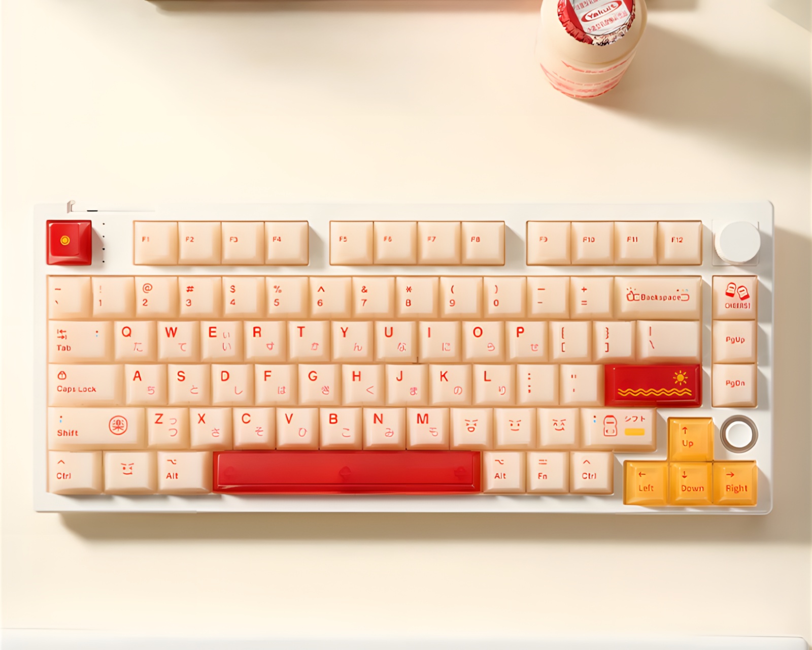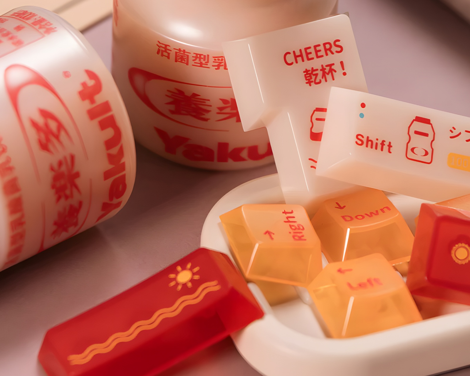 Cheers! Keycap-Set von Keymoji, das eine visuelle nostalgische Reise mit Inspiration aus dem ikonischen probiotischen Getränk Yakult bietet. Mit seiner klassischen milchweißen Flasche, hellgelben und lebhaft roten Details, erzeugt dieses Set eine frische und verspielte Ästhetik, die an fröhliche Erinnerungen an das Schlürfen von Yakult erinnert. Bestehend aus 148 Tasten mit Cherry-Profil und kompatibel mit MX-Schaltern, ist dieses Keycap-Set perfekt für alle Arten von Anwendungen, sei es beim Spielen, Arbeiten oder Lernen.Hergestellt aus hochwertigem PC-Kunststoff, sind diese Keycaps langlebig und widerstandsfähig gegen Abnutzung, was sie für den täglichen Gebrauch in Gaming- oder Büro-Umgebungen geeignet macht. Das farbenfrohe Design mit seinen vereinfachten Mustern, lustigen Symbolen und versteckten Emojis verleiht jeder Taste einen verspielten Charakter, der jeden Tastendruck aufpeichert. Dank des Spritzgussverfahrens ist sichergestellt, dass die Farben lebendig und langlebig bleiben. Diese Keycaps sind nicht nur praktisch, sondern auch ein fantastisches Sammlerstück für jeden Tastaturenliebhaber.