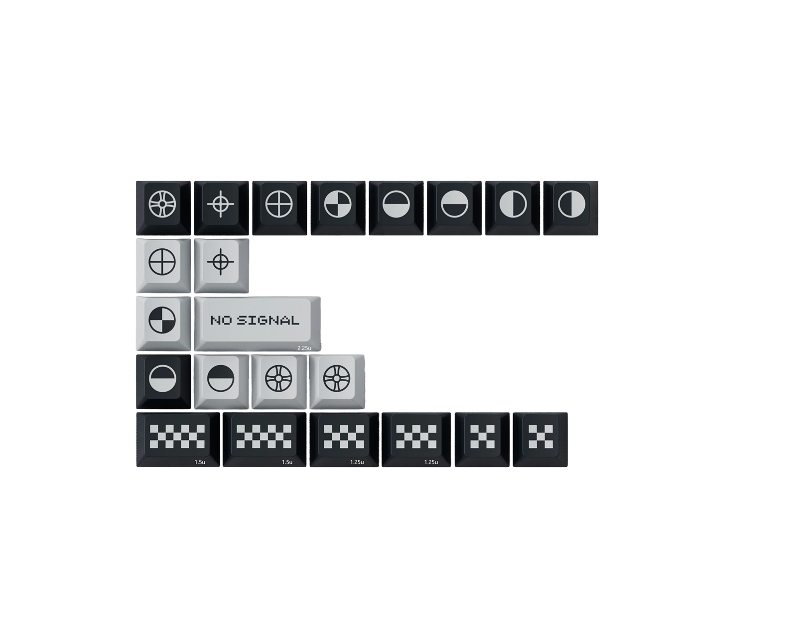 PBTfans No Signal ist ein Novelty-Set von KBDfans, das von elektronisch erzeugten Testmustern inspiriert ist, die historisch zur Kalibrierung von Fernsehern verwendet wurden. Das Set umfasst Tastenkappen aus PBT-Material und ist kompatibel mit Cherry MX-Schaltern sowie Klonen im MX-Stil. Die Hauptelemente des Designs beziehen sich auf ikonische Testmuster wie das Indian-Head-Testmuster und SMPTE-Farben, was der Tastatur eine einzigartige visuelle Ästhetik mit klaren grafischen Elementen verleiht. Bitte beachten Sie, dass nur die Tastenkappen enthalten sind; keine Tastatur ist im Lieferumfang enthalten.Das PBT-Material garantiert Haltbarkeit und Widerstandsfähigkeit gegen Abnutzung, und das Cherry-Profil bietet ein vertrautes Gefühl für die Finger. Die Tastenkappen werden mit der Dye-Sub- und Reverse-Dye-Sub-Methode hergestellt, die sicherstellt, dass das Muster über die Zeit deutlich scharf und beständig bleibt. Sie wird in einem ABS-Tastenkappen-Einsatz mit einem entworfenen Einsatzdeckel geliefert, der die Aufbewahrung und den Schutz der Komponenten erleichtert.