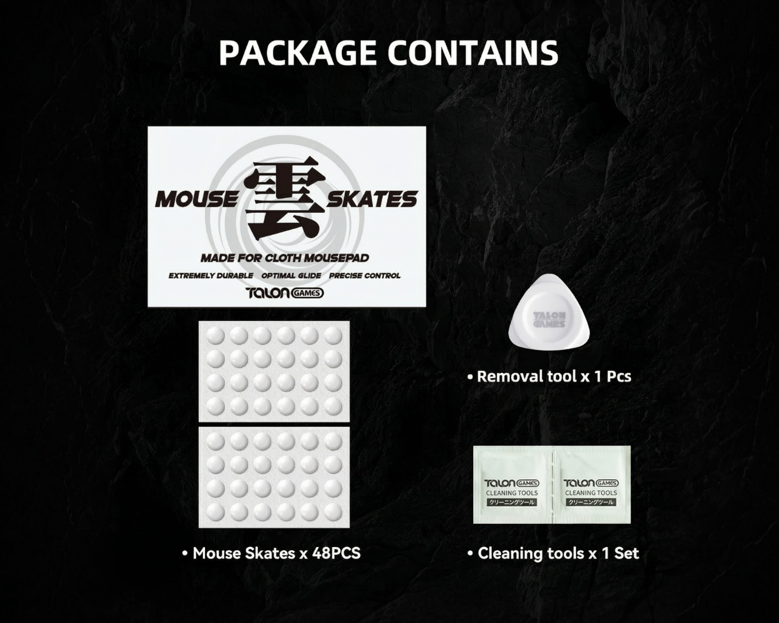 Kumo - Speed Mouse Skates von Talon Games, speziell für die Verwendung auf Stoff-Mausmatten entwickelt. Diese Skates bieten extreme Haltbarkeit und optimale Gleiteigenschaften, die eine präzise Kontrolle während des Spielens gewährleisten. Mit einer Dicke von 0,95±0,05 mm bieten sie eine perfekte Balance zwischen Geschwindigkeit und Stabilität.Das Produkt besteht aus verstärktem PTFE-Material, das eine Strapazierfähigkeit bietet, die die traditionelle PTFE übertrifft, ohne die Gleitleistung zu beeinträchtigen. Die Technologie zur Geräusch- und Vibrationsreduzierung verringert Lärm und Vibrationen beim Gleiten, was die Kontrolle verbessert. Dank des 3M-Klebers sind die Skates leicht zu installieren und zu entfernen, ohne irgendwelche Kratzer oder Rückstände zu hinterlassen. Kumo - Speed Mouse Skates werden mit 48 Skates und Werkzeug für Installation und Reinigung geliefert, was die Wartung der Ausrüstung erleichtert.