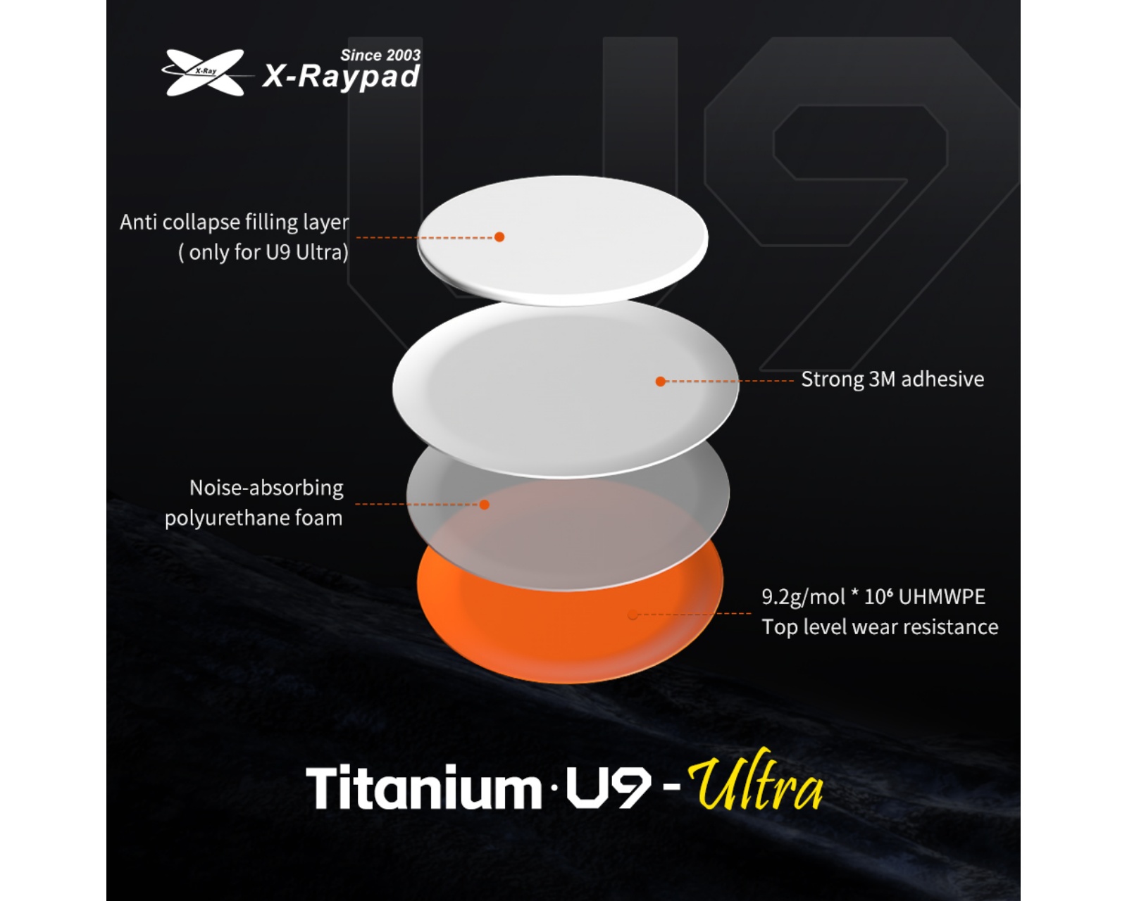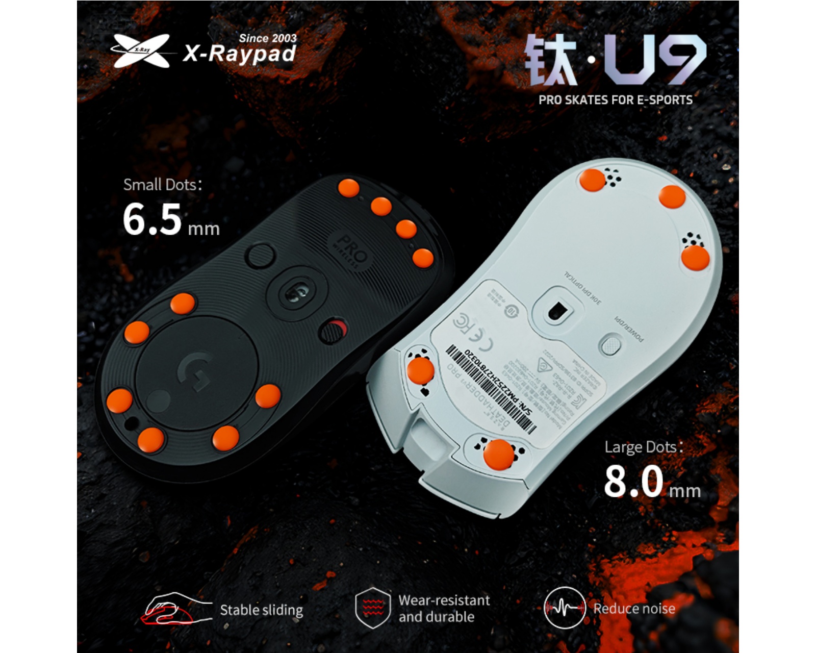 Die U9 Ultra 8mm sind Dot-Skates von X-raypad, die hohe Haltbarkeit mit stabiler Leistung vereinen. Diese Skates sind für Glasoberflächen optimiert und auch mit Stoffmauspads kompatibel. Hergestellt aus ultrahochmolekularem Polyethylen (UHMWPE) in einer mehrschichtigen Konstruktion bieten sie konsistentes Zielen und gewährleisten Zuverlässigkeit bei jeder Bewegung.Das Material ist äußerst strapazierfähig und bietet eine lange Lebensdauer für den Einsatz auf verschiedenen Oberflächen. Die Skates sind so konzipiert, dass sie wackelnde Bewegungen reduzieren und dem Spieler ein stabiles und reibungsloses Erlebnis bieten. Die Mobilität wird durch das sorgfältig ausgearbeitete Design erhöht, das auch eine Schicht zur Geräuschreduzierung enthält, die Gleitgeräusche reduziert und es dem Benutzer ermöglicht, sich besser auf das Spiel zu konzentrieren. U9 Ultra ist speziell für Glasoberflächen geeignet, funktioniert aber auch hervorragend auf Stoffoberflächen.