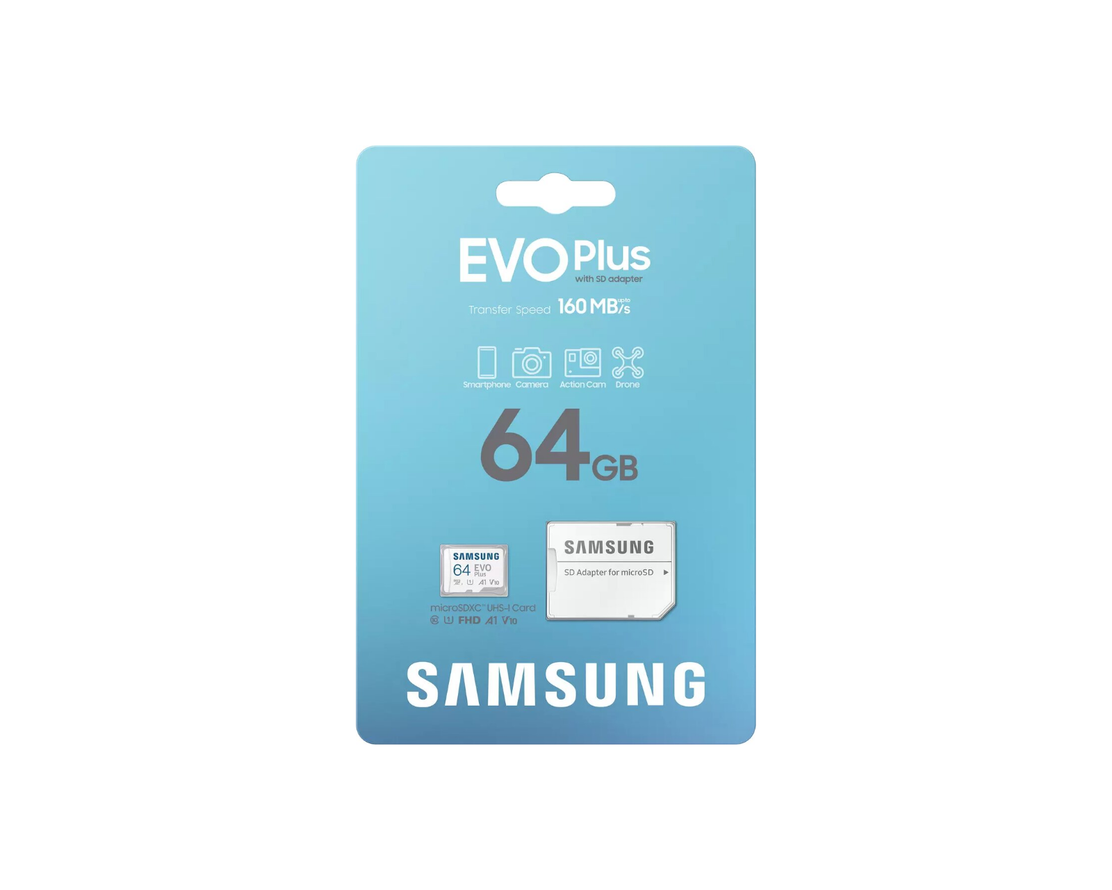 MicroSD EVO Plus 64GB ist eine microSDXC-Speicherkarte von Samsung, die entwickelt wurde, um schnelle und zuverlässige Speicherung zu bieten. Mit einer Kapazität von 64GB eignet sie sich ideal zur Speicherung einer großen Menge an Medien, einschließlich hochauflösender Bilder und 4K-Videos, was ein reibungsloses Benutzererlebnis gewährleistet. Die beeindruckende Übertragungsgeschwindigkeit von bis zu 160 MB/s stellt sicher, dass Dateien schnell und effizient übertragen werden, egal ob Sie sie für Ihr Smartphone, Tablet oder Notebook verwenden.Samsung hat beim EVO Plus Wert auf Bauqualität und Funktionalität gelegt. Die Karte ist mit einer breiten Palette von Geräten kompatibel, was sie zu einer vielseitigen Lösung für Gamer und Multimedia-Enthusiasten macht. Mit U3, Klasse 10-zertifizierten Übertragungsgeschwindigkeiten und einer App-Leistungsbewertung von A2 können Benutzer optimale Leistung bei der Nutzung von Apps und der Wiedergabe von hochwertigen Inhalten erwarten. EVO Plus ist auch für extremes Wetter gerüstet, einschließlich hoher Wasserfestigkeit und Schutz gegen Stöße und magnetische Einflüsse.