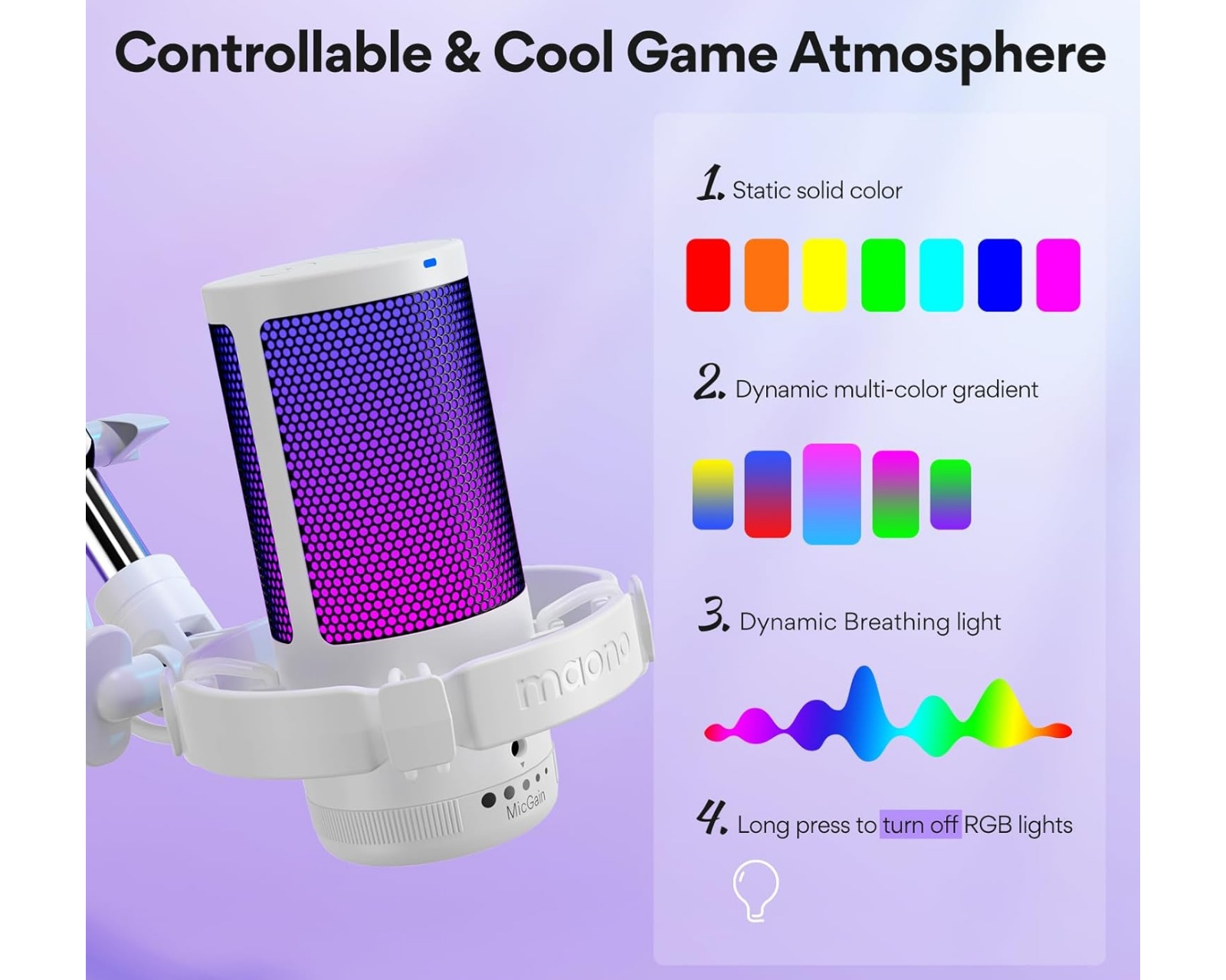 DGM20S ist ein Gaming-Mikrofon von Maono, das Geräuschreduzierung und Echtzeitüberwachung bietet. Es hat eine unidirektionale Polarität, die sich darauf konzentriert, den Schall vor dem Mikrofon einzufangen, was eine bessere Klangqualität und Genauigkeit beim Streaming oder Sprachaufnahmen ermöglicht. Das Mikrofon ist mit RGB-Beleuchtung ausgestattet, die auf neun verschiedene Modi angepasst werden kann, sodass Gamer die Farbe des Lichts an ihre Spielumgebung anpassen können. Das Mikrofon besteht aus langlebigen Materialien und hat eine stabile Konstruktion.Es wird mit einem Metallarm geliefert, der auf unterschiedliche Weise eingestellt werden kann, um zu Ihrer Setup zu passen, sowie mit einer schockabsorbierenden Halterung und einem Popschutz. Es wird über USB und USB-C angeschlossen, was es kompatibel mit Windows, Mac, PS4 und PS5 macht. Eine spezielle Taste zur Stummschaltung und Lautstärkeregelung ermöglicht eine einfache Verwendung während des Streamings oder der Aufnahme. Das Mikrofon ist Plug & Play, was bedeutet, dass es bei der Verbindung sofort einsatzbereit ist.