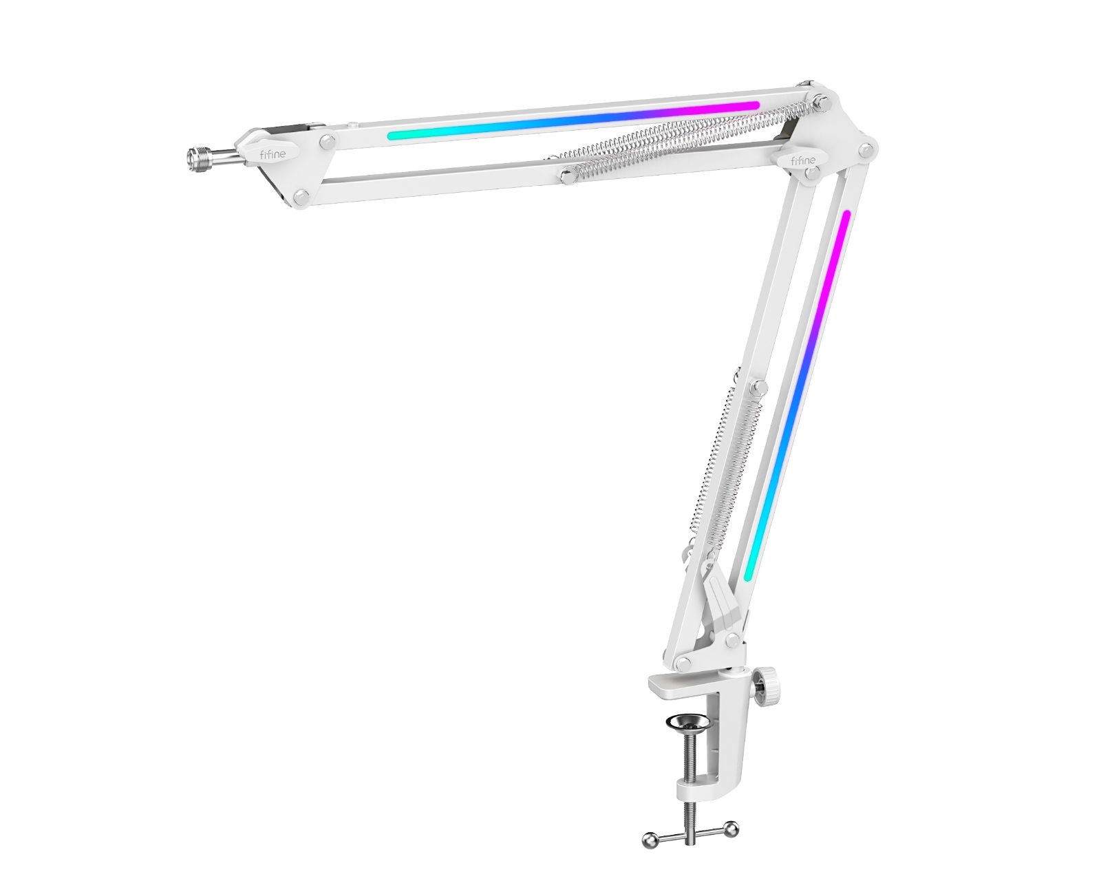 BM38 RGB Metall Mikrofonarm ist ein Mikrofonarm von FIFINE, der eine verstellbare Positionierung und RGB-Beleuchtung für ein verbessertes Benutzererlebnis bietet. Er hat eine Konstruktion aus dickem Stahl, die Stabilität gewährleistet und Mikrofone unterstützt, die bis zu 1,5 kg wiegen. Er richtet sich an Gamer und Podcaster, die nach einer flexiblen und langlebigen Lösung für ihre Mikrofone suchen.Der Mikrofonarm ist aus verstärktem Stahl gefertigt und für den Hochlastbetrieb ohne Stabilitätsverlust konzipiert. Die RGB-Lichter können mit einem Knopf am Arm angepasst werden, wodurch der Benutzer zwischen über neun Farbmodi wechseln kann. Darüber hinaus verfügt der Arm über einen 180° flexiblen Abschnitt und eine 360° schwenkbare Basis, die eine präzise Anpassung der Mikrofonposition ermöglicht. Die Installation erfolgt werkzeuglos und dank einer Silikonpad an der Klemme wird unerwünschter Schaden am Schreibtisch vermieden. Das Produkt ist zudem mit den meisten Mikrofonen durch den beigefügten Schraubadapter für 3/8" und 5/8" kompatibel.