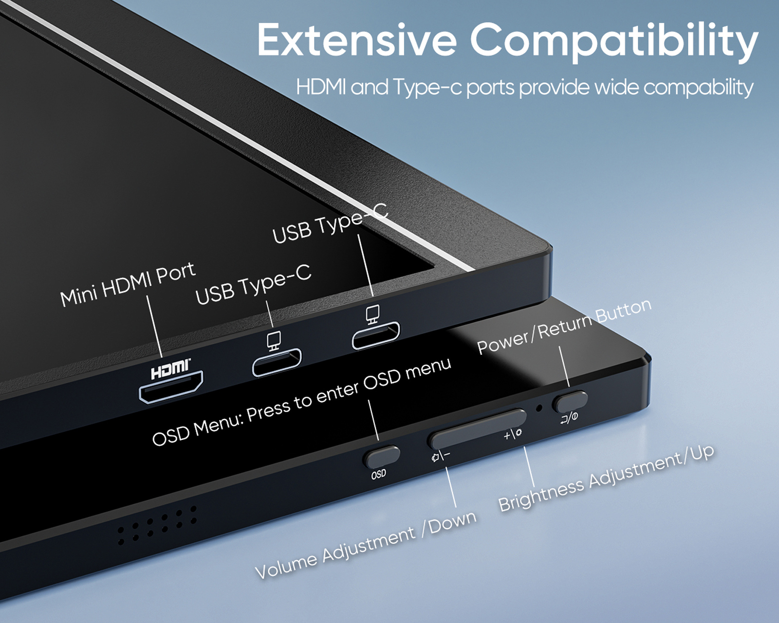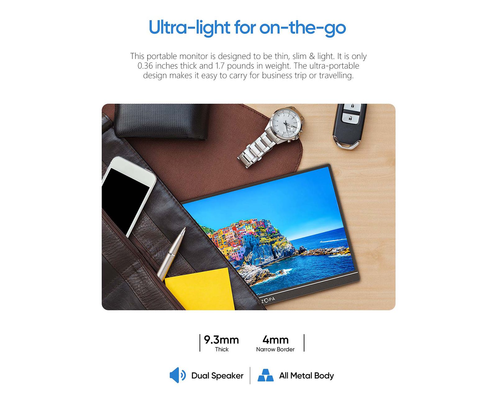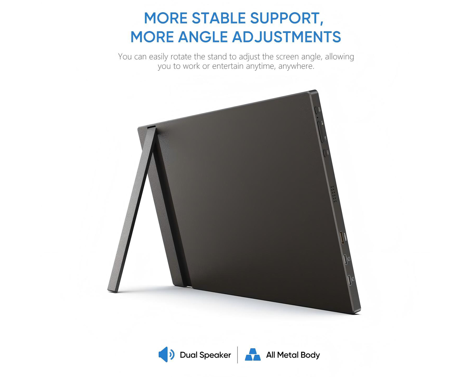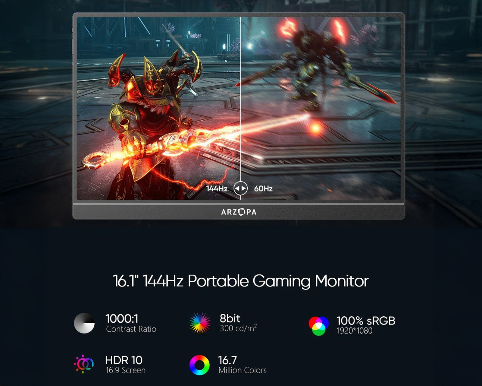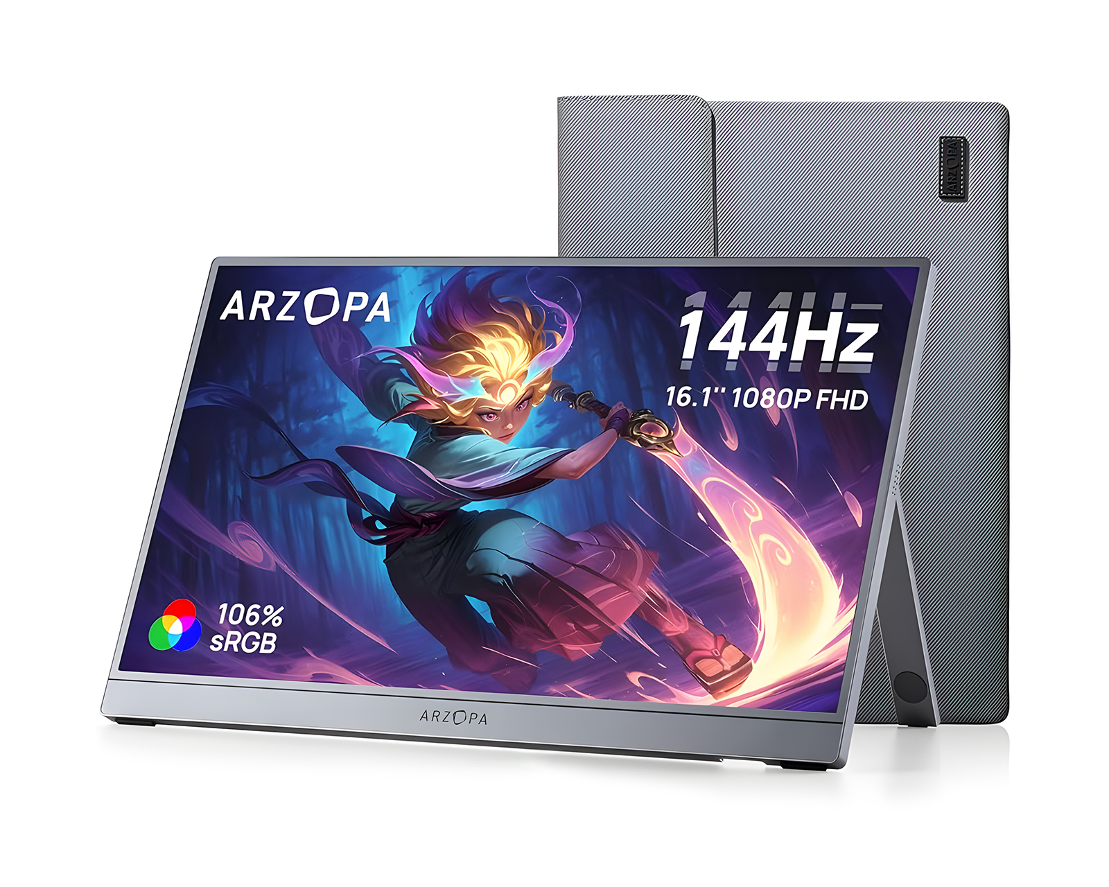 Z1FC 16.1" 144Hz ist ein tragbarer Bildschirm von Arzopa, der eine Full HD-Auflösung von 1920x1080 bietet. Er verfügt über ein IPS-Display mit einer Aktualisierungsrate von 144Hz, was zu schneller und flüssiger Bildwiedergabe führt. Das Produkt richtet sich an Gamer und professionelle Anwender, die zusätzlichen Bildschirmplatz bei der Arbeit oder beim Spielen benötigen.Das Gerät hat eine robuste Aluminiumkonstruktion, die Langlebigkeit und dauerhaften Gebrauch gewährleistet. Es ist mit einem USB Type-C-Anschluss und einem Mini-HDMI-Anschluss ausgestattet, was Verbindungen zu verschiedenen Geräten ermöglicht. Mit einem Kontrastverhältnis von 1200:1 und einer Helligkeit von 300 Nits liefert der Bildschirm klare und farbenfrohe Bilder. Der Bildschirm hat einen Farbumfang von 100 % sRGB, der hohe Farbgenauigkeit gewährleistet. Ein integrierter Kickstand ermöglicht es, den Bildschirm einfach auf den gewünschten Winkel einzustellen. Die HDR-Technik verbessert den Kontrast und den dynamischen Bereich in Bildern, was das Benutzererlebnis weiter verstärkt.