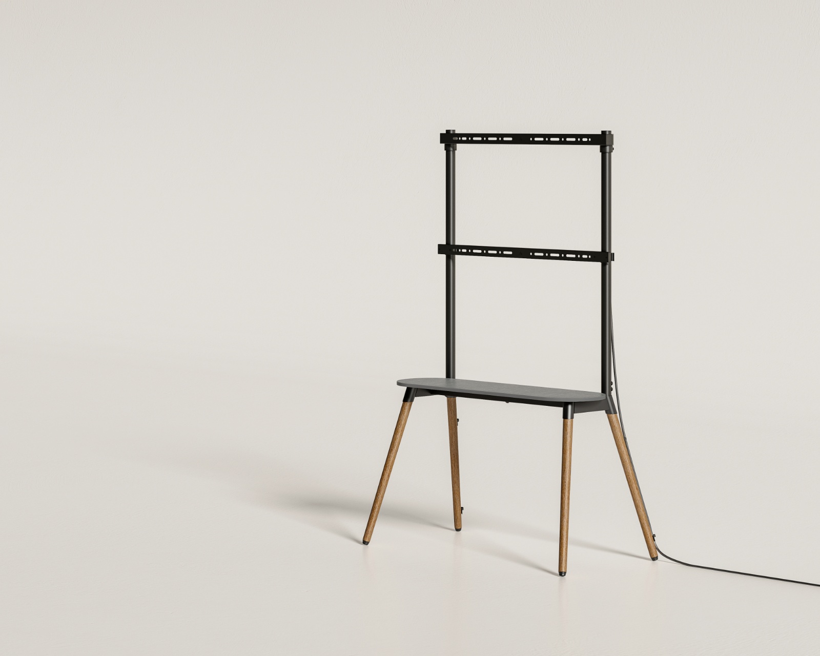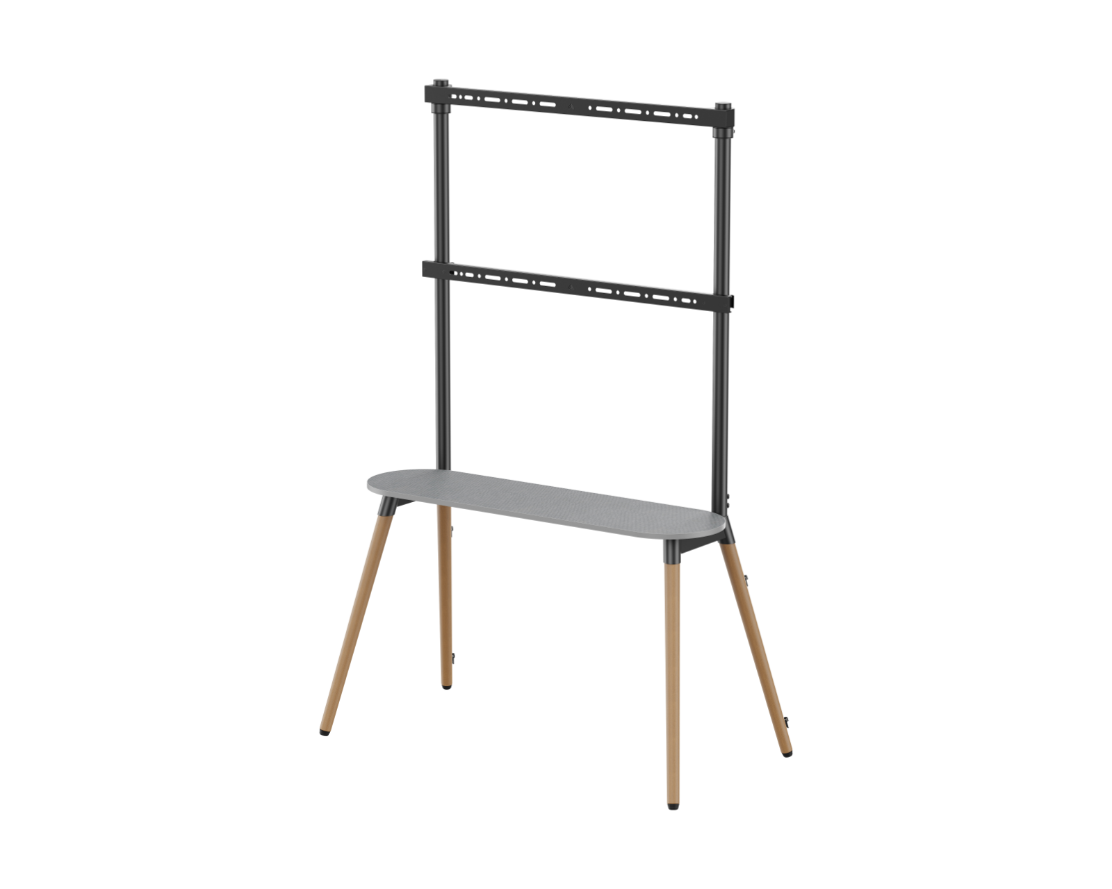 Golvstativ für TV (49"-86") mit Aufbewahrungshylla von MaxMount kombiniert Funktionalität in Form von höhenverstellbarer Höhe und zusätzlichem Stauraum. Das Stativ bietet Unterstützung für Fernseher zwischen 49 und 86 Zoll und ist VESA-kompatibel mit Montagetöpfen bis zu 600x400 mm. Die maximale Tragfähigkeit des Stativs beträgt 50 kg, was es für verschiedene Arten von Fernsehern geeignet macht.Die Materialauswahl für das Stativ umfasst Stahl, Spanplatte und Melamin, mit einer Oberflächenbeschichtung aus Pulverbeschichtung. Es ist so konzipiert, dass es stabil und robust ist, und es verfügt über schützende Pads, um Kratzer zu vermeiden und eine stabile Basis zu bieten. Um Kabel organisiert zu halten, beinhaltet es auch ein Kabelmanagementsystem, das das Benutzererlebnis weiter verbessert. Das Stativ verfügt auch über ein Ablagefach mit einer Kapazität von bis zu 10 kg für zusätzliches Zubehör, was es funktioneller im Zuhause oder Büro macht.