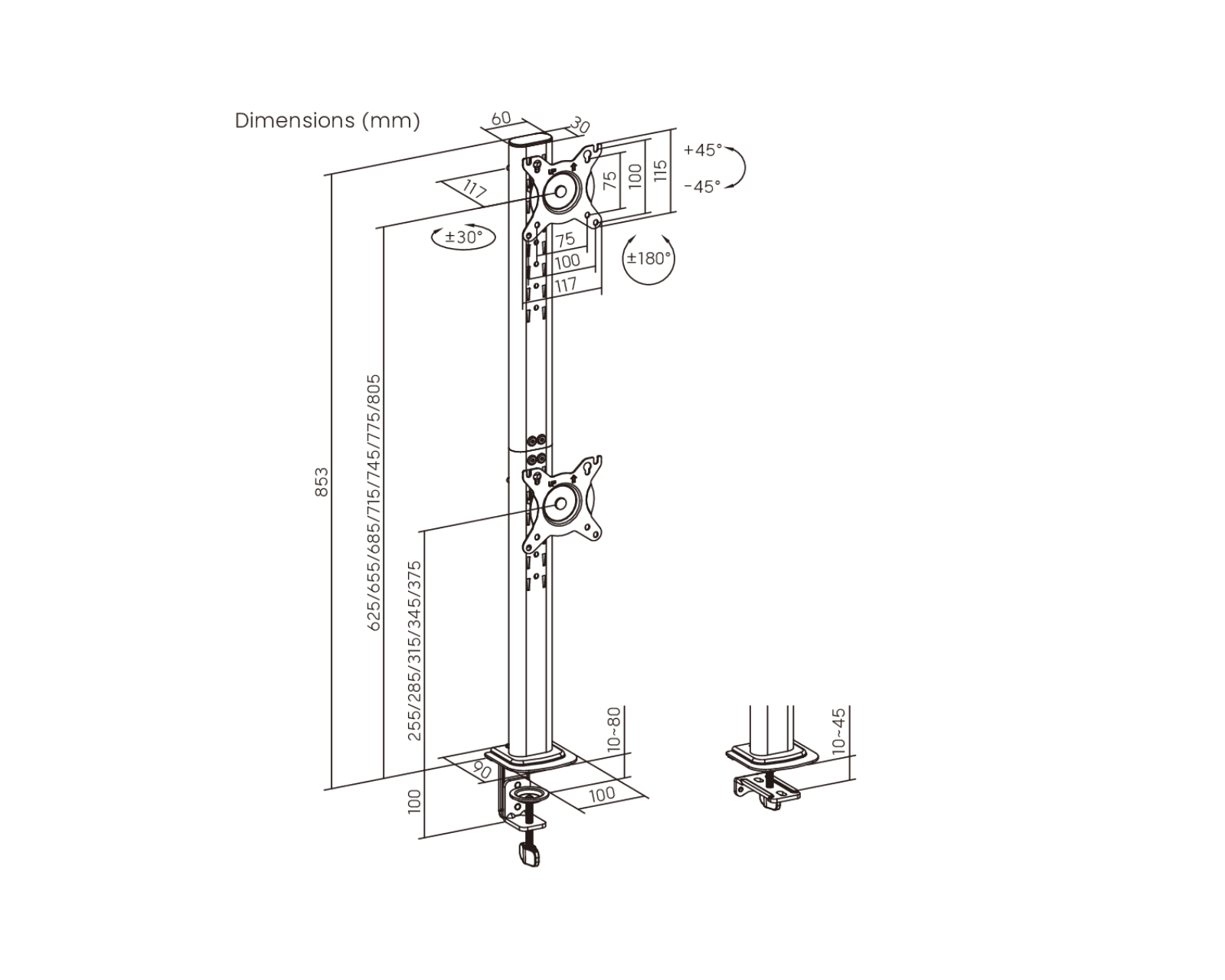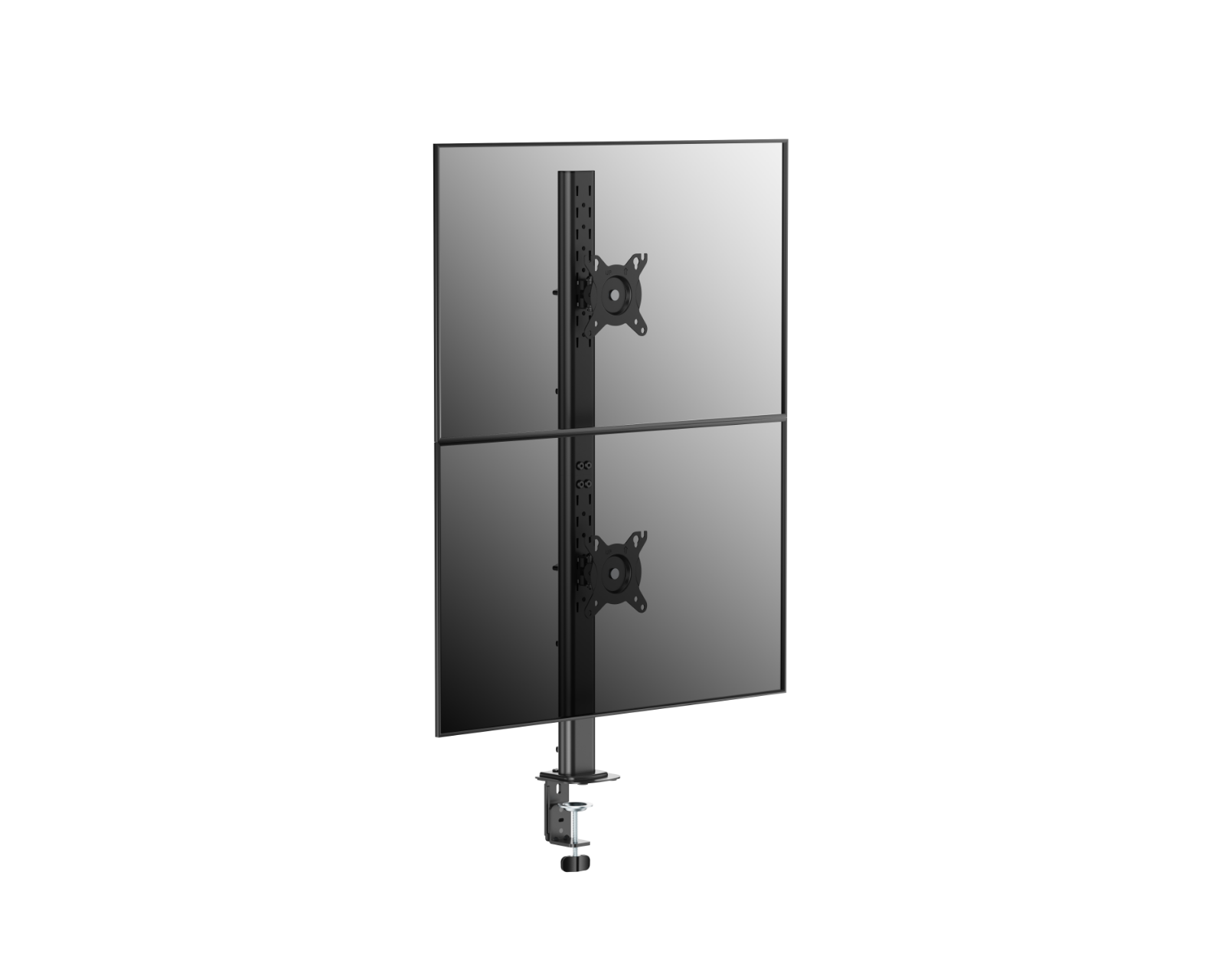 MaxMount Vertikal Tischständer für 2 Monitore 17"-34" 12 kg ist eine robuste Lösung von MaxMount, entworfen für Gamer und professionelle Anwender, die eine optimale Bildschirmfläche benötigen. Dieser Tischständer ermöglicht die Platzierung von zwei Monitoren auf vertikale Weise, was eine ergonomische Arbeitsfläche bietet und wertvollen Platz auf dem Schreibtisch freigibt. Das Stativ unterstützt Monitore mit einem maximalen Gewicht von 12 kg und hat VESA-Befestigungen für sowohl 75x75 mm als auch 100x100 mm.Das vertikale Stativ ist aus robustem Stahl gefertigt und bietet umfangreiche Anpassungsmöglichkeiten, einschließlich Neigung bis zu +45°/-45°, Schwenkbereich von +30°/-30° und 360° Drehung, um einfach zwischen Quer- und Hochformat zu wechseln. Mit werkzeugfreier Installation sind keine zusätzlichen Zubehörteile erforderlich, was es einfacher macht, die perfekte Position für jeden Monitor zu finden. Das Kabelmanagement wird mit den mitgelieferten Kabelclips ordentlich gehalten, was zu einer sauberen und professionellen Einrichtung beiträgt. Dank der kompakten Verpackungsgröße ist dies auch eine umweltfreundlichere Wahl für E-Commerce-Kunden.