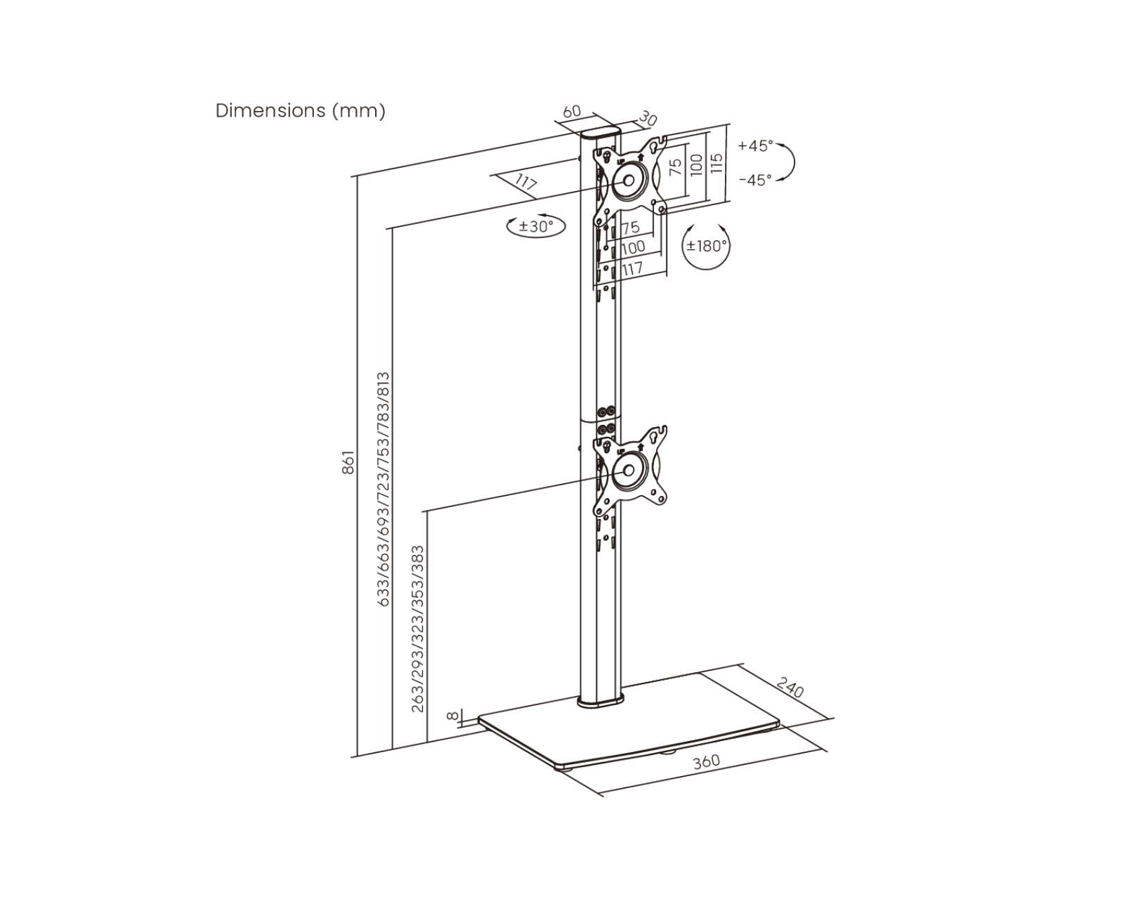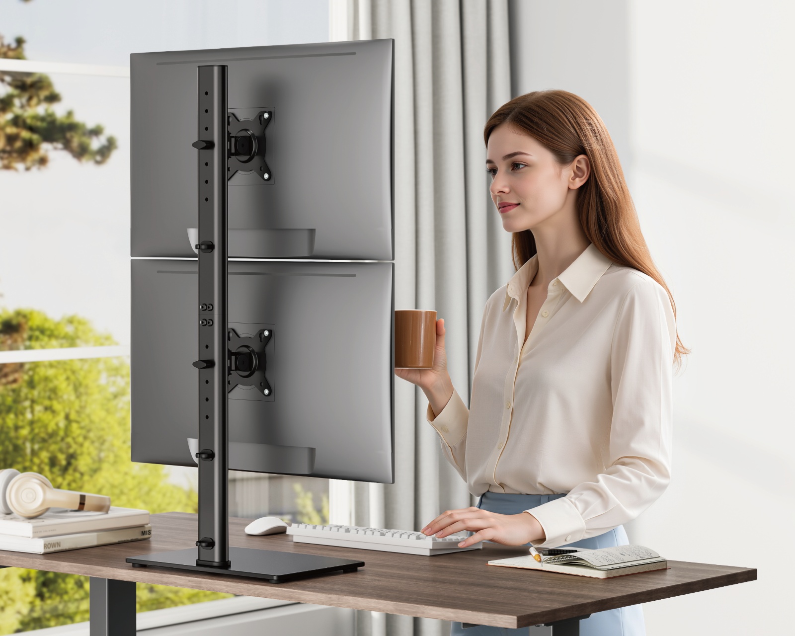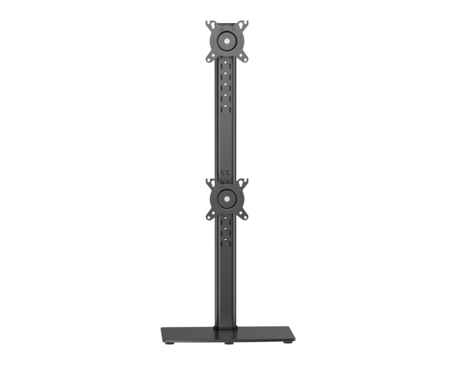 Vertikales Bildschirmstativ für 2 Bildschirme 17"-34" 12 kg - Schwarz ist eine Bildschirmhalterung von MaxMount, die entwickelt wurde, um zwei Bildschirme mit einer Tragfähigkeit von bis zu 12 kg pro Bildschirm zu unterstützen. Dieses Stativ bietet eine kompakte und stabile Konstruktion mit einem eleganten Aussehen, dank des Fußes aus gehärtetem Glas. Die Stative verfügen außerdem über mehrere Höhenverstellungen, die es ermöglichen, sich an verschiedene Arbeitsumgebungen und Benutzerpräferenzen anzupassen. Dank des werkzeuglosen Neigungssystems kann der Bildschirm einfach zwischen +45° und -45° eingestellt werden, was dem Benutzer einen optimalen Betrachtungswinkel bietet.Die Bauqualität des vertikalen Bildschirmstativs ist hoch, mit Materialien aus Kunststoff und Stahl, die sowohl Haltbarkeit als auch Stabilität bieten. Die VESA-Kompatibilität (75x75 und 100x100) erleichtert die Befestigung der Bildschirme, und die 360° drehbare Platte bietet Flexibilität bei der Nutzung. Das Stativ ist sowohl für Gamer als auch für Büroarbeiten konzipiert, was bedeutet, dass es Funktionalität mit Stil kombiniert. Das Kabelmanagementsystem sorgt dafür, dass Kabel ordentlich gehalten werden, was eine saubere und effiziente Arbeitsfläche schafft. Darüber hinaus wird die Stabilität durch die große Basis gewährleistet, sodass das Gerät unabhängig von der Einstellung nicht umkippt.