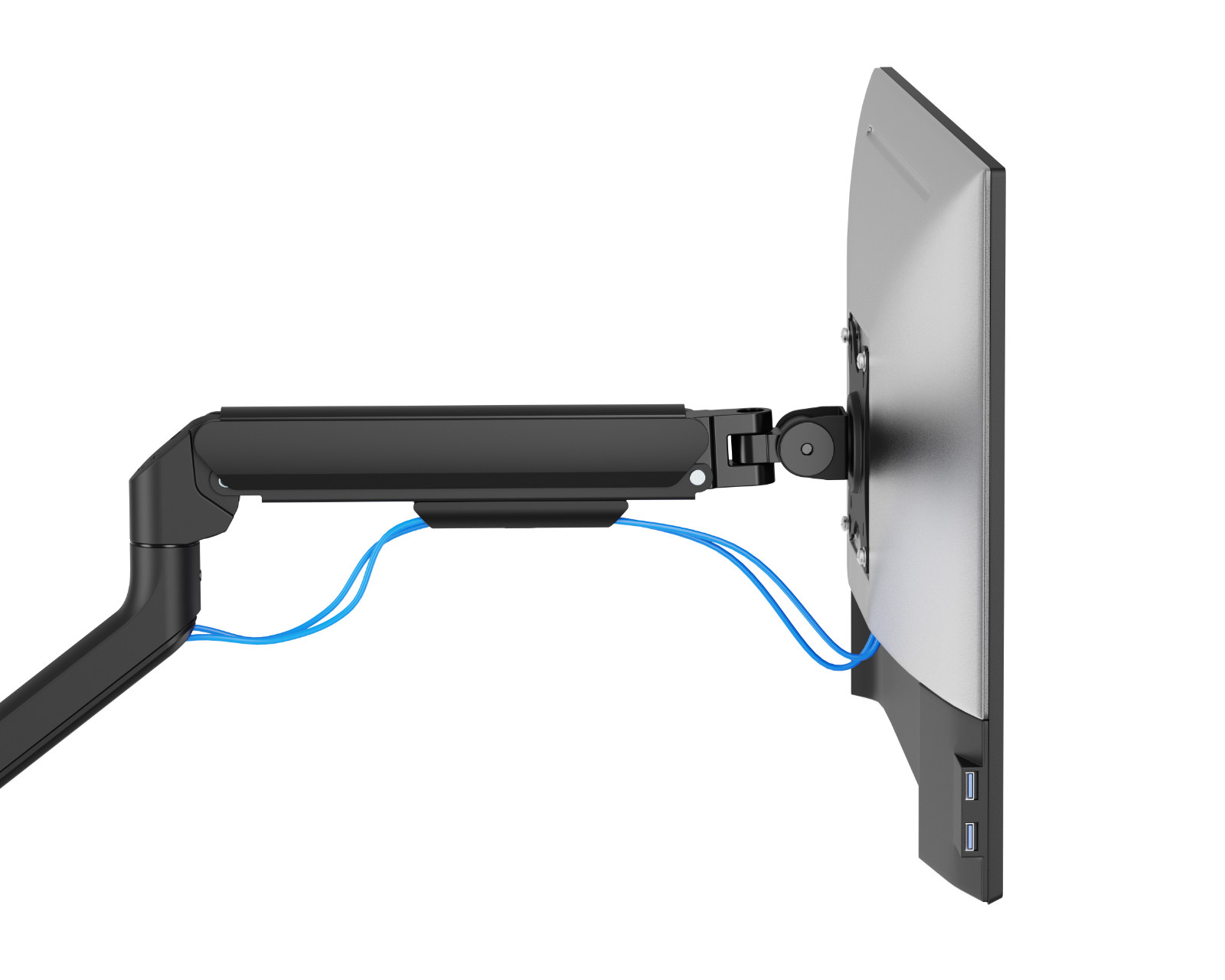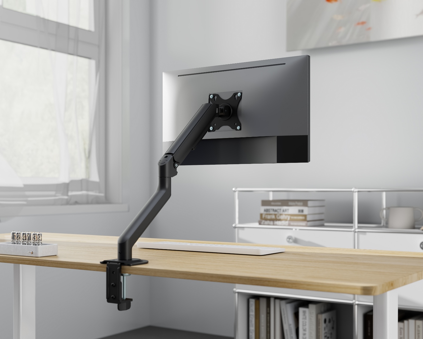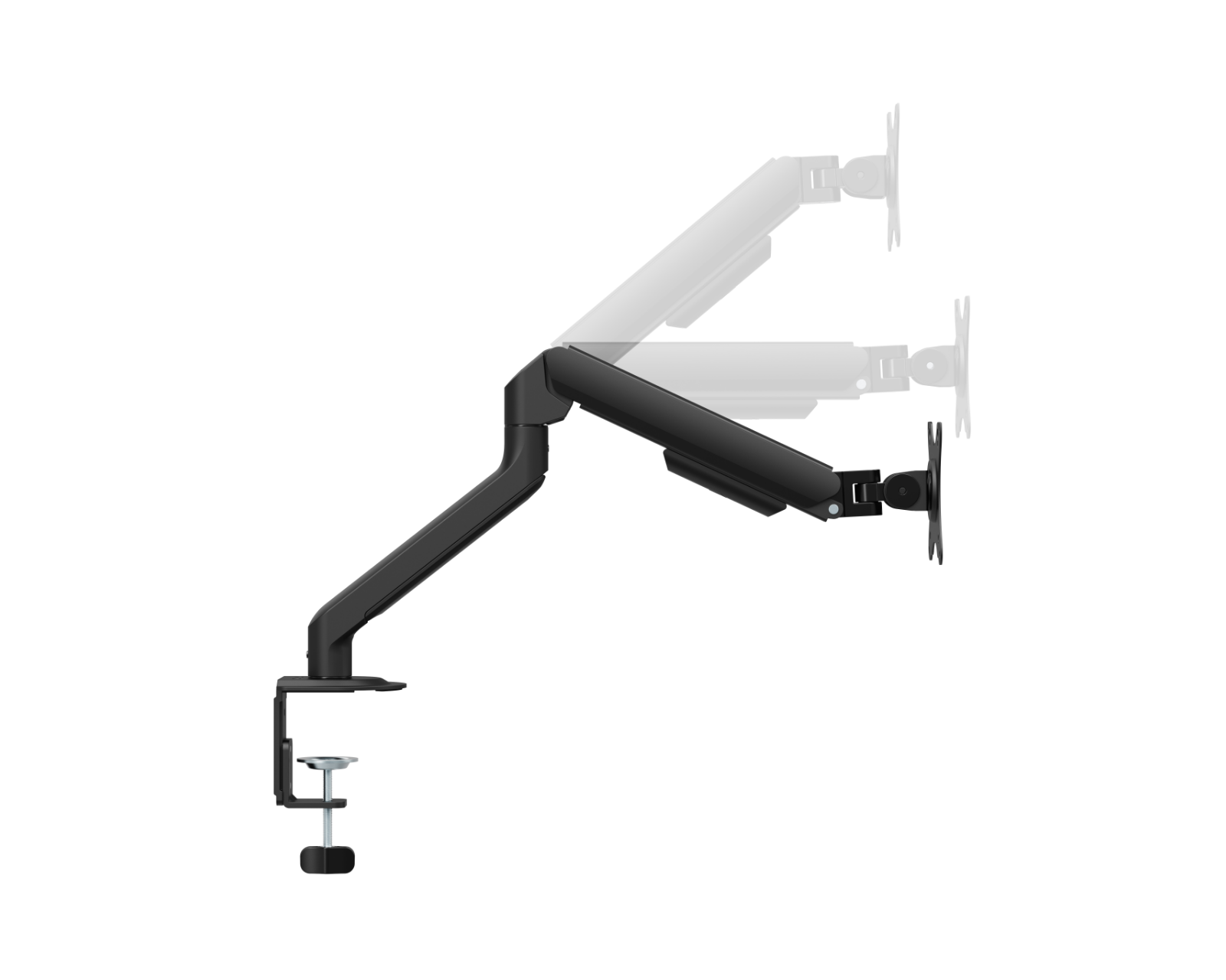 Skärmständer mit mechanischer Feder von MaxMount, der Monitore zwischen 17" und 32" mit einem Maximalgewicht von 9 kg unterstützt. Dieser Arm bietet eine einfache und flexible Einstellung des Monitors dank einer integrierten Federung, die die Handhabung erleichtert. Um die Installation zu vereinfachen, ist die Befestigungsplatte mit einem Schlüssellochmuster und einer Schnellverschlussfunktion ausgestattet. Der Monitorarm ist so gestaltet, dass er Kabel effektiv verwaltet und zu einem organisierten Arbeitsplatz beiträgt.Die Konstruktion des Arms ermöglicht eine große Bewegungsfreiheit für den Monitor. Er kann geneigt, geschwenkt und rotiert werden, was es ermöglicht, die Höhe und den Winkel des Monitors für optimale Sicht anzupassen. Dieser Monitorarm ist mit zwei Montagemöglichkeiten erhältlich: sowohl eine Schreibtischklemme als auch eine Durchführungsöffnung sind im Lieferumfang enthalten, was ihn an verschiedene Schreibtischtypen anpassbar macht. Darüber hinaus sorgt das integrierte Kabelmanagementsystem für einen ordentlichen und sauberen Arbeitsplatz.