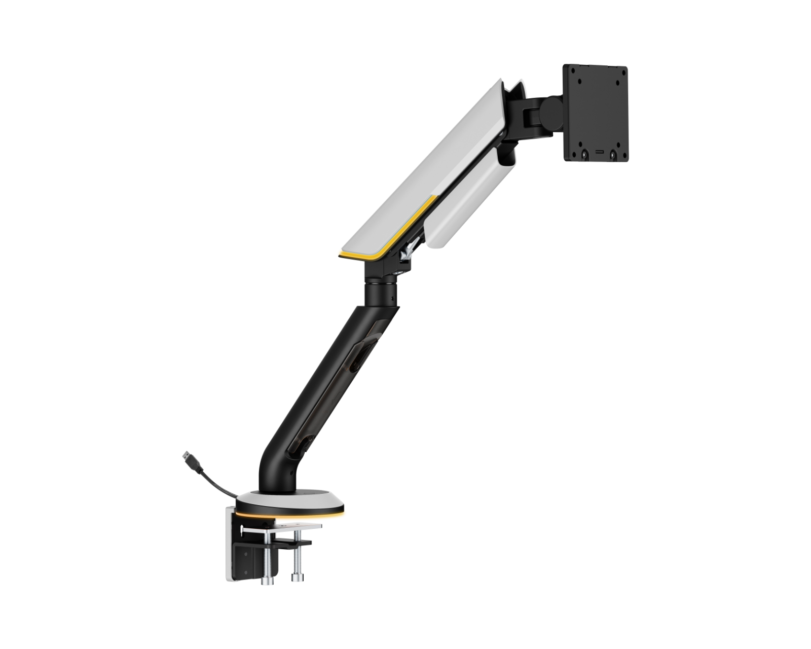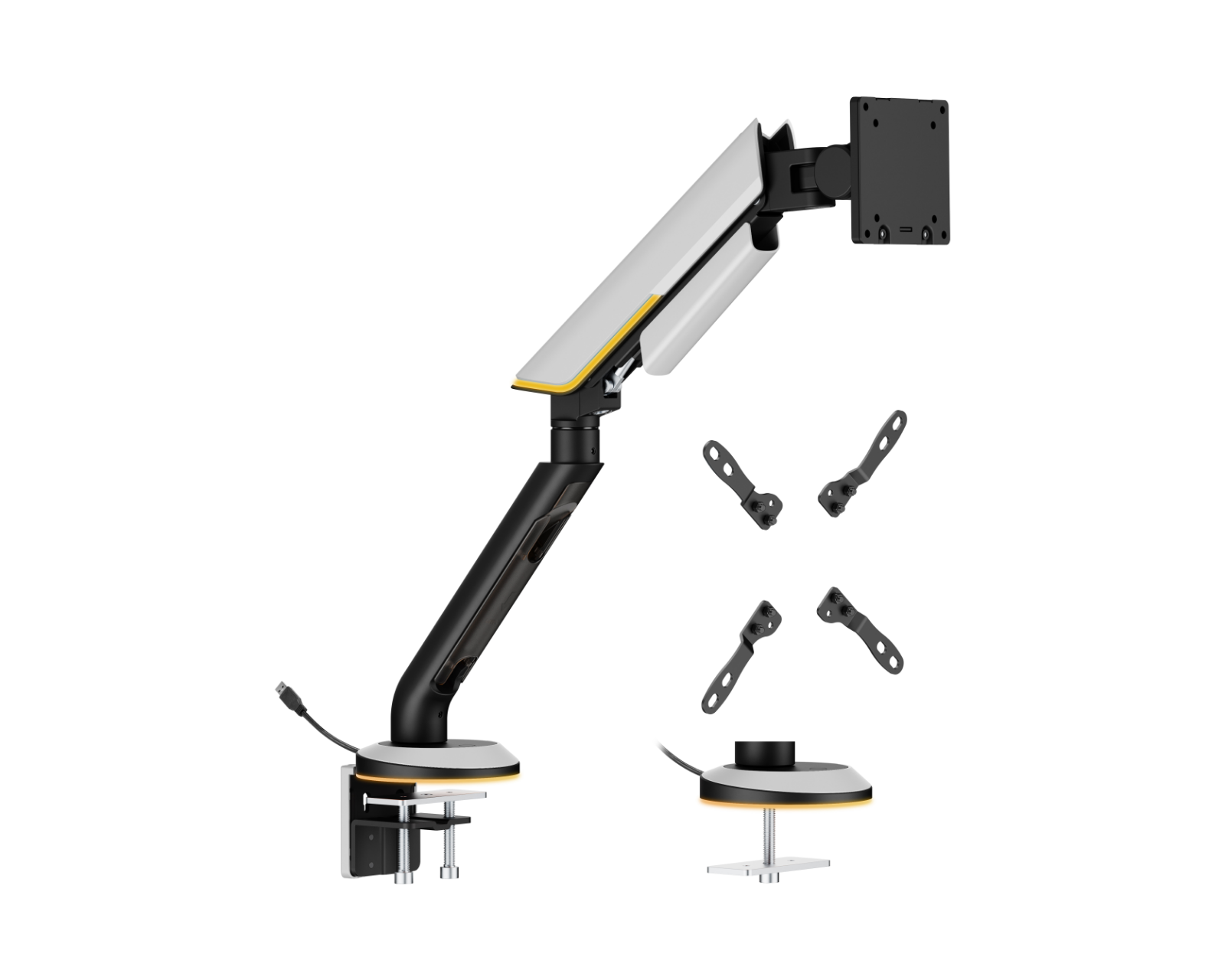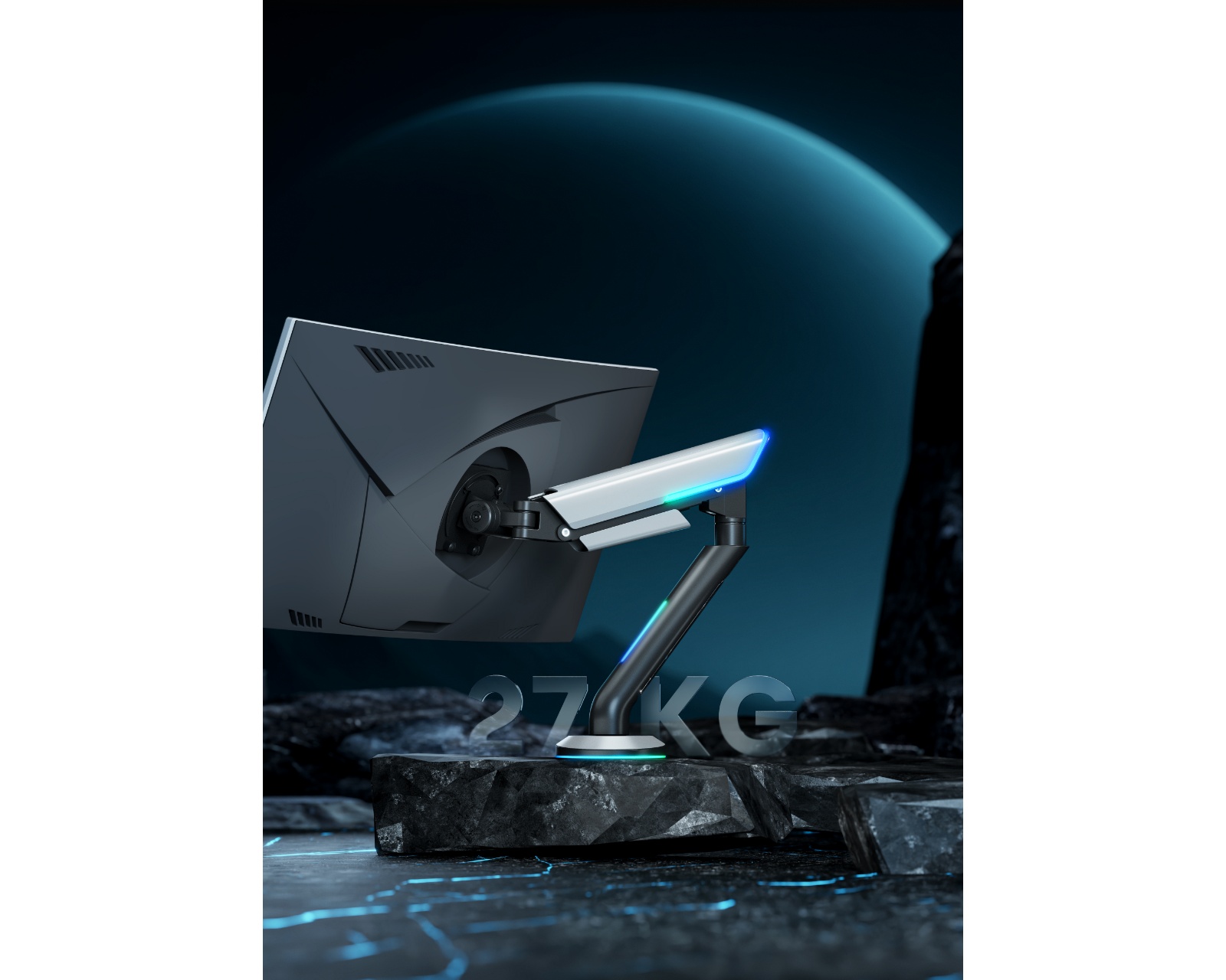 Titan Schwerlast-Gasfeder RGB-Beleuchtung Monitorarm ist ein Bildschirmstand von MaxMount, der massive Bildschirme bis zu 57 Zoll und 27 kg unterstützt. Dieser Arm bietet eine stabile Plattform für optimal positionierte Bildschirme und verfügt über eine Reihe von Einstellmöglichkeiten zur Verbesserung des Nutzungserlebnisses. Ausgestattet mit 20 dynamischen RGB-Beleuchtungsmodi schafft er eine individuelle Spielatmosphäre.Die Montage wird über eine Schnellverbindung mit der VESA-Platte sichergestellt, was auch die Installation und Abnahme des Bildschirms erleichtert. Die Konstruktion des Arms gewährleistet Stabilität und Sicherheit auch für größere Bildschirme. Das Design des Arms umfasst einen eingebauten Federmechanismus, der genaue Anpassungen von Gewicht und Bewegung ermöglicht. Er ermöglicht die Bildschirmnutzung durch Neigen, Schwenken, Drehen und Höhenverstellung, um den Anforderungen des Nutzers gerecht zu werden. Die Montageoptionen umfassen sowohl Tischklemmen als auch Durchführungen für eine flexible Installation. Die VESA-Unterstützung reicht bis zu 200x200 über den mitgelieferten Adapter, was die Verwendung einer Vielzahl von Bildschirmformaten ermöglicht.