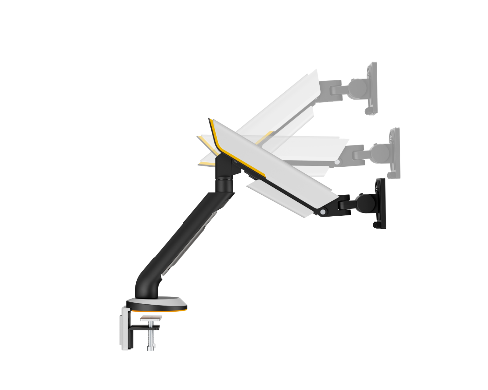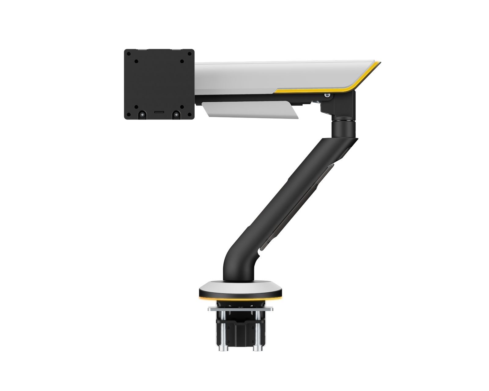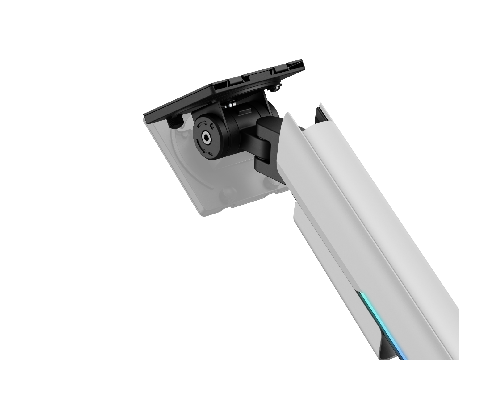 Titan Schwerlast-Gasfeder RGB-Beleuchtung Monitorarm ist ein Bildschirmstand von MaxMount, der massive Bildschirme bis zu 57 Zoll und 27 kg unterstützt. Dieser Arm bietet eine stabile Plattform für optimal positionierte Bildschirme und verfügt über eine Reihe von Einstellmöglichkeiten zur Verbesserung des Nutzungserlebnisses. Ausgestattet mit 20 dynamischen RGB-Beleuchtungsmodi schafft er eine individuelle Spielatmosphäre.Die Montage wird über eine Schnellverbindung mit der VESA-Platte sichergestellt, was auch die Installation und Abnahme des Bildschirms erleichtert. Die Konstruktion des Arms gewährleistet Stabilität und Sicherheit auch für größere Bildschirme. Das Design des Arms umfasst einen eingebauten Federmechanismus, der genaue Anpassungen von Gewicht und Bewegung ermöglicht. Er ermöglicht die Bildschirmnutzung durch Neigen, Schwenken, Drehen und Höhenverstellung, um den Anforderungen des Nutzers gerecht zu werden. Die Montageoptionen umfassen sowohl Tischklemmen als auch Durchführungen für eine flexible Installation. Die VESA-Unterstützung reicht bis zu 200x200 über den mitgelieferten Adapter, was die Verwendung einer Vielzahl von Bildschirmformaten ermöglicht.